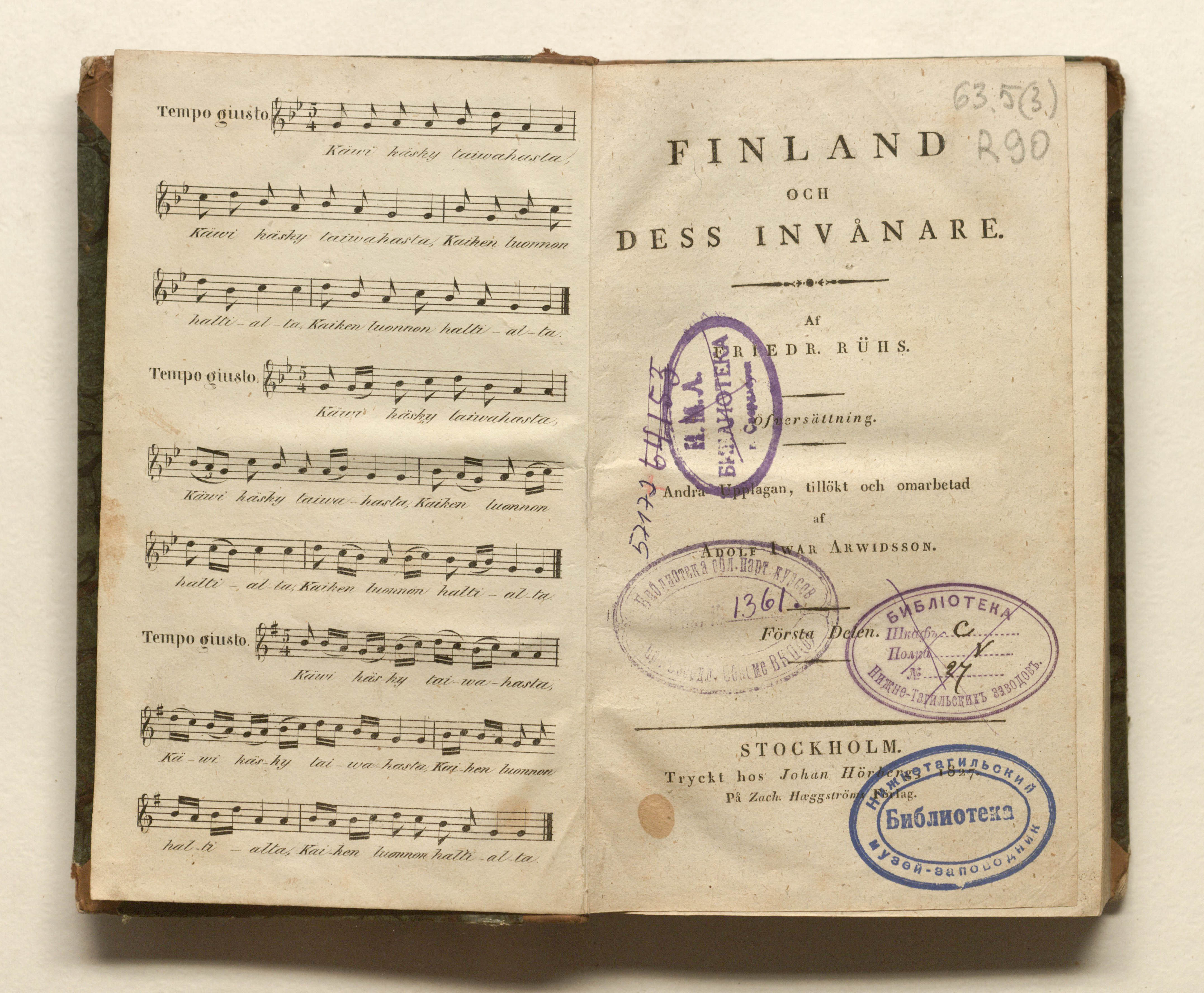 Финляндия и ее жители / Фридр. Рюса. Перевод. Издание второе, переработанное и дополненное Адольфом Иваром Арвидссоном. – Т. 1-2. - Стокгольм : Хёрберг, 1827. - XII, 180; 216, [2] с.; 11x18,5 см.