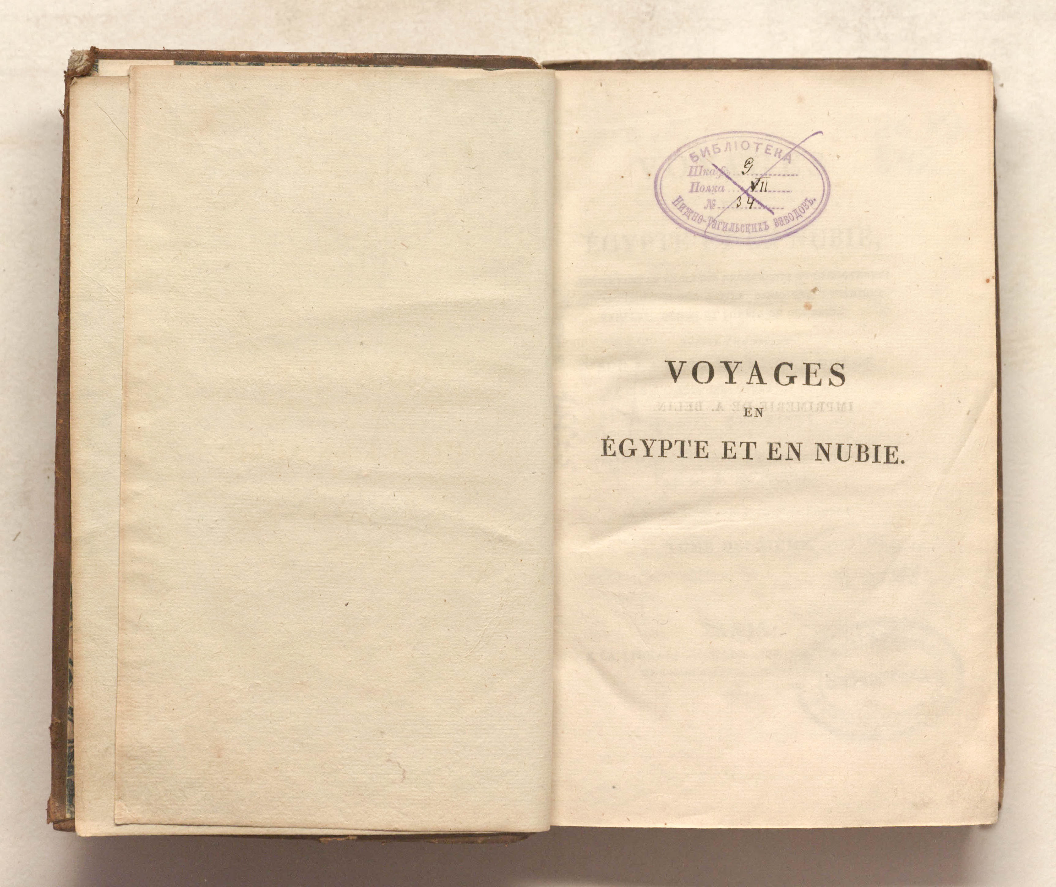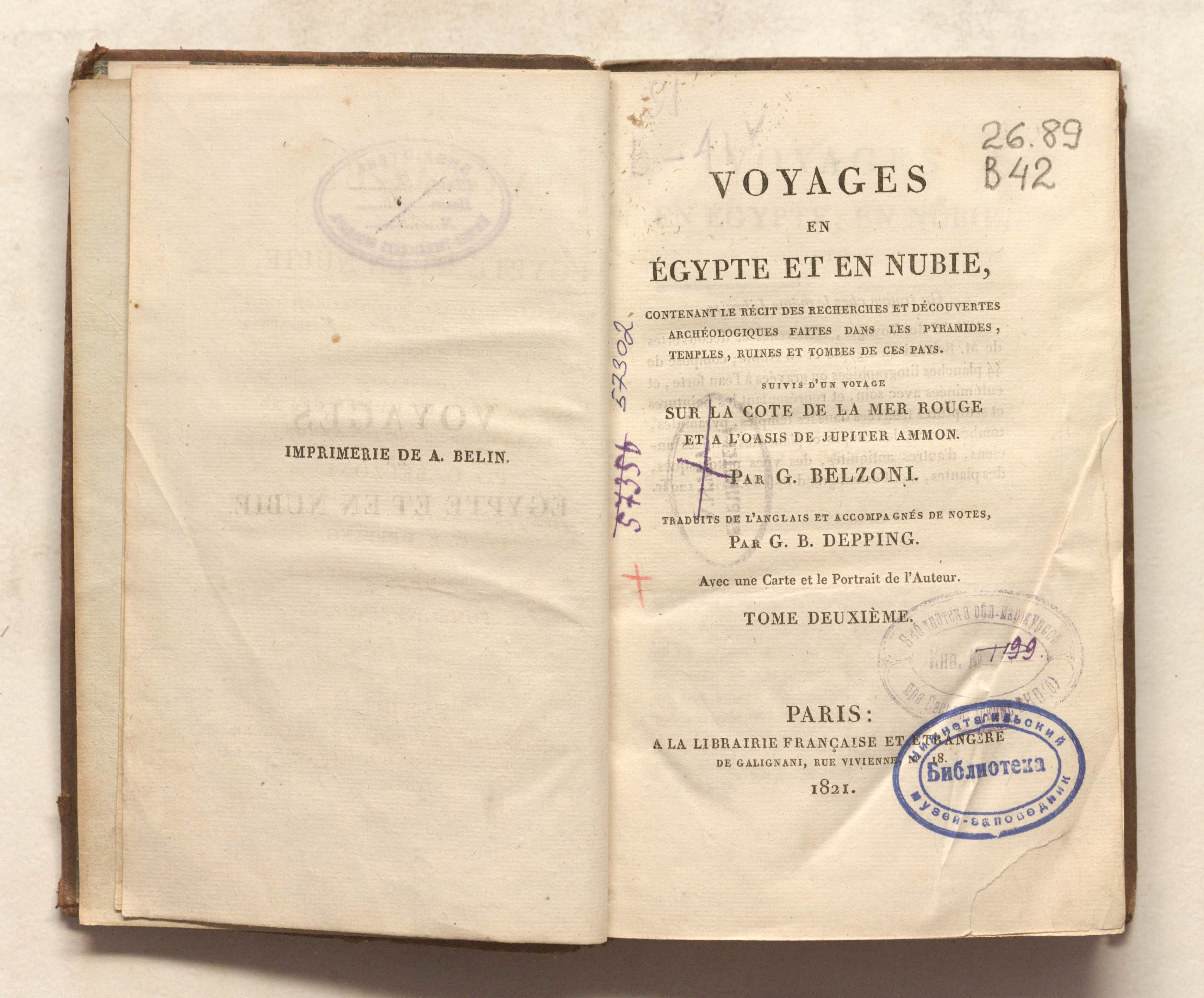 Voyages en Egypte et en Nubie, contenant le recit des recherches et decouvertes archeologiques faites dans les Pyramides, temples, ruines et tombes de ces pays ; suivis d'un voyage sur la cote de la Mer Rouge et a l'Oasis de Jupiter Ammon…. Traduits de l'anglais et accompagnés de notes par G. B. Depping, avec une carte et le portrait de l'auteur.  – 2 t. – Т. 2. – Paris : Librairie francaise et etrangere, 1821. - 350, [1] p. : carte. ; 13,5x20,5 cm.