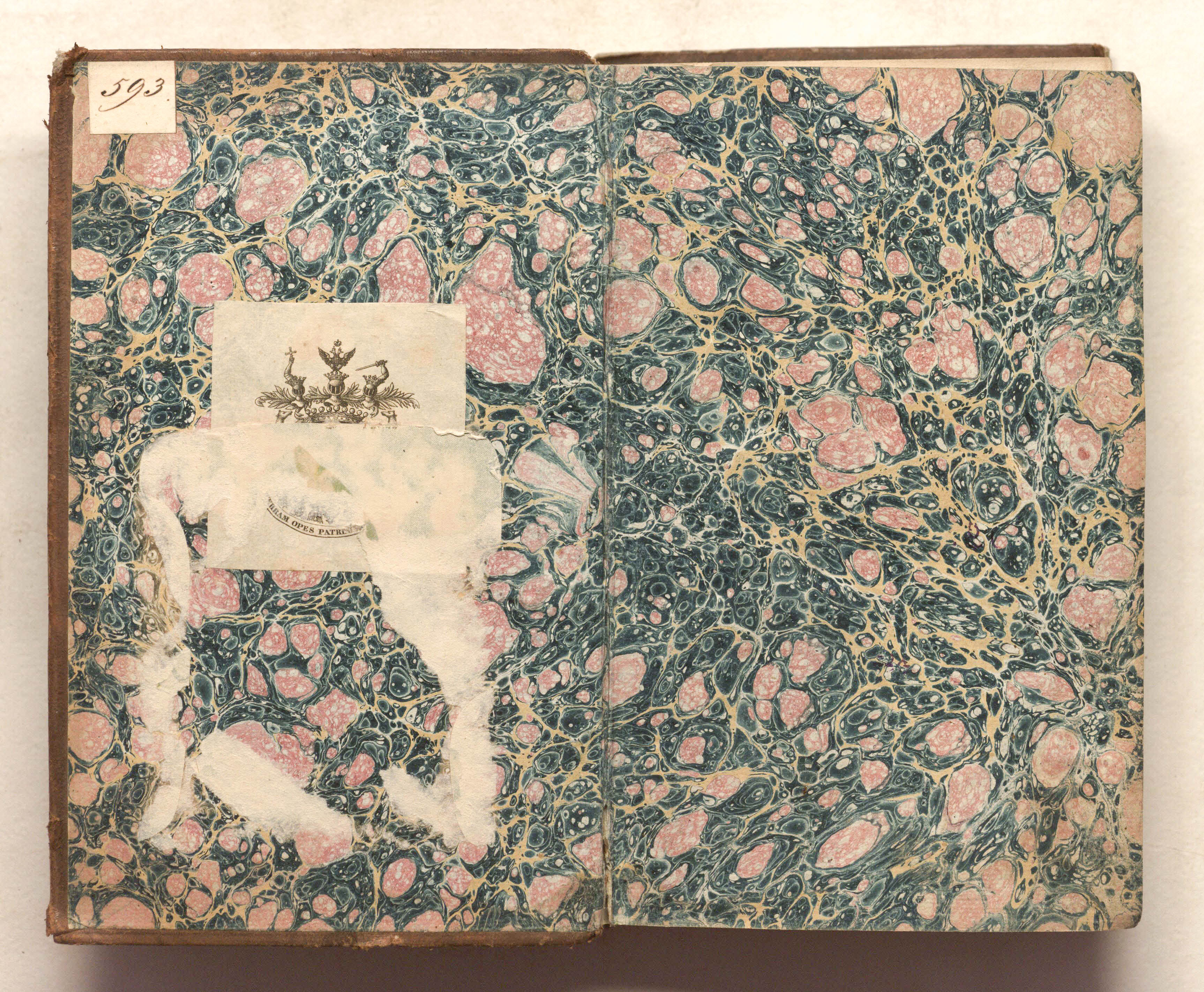 На переднем форзаце наклеен бумажный ярлык - родовой герб размером 5,7х6 см, гравюра на металле с изображением герба с графской короной и девизом. Частично экслибрис был заклеен библиотечным кармашком, поэтому плохо просматривается. Предположительно, экслибрис принадлежит графу Григорию Александровичу Строганову (1770-1857).