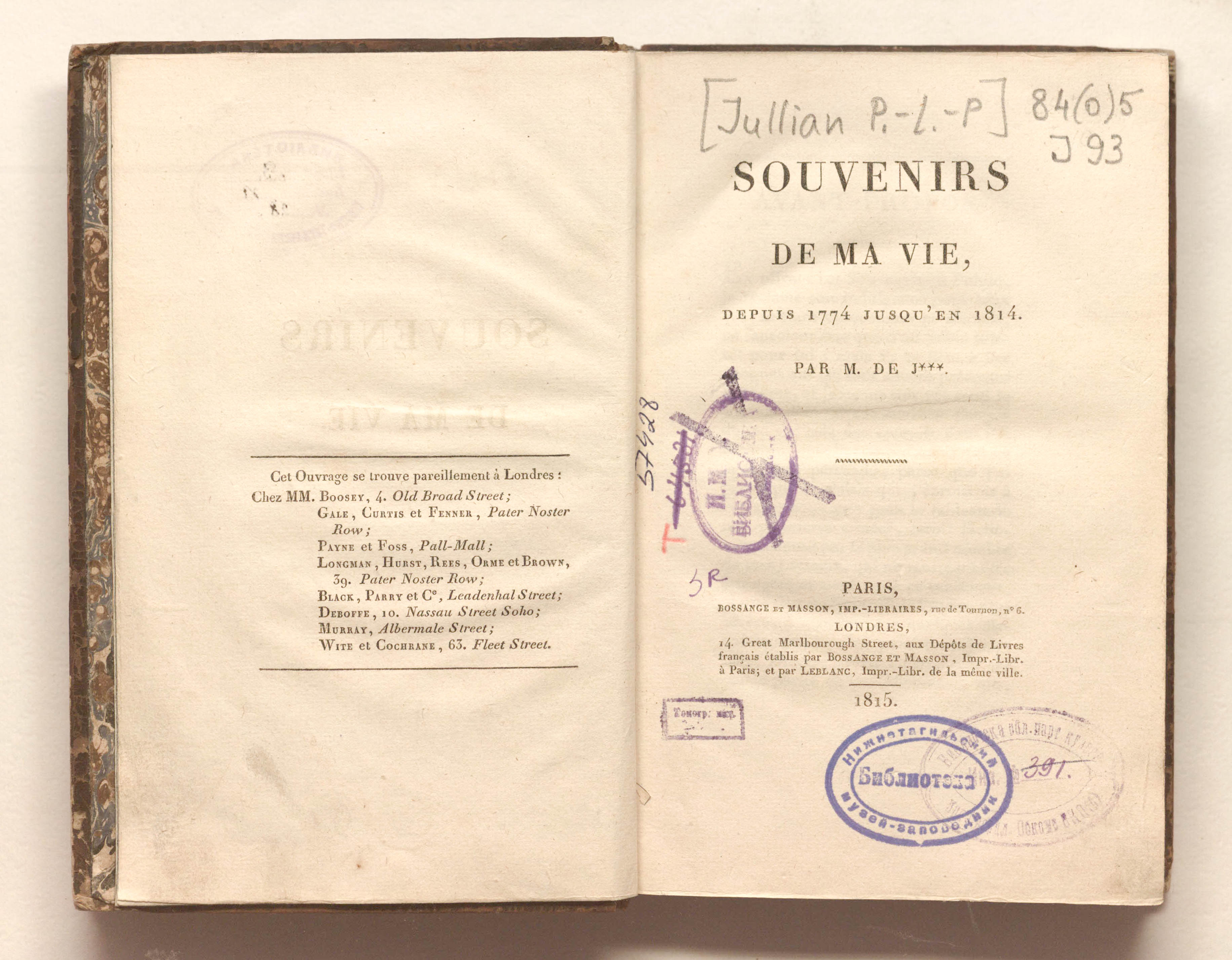 Воспоминания о моей жизни между 1774 и 1814 годами. Г-на Ж***[Жюллиан]. – Париж : Боссанж и Массон, 1815. – XVI, 365 с. ; 14х21 см.