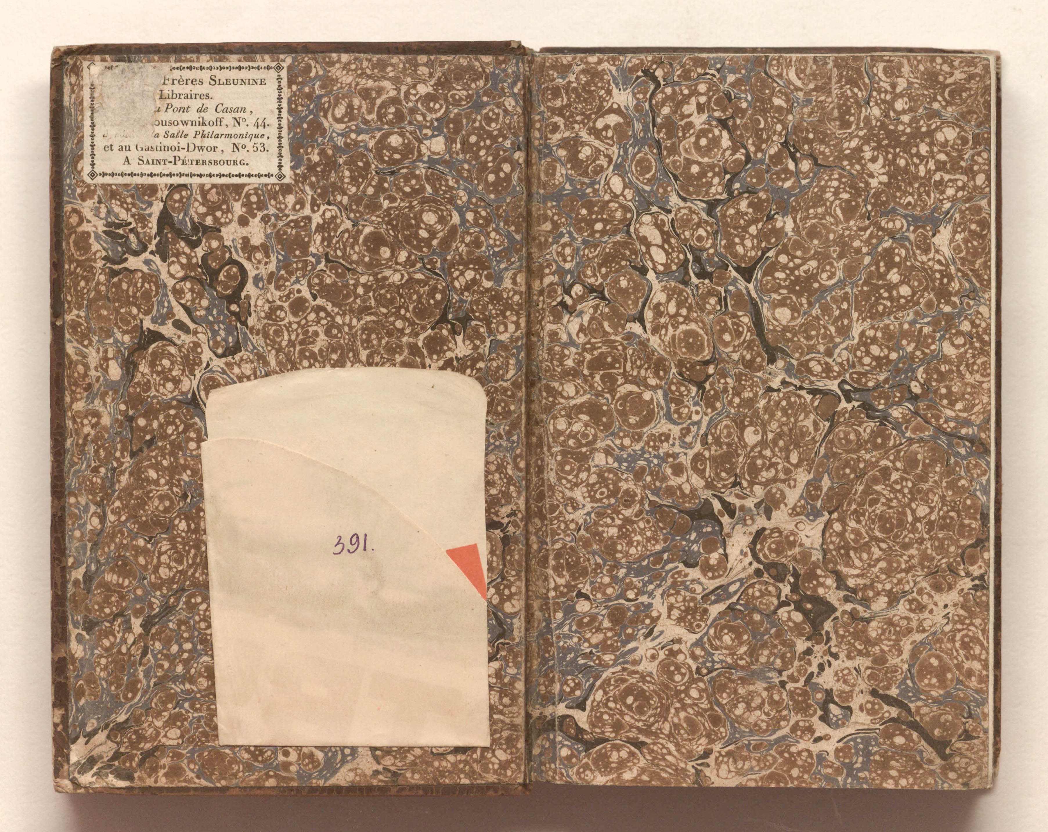 На форзаце 1б наклеен бумажный шрифтовой ярлык в семь строк, текст обрамлен наборной рамкой. Часть ярлыка повреждена, утраты текста восстановлены по смыслу содержания, а затем и по образцу подобного же ярлыка, обнаруженного позже: «[Chez les] Freres Sleunine | Libraires. | [Pres du] Pont de Casan, | [maison du K]ousownikoff, № 44 | [a cote de la] Salle Philarmonique, | et au Gastinoi – Dwor, № 53. | A Saint-Petersbourg». [«В книжных магазинах | братьев Слёниных. | Рядом с Казанcким мостом, | дом Кусовникова, № 44, | сбоку от Филармонического зала, | а в Гостином Дворе, № 53. | В Санкт-Петербурге».]