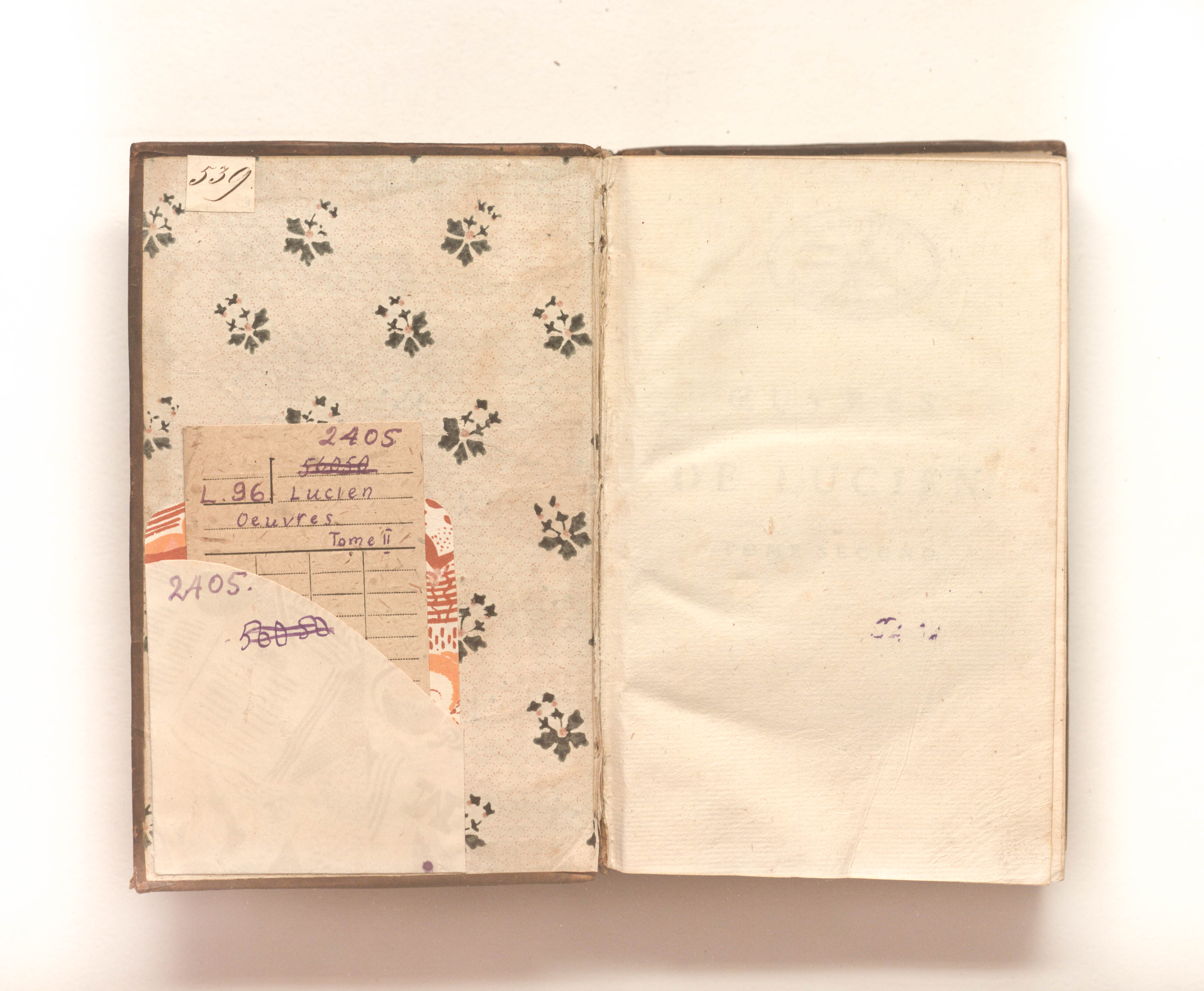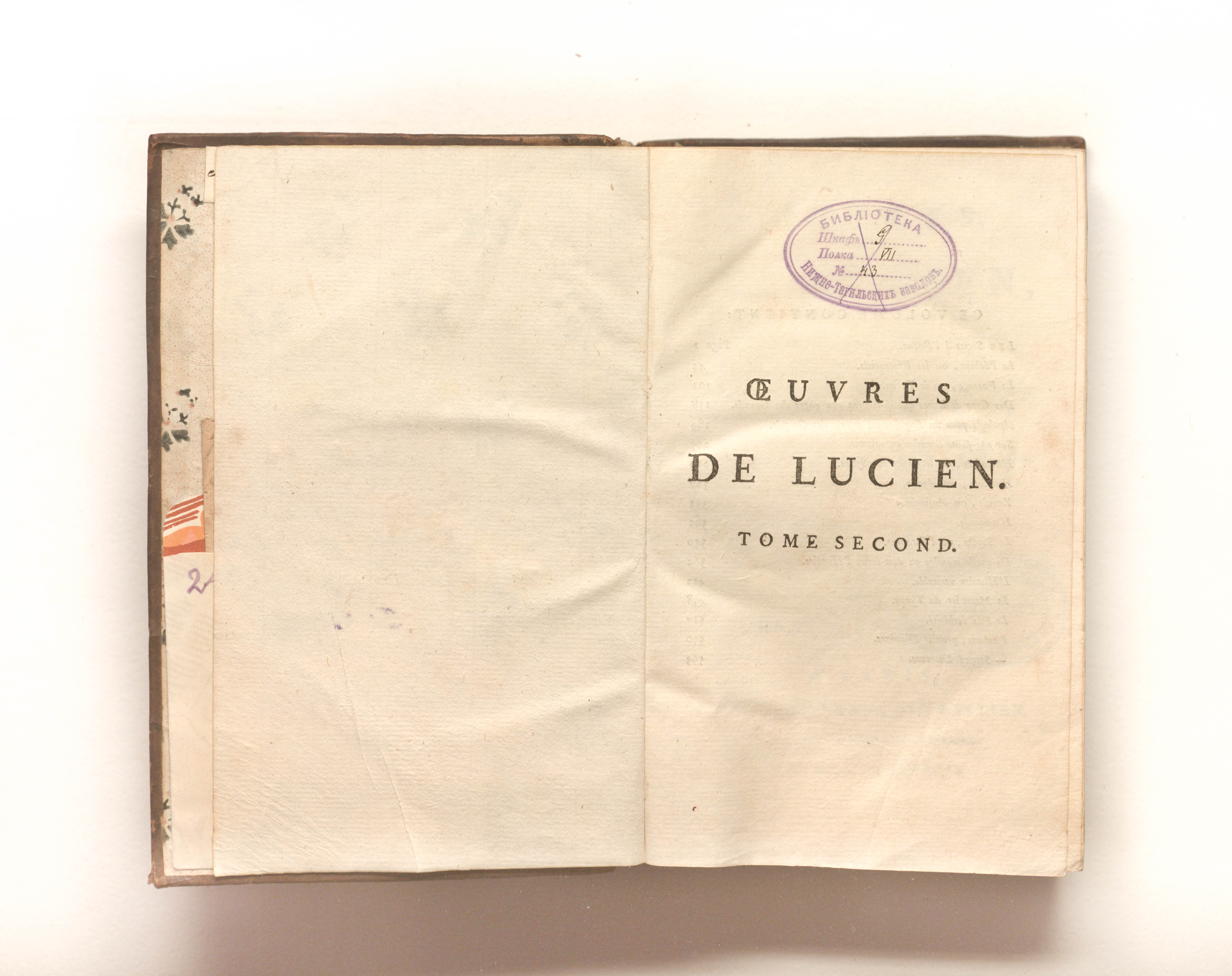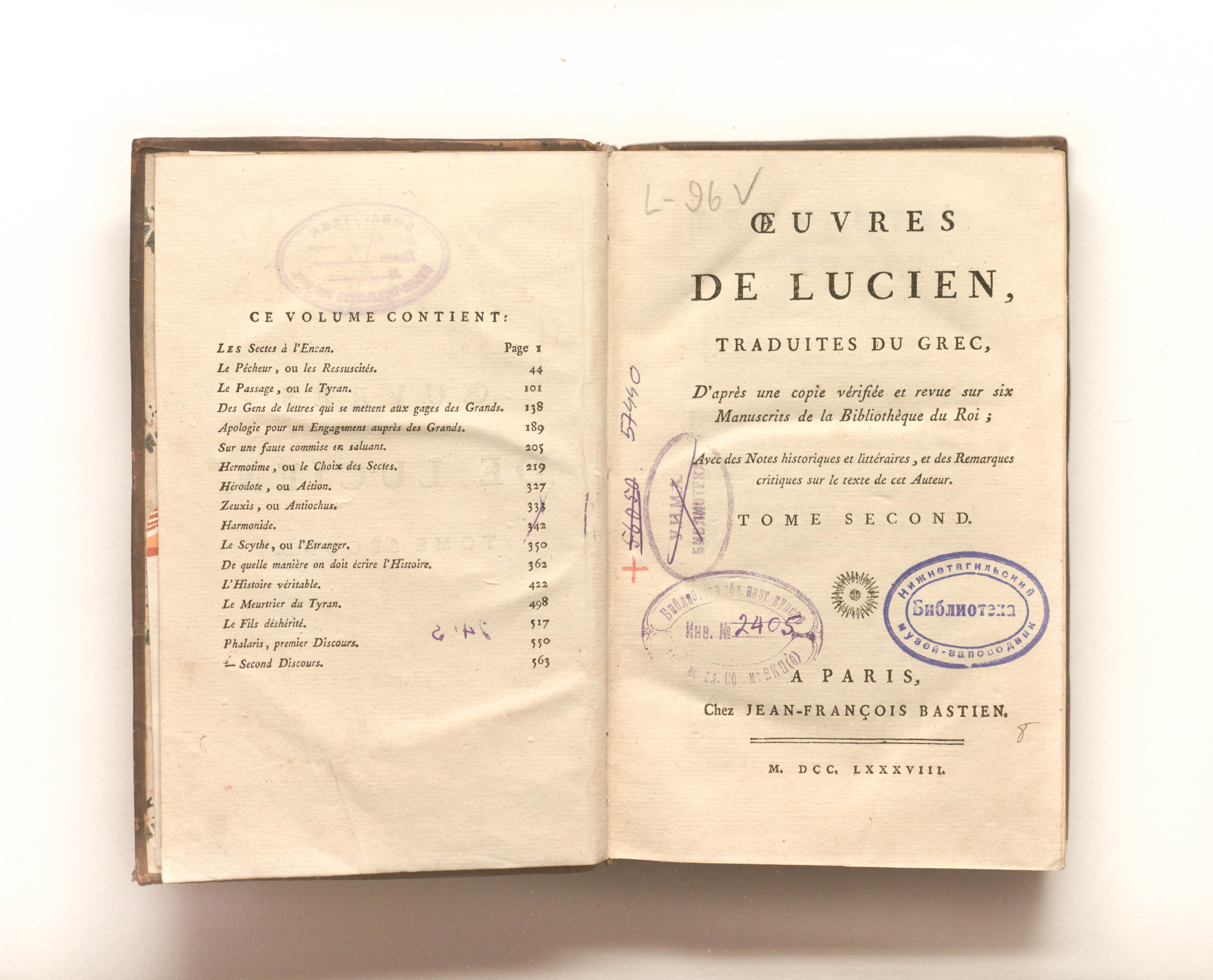 Сочинения Лукиана, переведенные с греческого [Жаком-Николя Беленом де Баллю], с проверенной и исправленной копией шести рукописей в Королевской библиотеке, с историческими и литературными примечаниями и критическими замечаниями к тексту этого автора. — Т. 2. — Париж : Ж.-Ф. Бастьен, 1788. — 568, [2] с. ; 20х13 см.