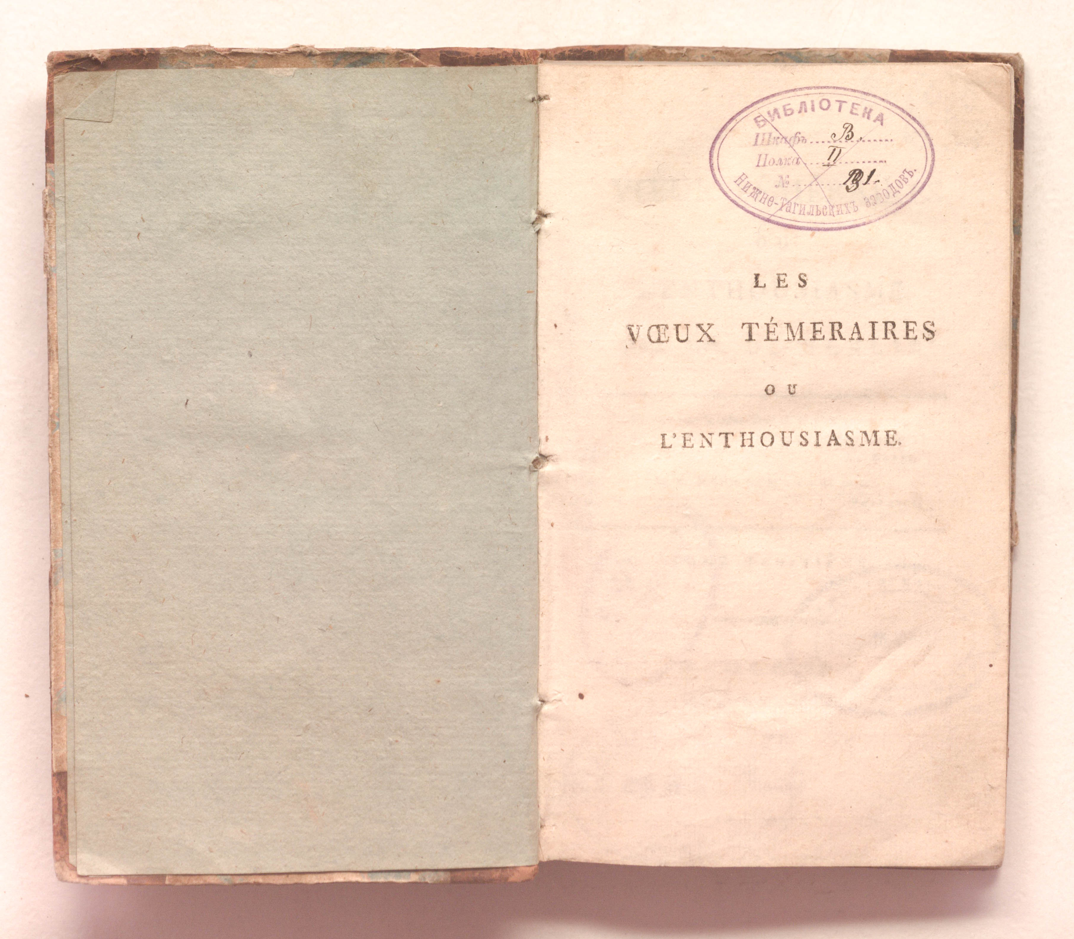 Безрассудные желания, или Энтузиазм. Сочинение мадам де Жанлис ... – 3 т. – Т. 3. – Гамбург : [б.и.], 1799. – 254 с. ; 10х17 см.