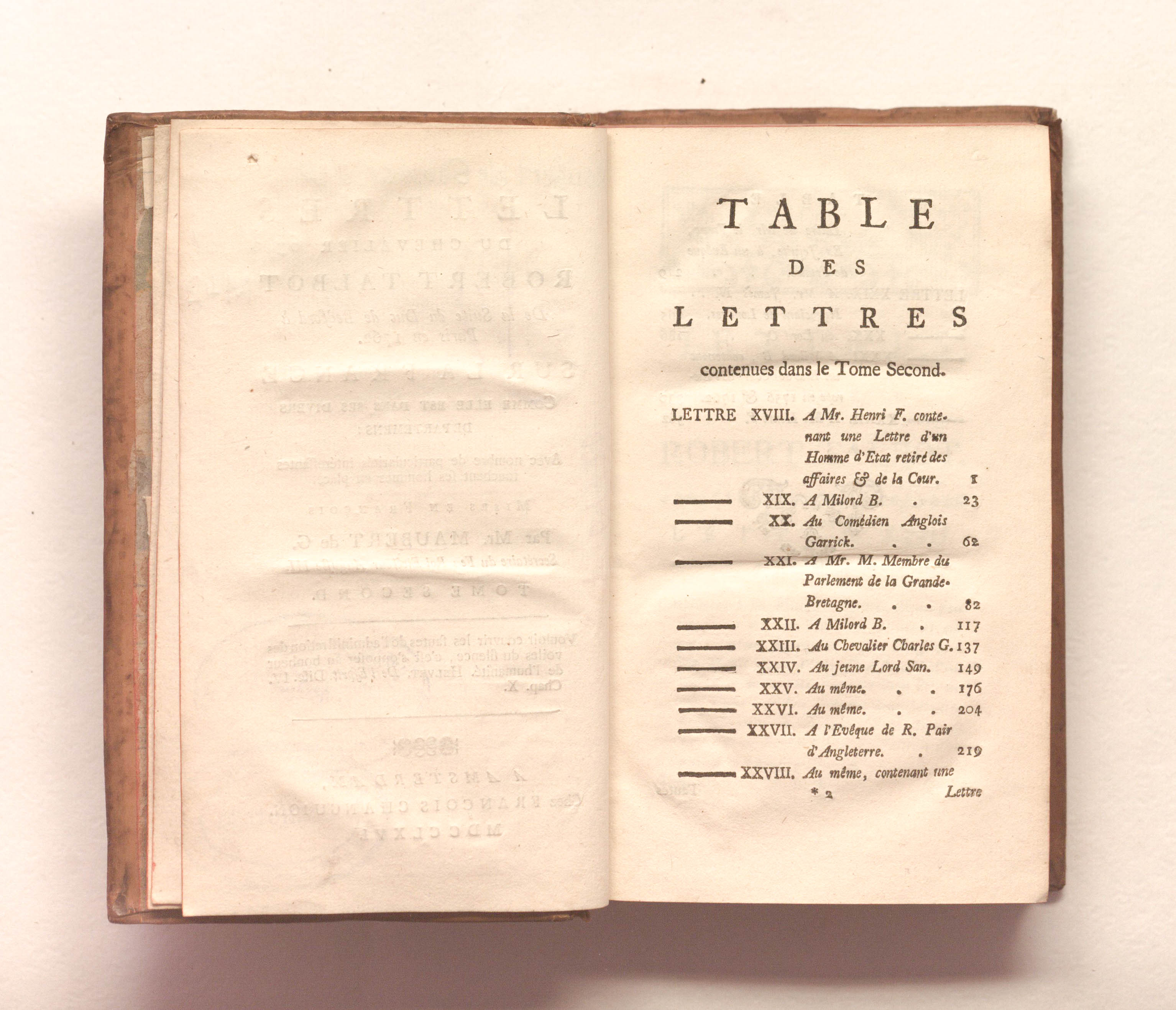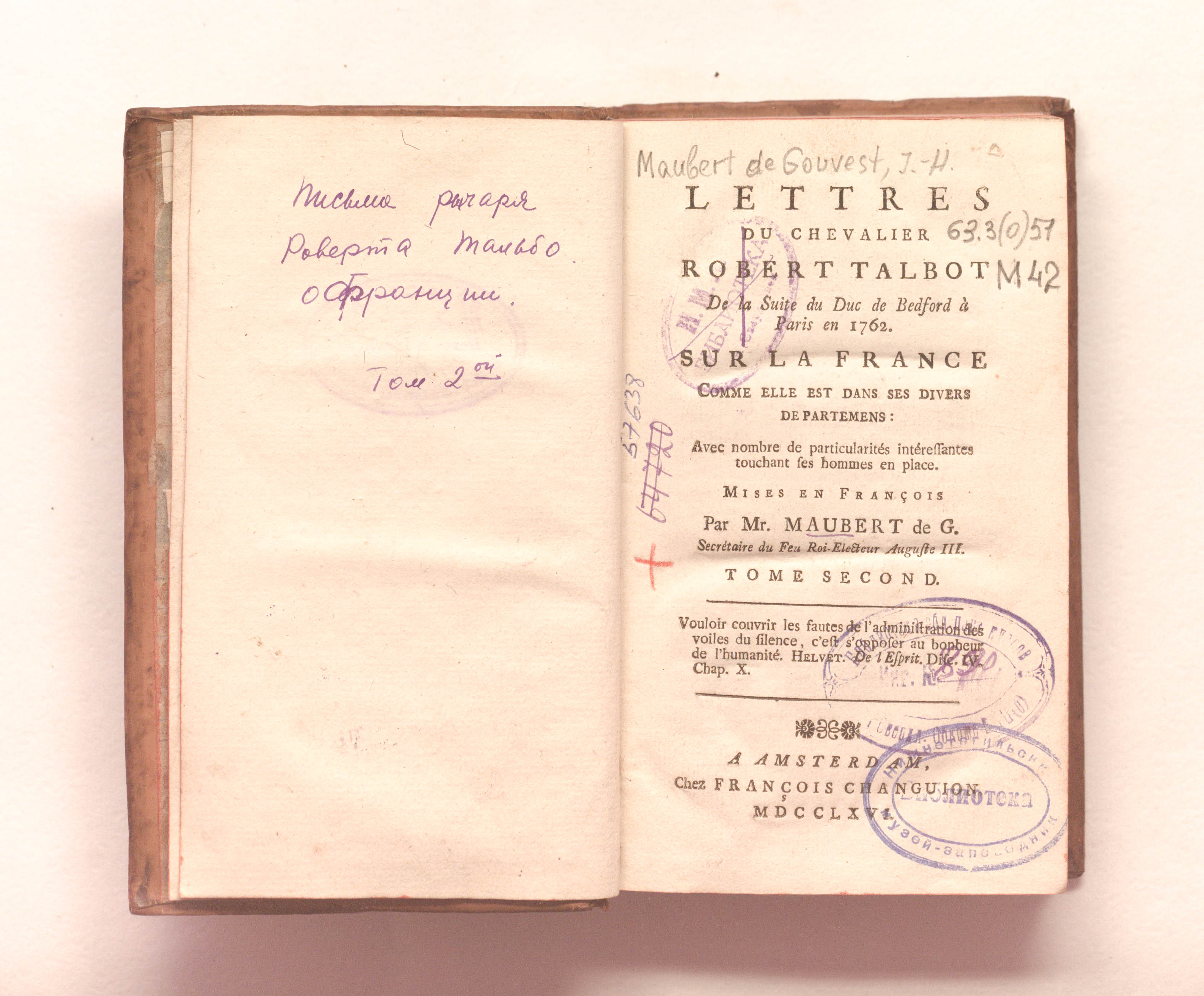 Письма рыцаря Роберта Талбота из свиты герцога Бедфорда в Париже в 1762 году о Франции в ее различных департаментах: с рядом интересных особенностей, затрагивающих ее людей. Изложено по-французски г-ном Мобер де Ж., секретарём покойного короля-курфюрста Августа III. - Т. 2. - Амстердам : Ф. Шангион, 1766. - [2], 362. [1] с.; 10,5х17 см.