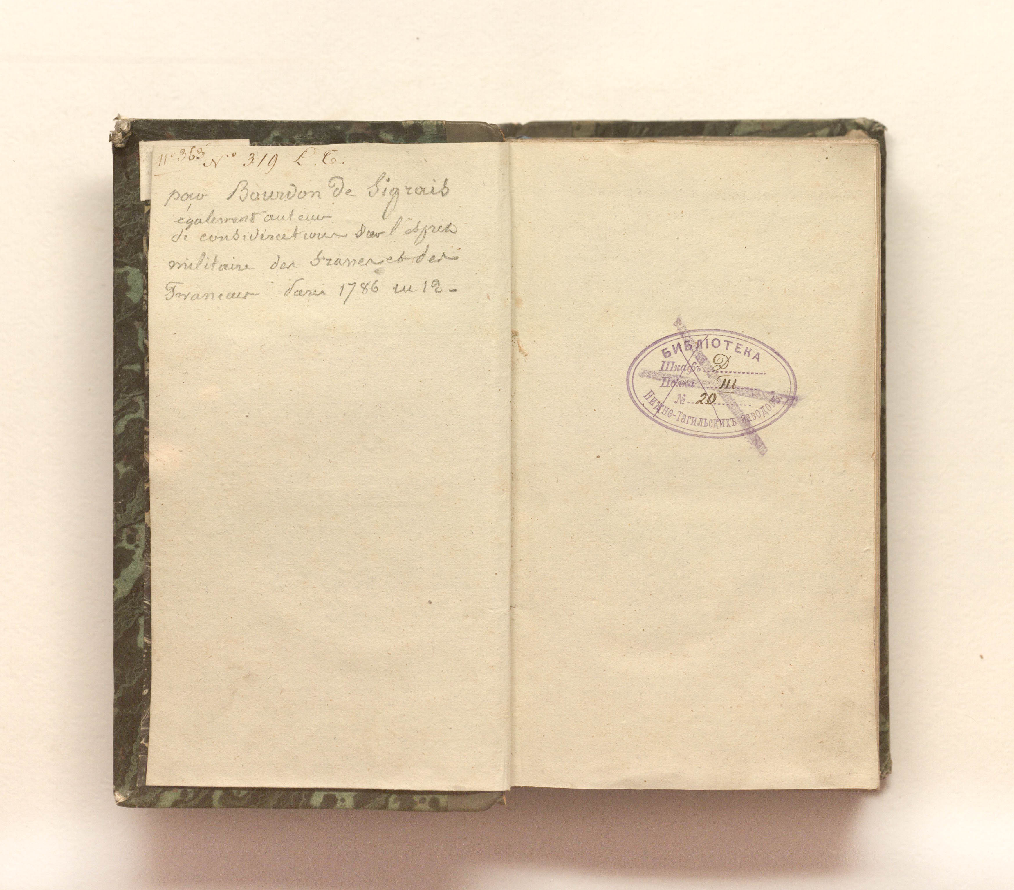 Соображения о воинственном духе галлов, служащие предварительным разъяснением для того же исследования французов и введением в историю Франции, написанные М***, капитаном. кавалерии..[К.-Ж. Бурдон де Сигрэ]. - Париж: Вдова Десен, 1774. – XX, 630, [2] с. ; 18,5х10,5 см.