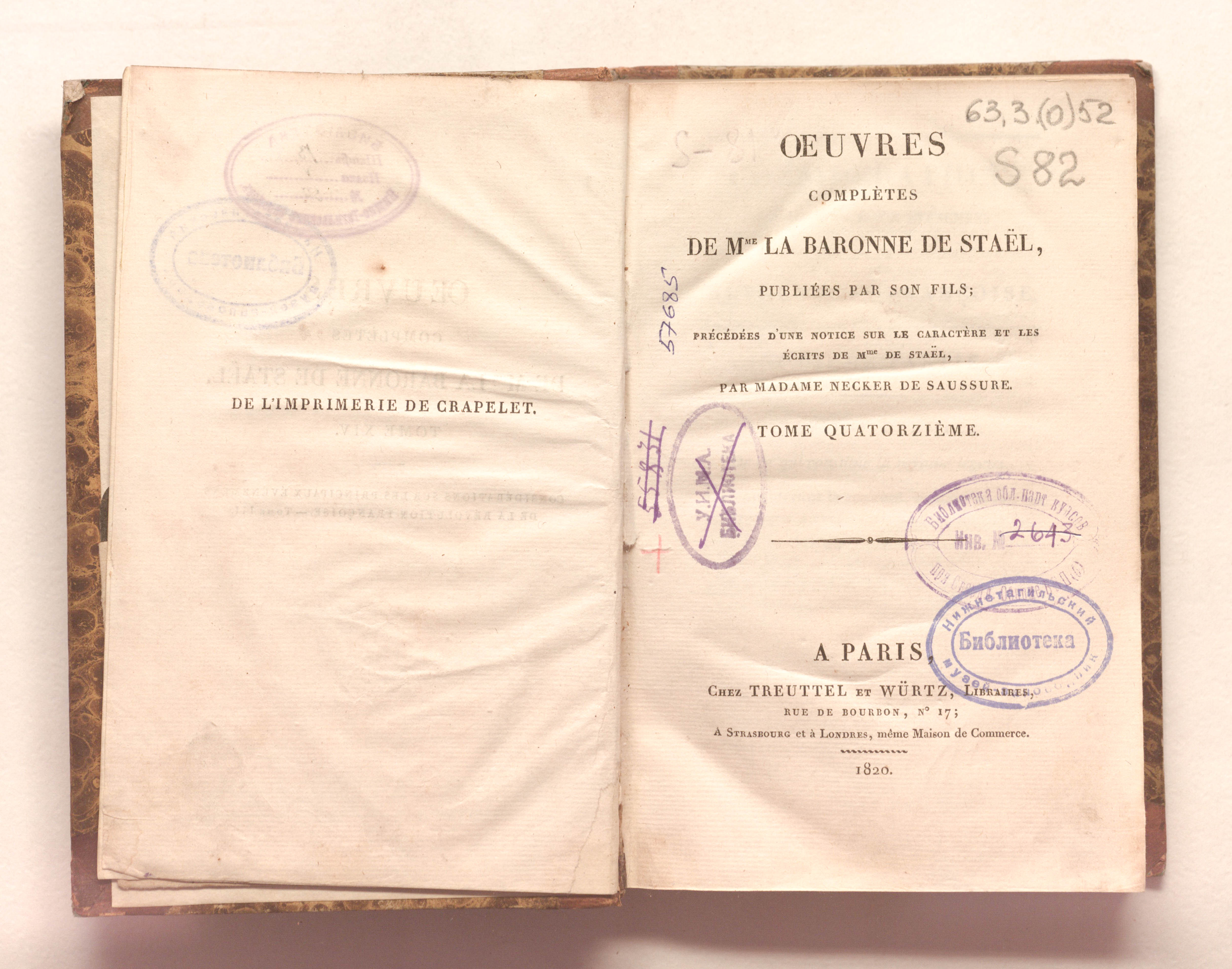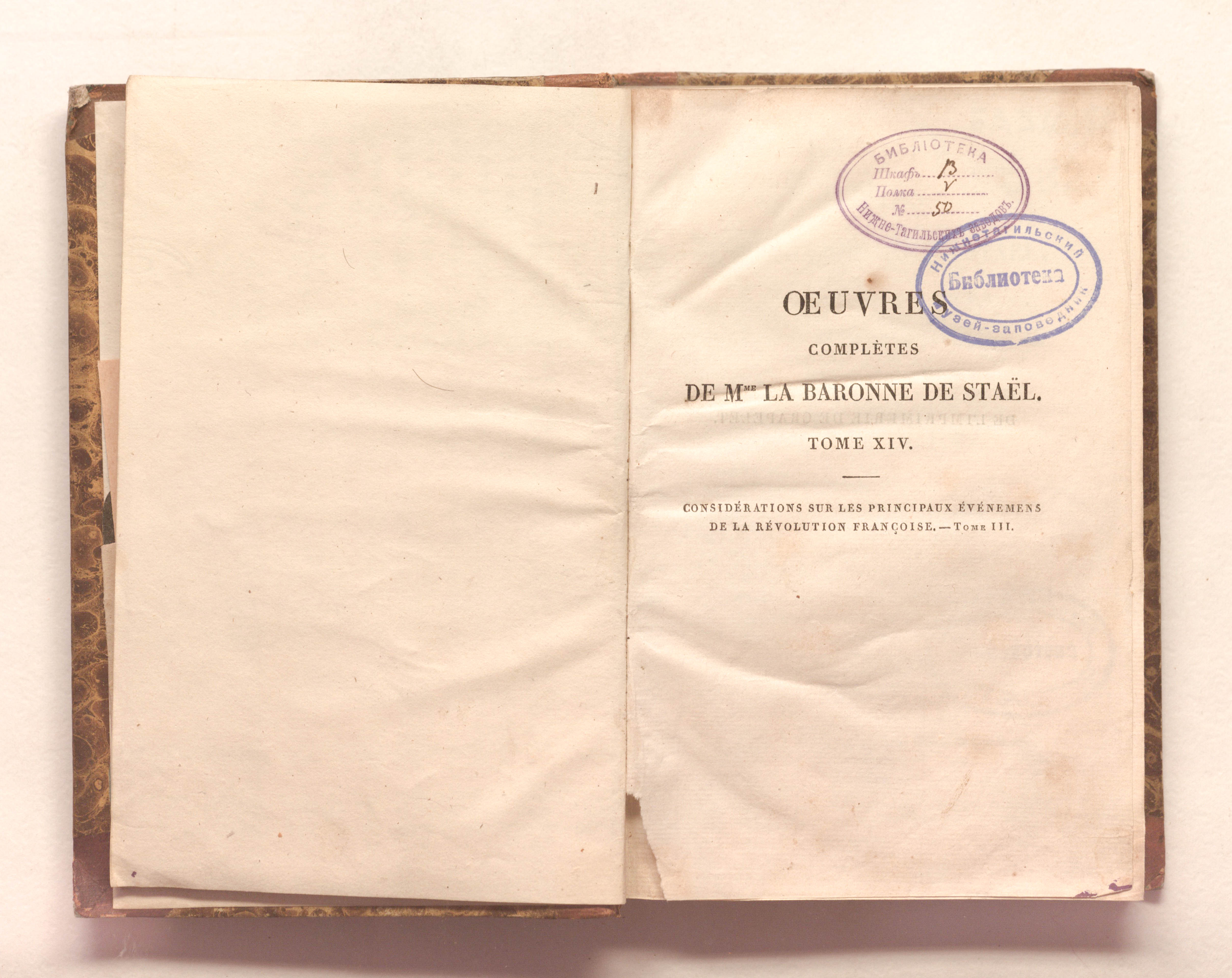 Полное собрание сочинений г-жи баронессы де Сталь; опубликовано её сыном [Огюстом-Луи де Сталь-Гольштейном]; предваряется заметкой о характере и трудах мадам де Сталь, написанной мадам Неккер де Соссюр. Том четырнадцатый. Размышления об основных событиях Французской Революции. – Париж : Тройттель и Вюрц, 1820. – 388 с.; 13х20 см.