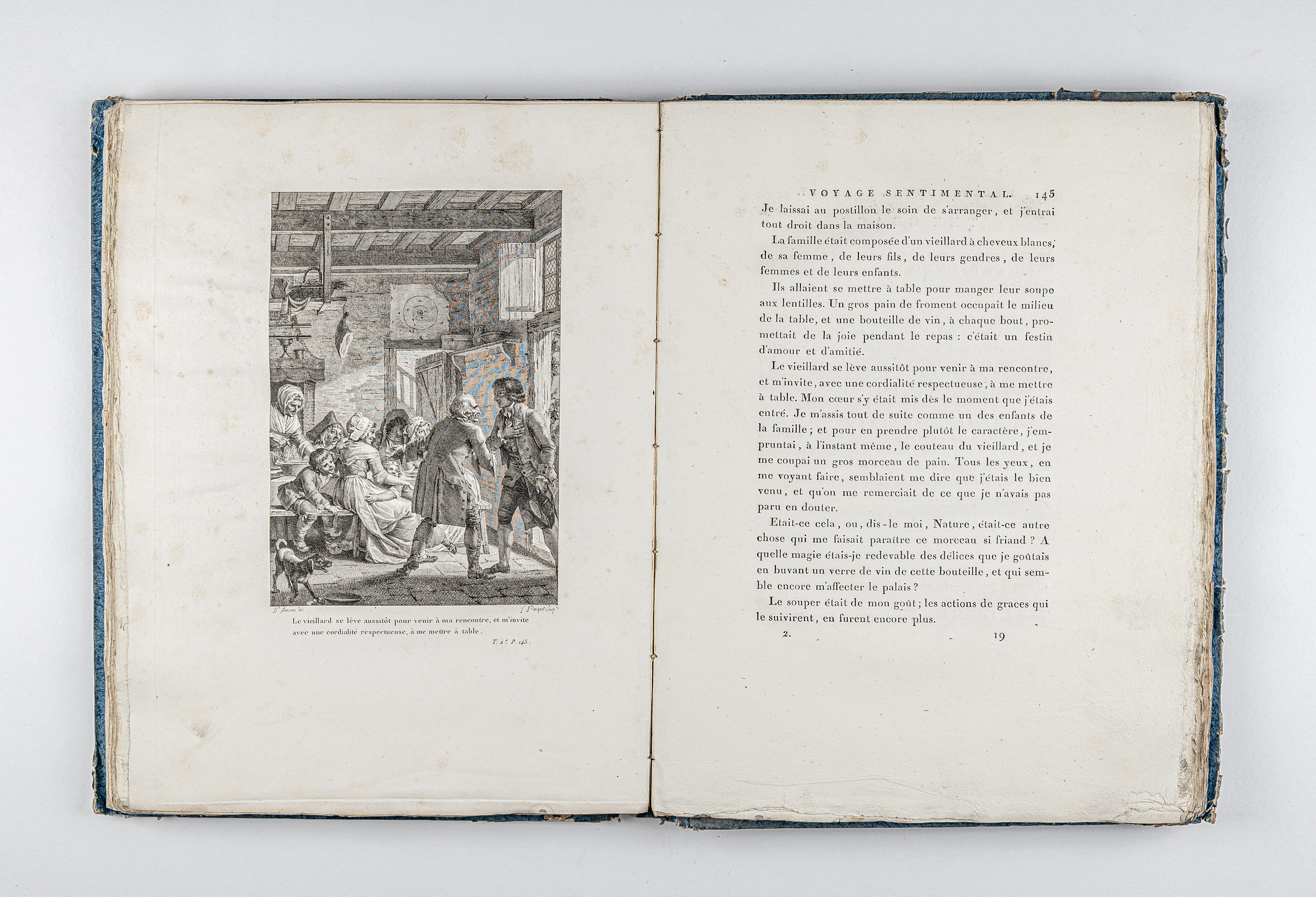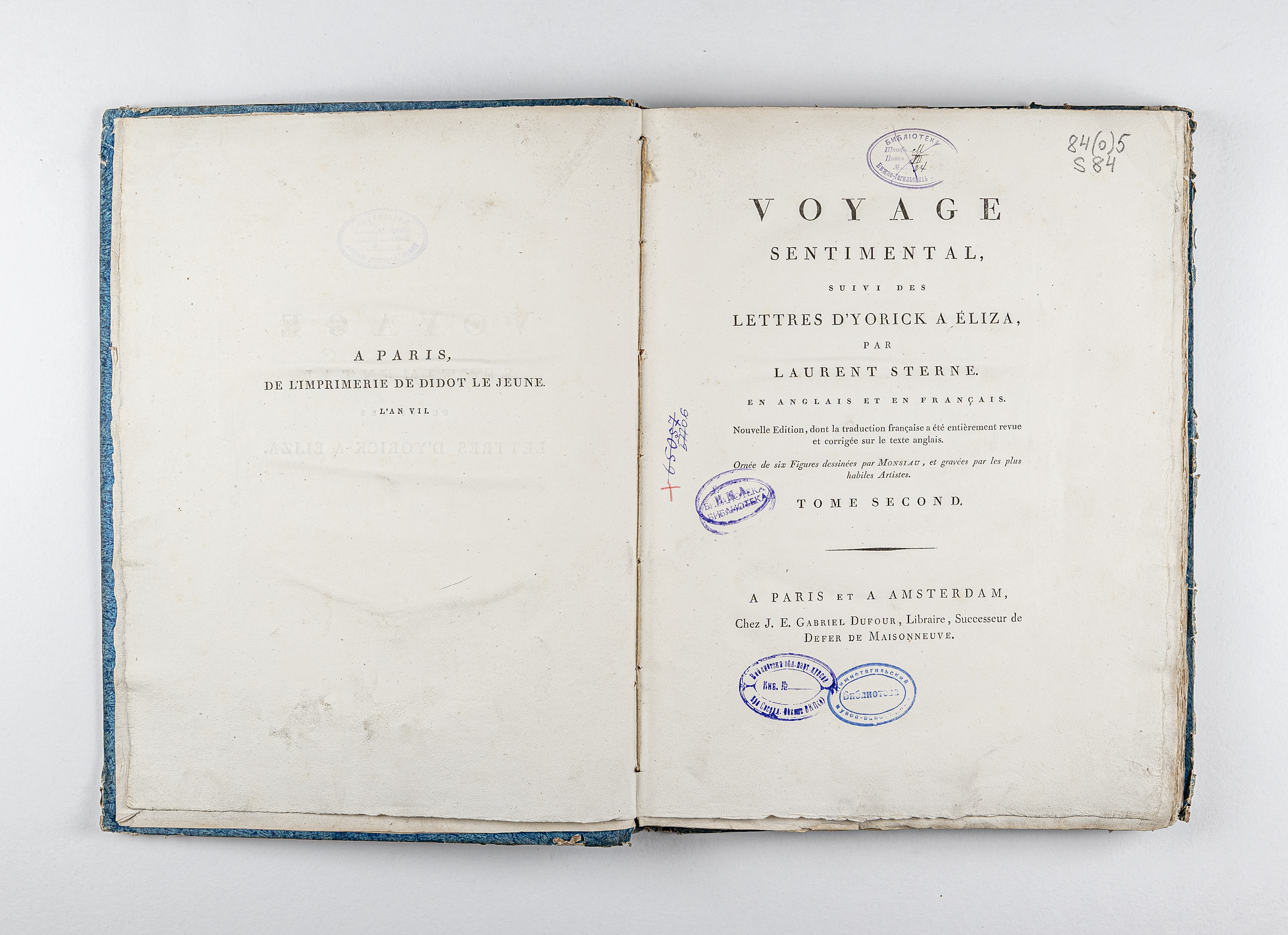 Стерн, Ло́ренс (1713-1768). Cентиментальное путешествие, за которым следуют «Письма Йорика к Элизе» Лорана Стерна. На английском и французском языках. Новое издание, французский перевод которого был полностью переработан и исправлен по английскому тексту / Л. Стерн ; украшен шестью фигурами, нарисованными Монсио и выгравированными самыми искусными художниками. – Т. 2. – Париж ; Амстердам : Габриэль Дюфур [Типография Дидо младшего]. – Год VII (1799). – 227 с. : 2 л. ил. ; 36,5х27 cм.