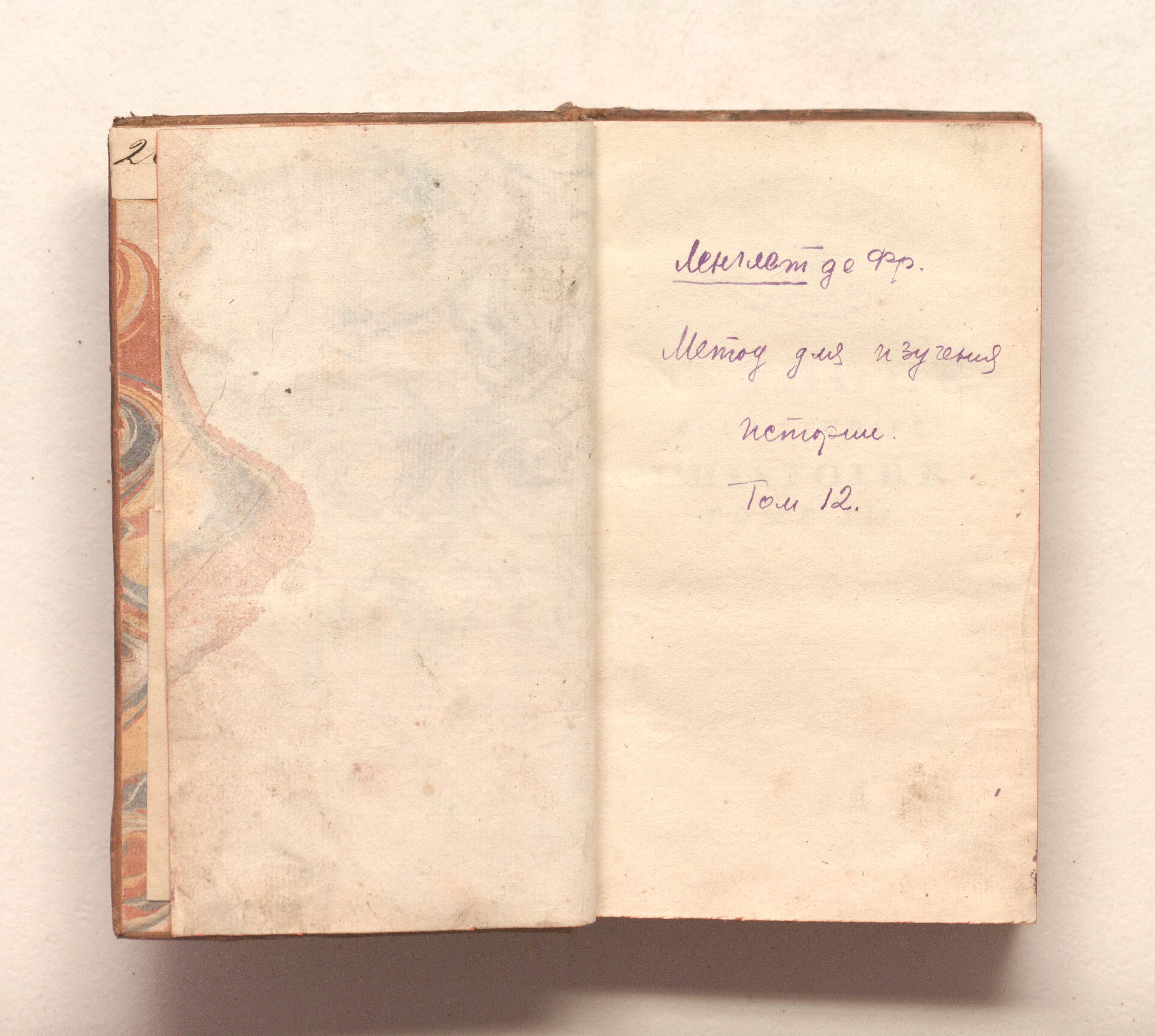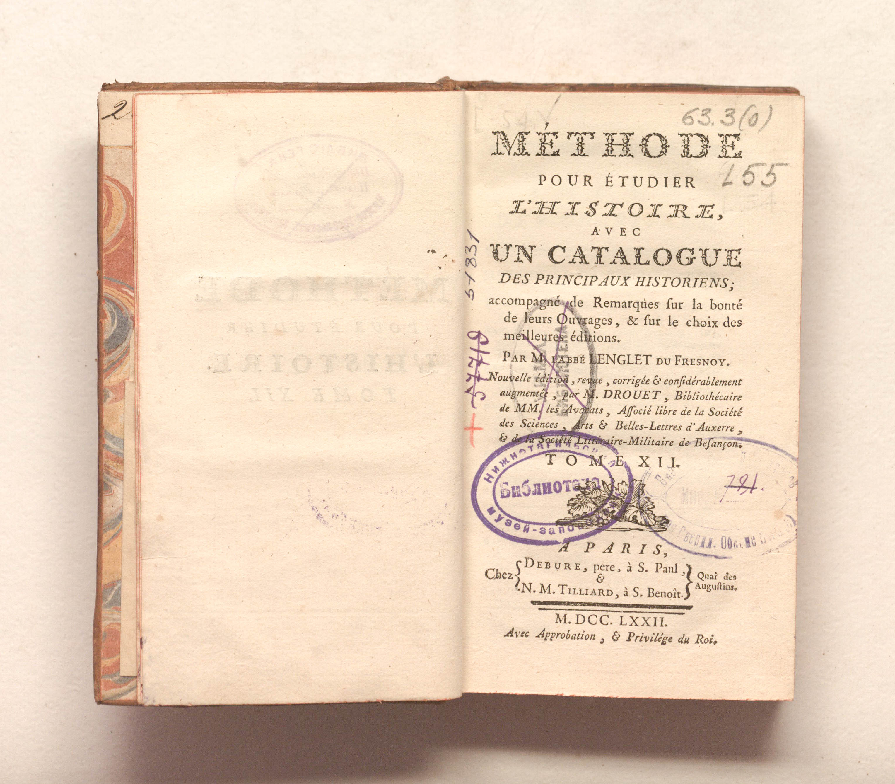 Метод изучения истории, с каталогом основных историков, сопровождаемым замечаниями о качестве их работ и выборе лучших изданий. Новое издание, переработанное, исправленное и значительно дополненное г-ном Друэ, ... Т. 12. — Париж: Дебюр отец; Тийяр, 1772. — VI, 384 с.; 10х17 см.
