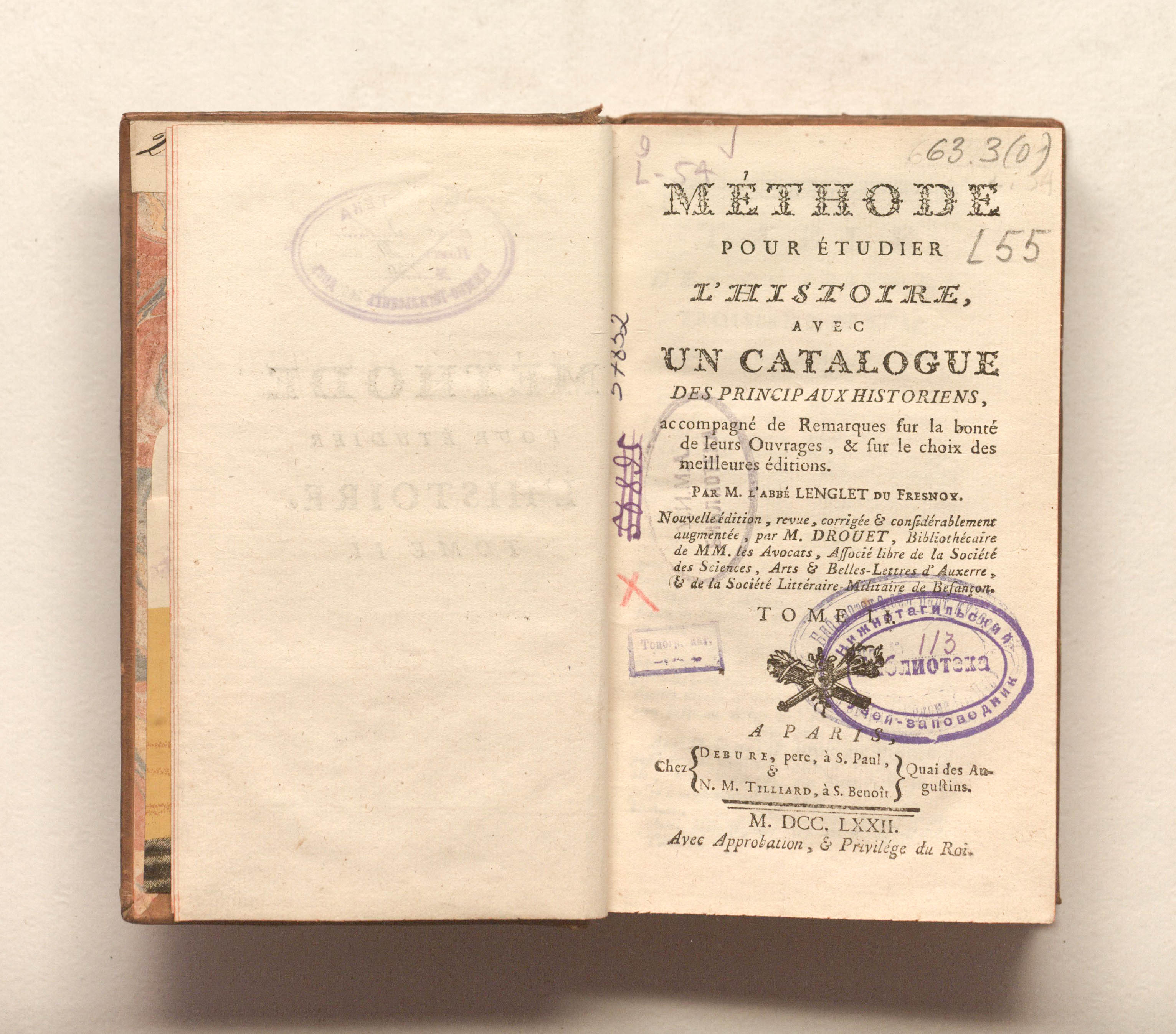 Метод изучения истории, с каталогом основных историков, сопровождаемым замечаниями о качестве их работ и выборе лучших изданий. Новое издание, переработанное, исправленное и значительно дополненное г-ном Друэ, ... Т. 2. — Париж: Дебюр отец; Тийяр, 1772. — IV, 528 с.; 10х17 см.