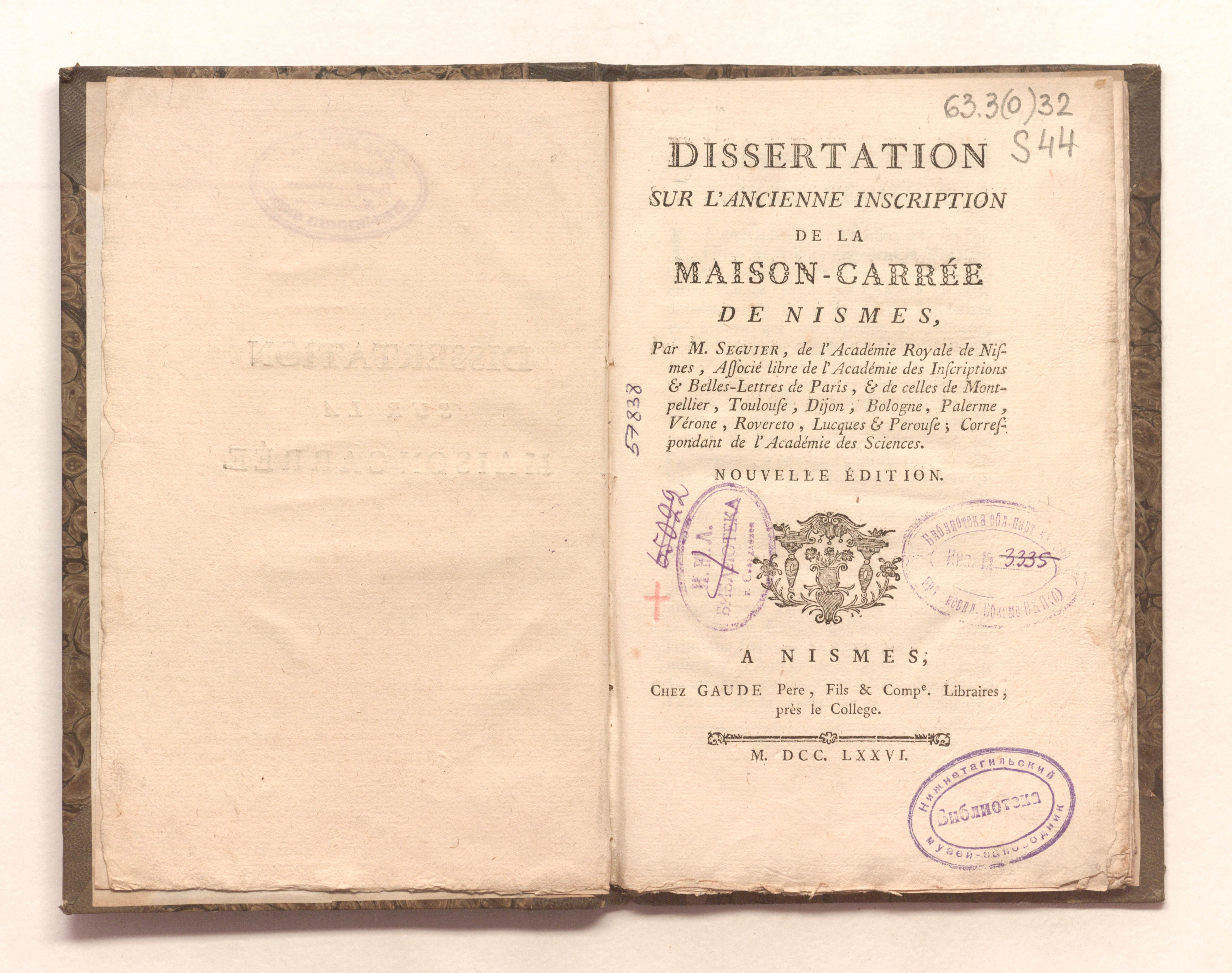 Dissertation sur l'ancienne inscription de la Maison-Carree de Nismes. Par M. Seguier, de l'Academie Royale de Nismes.... - Nouv. ed. - Nismes : Gaude Pere, Fils & Comp., 1776. – [2], III-V, [2], 8-57, [1] p., 1 fold. pl.; 14х22 cm.