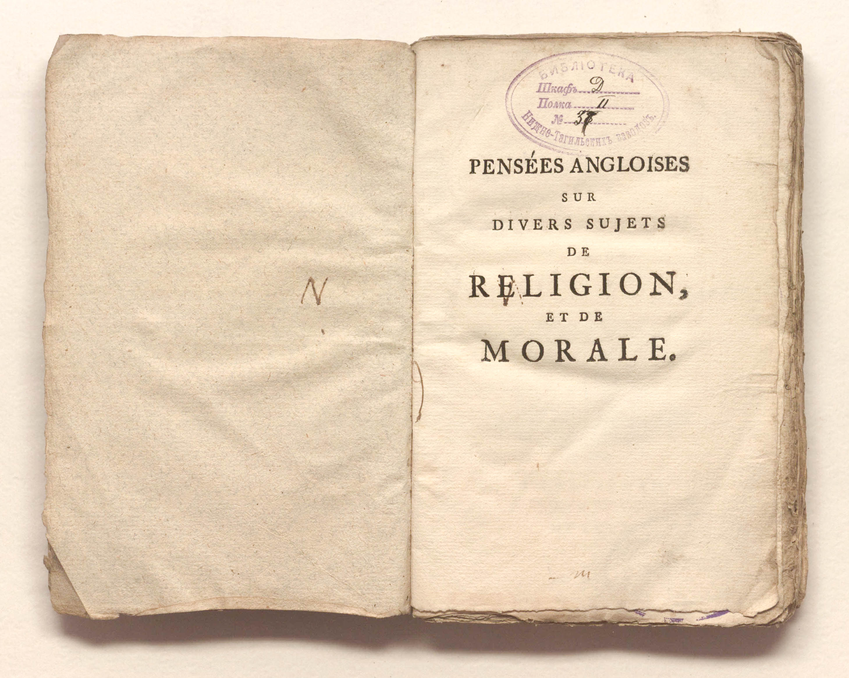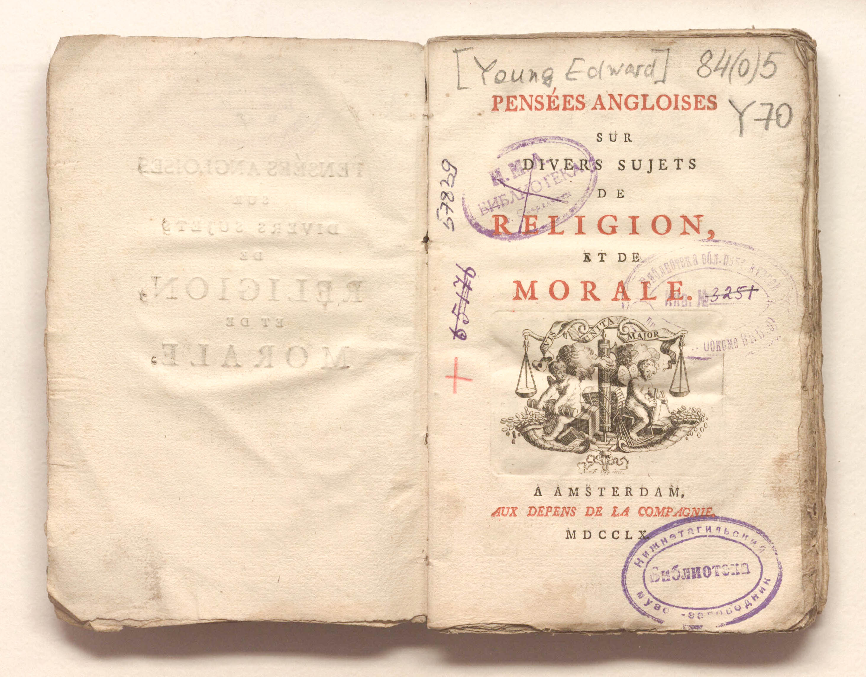 Pensees angloises sur divers sujets de religion; et de morale. - Amsterdam : Aux depens de la Compagnie, 1760. - XII, [2], 142 p.; 11х16,5 cm.