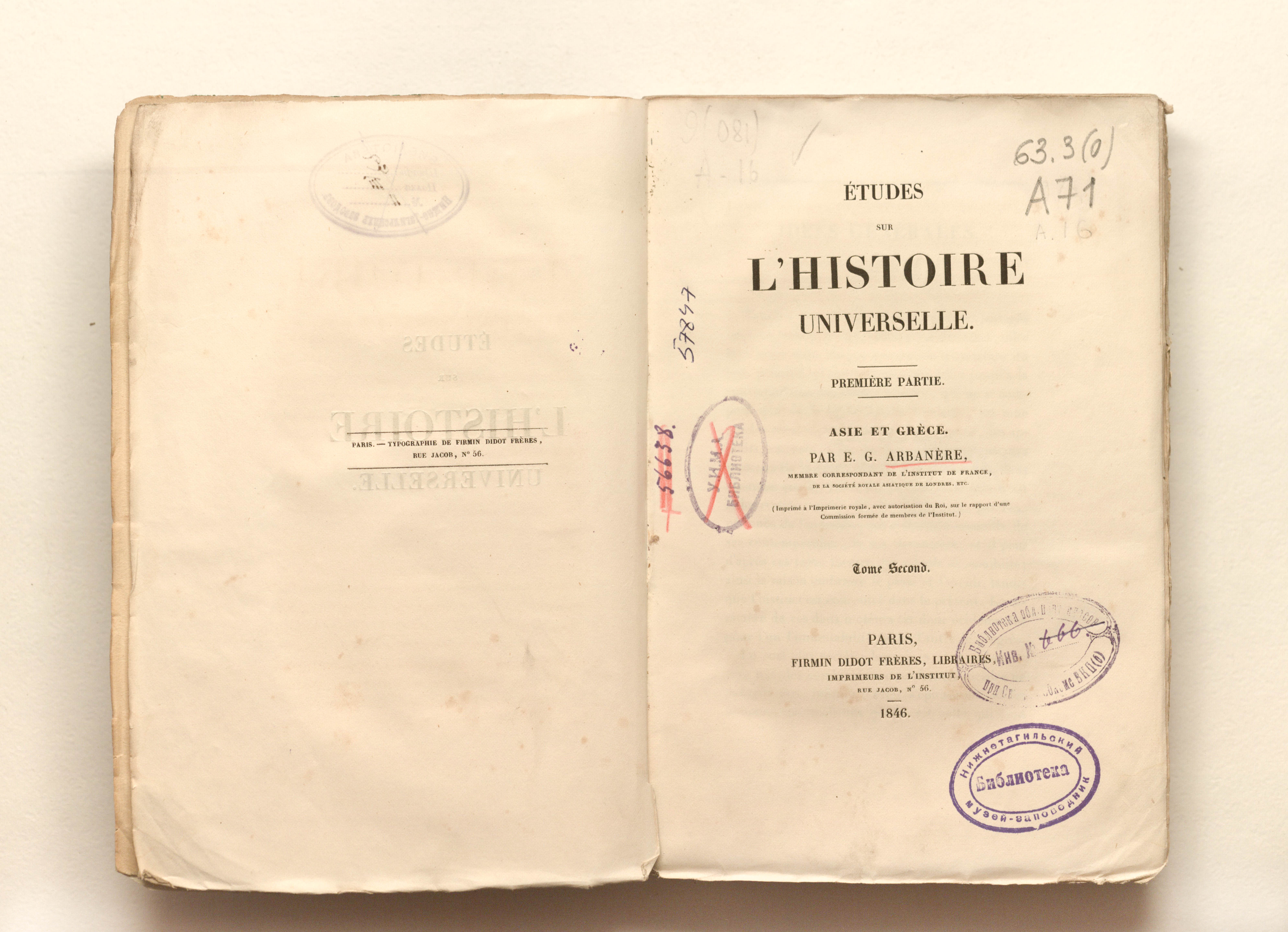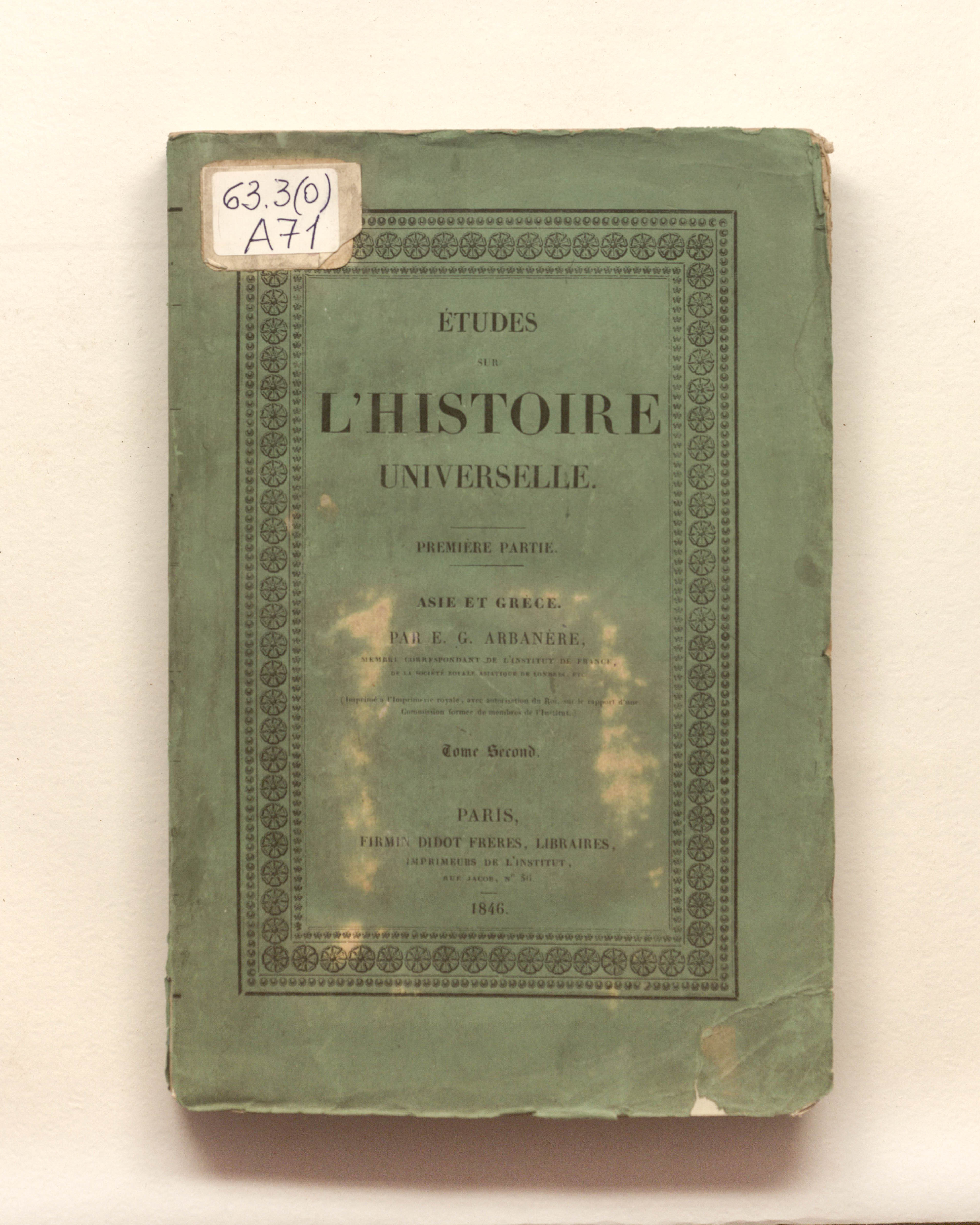 Arbanere, Etienne-Gabriel. Etudes sur l'histoire universelle. Premiere partie. Asie et Grece. Par E.G. Arbanere. Tome second. - Paris : Firmin-Didot freres, 1846. - VIII, 477, [1] p. ; 23x15 cm.