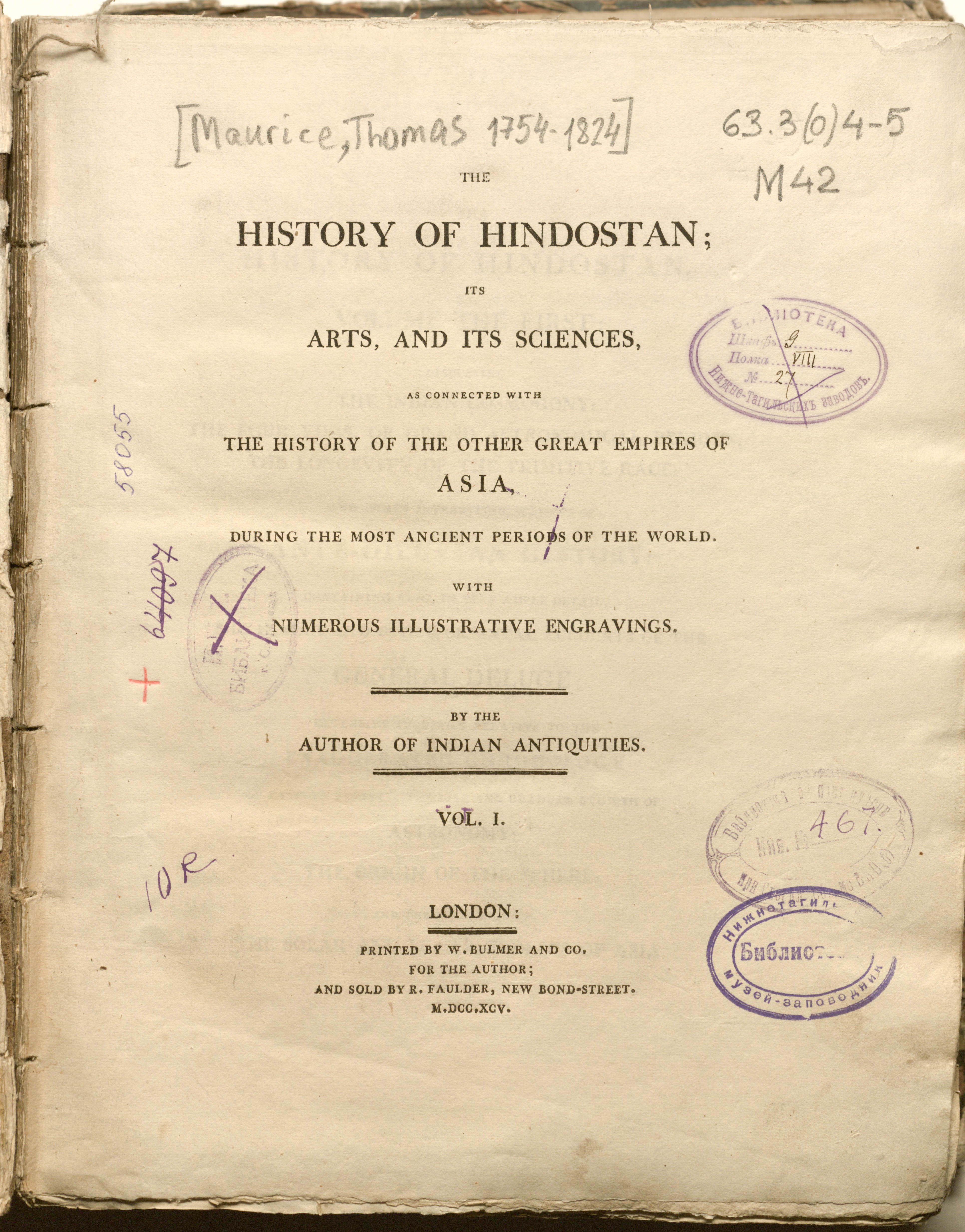 История Индостана; ее искусств и ее наук, связанных с историей других великих империй Азии в древнейшие периоды мира. С множественными гравированными иллюстрациями. Сочинение автора «Индийских древностей». - Т. 1. - Лондон: У. Балмер, 1795. - XXXII, [2], 591, [2] с., 2 л. ил.; 22х29 см.