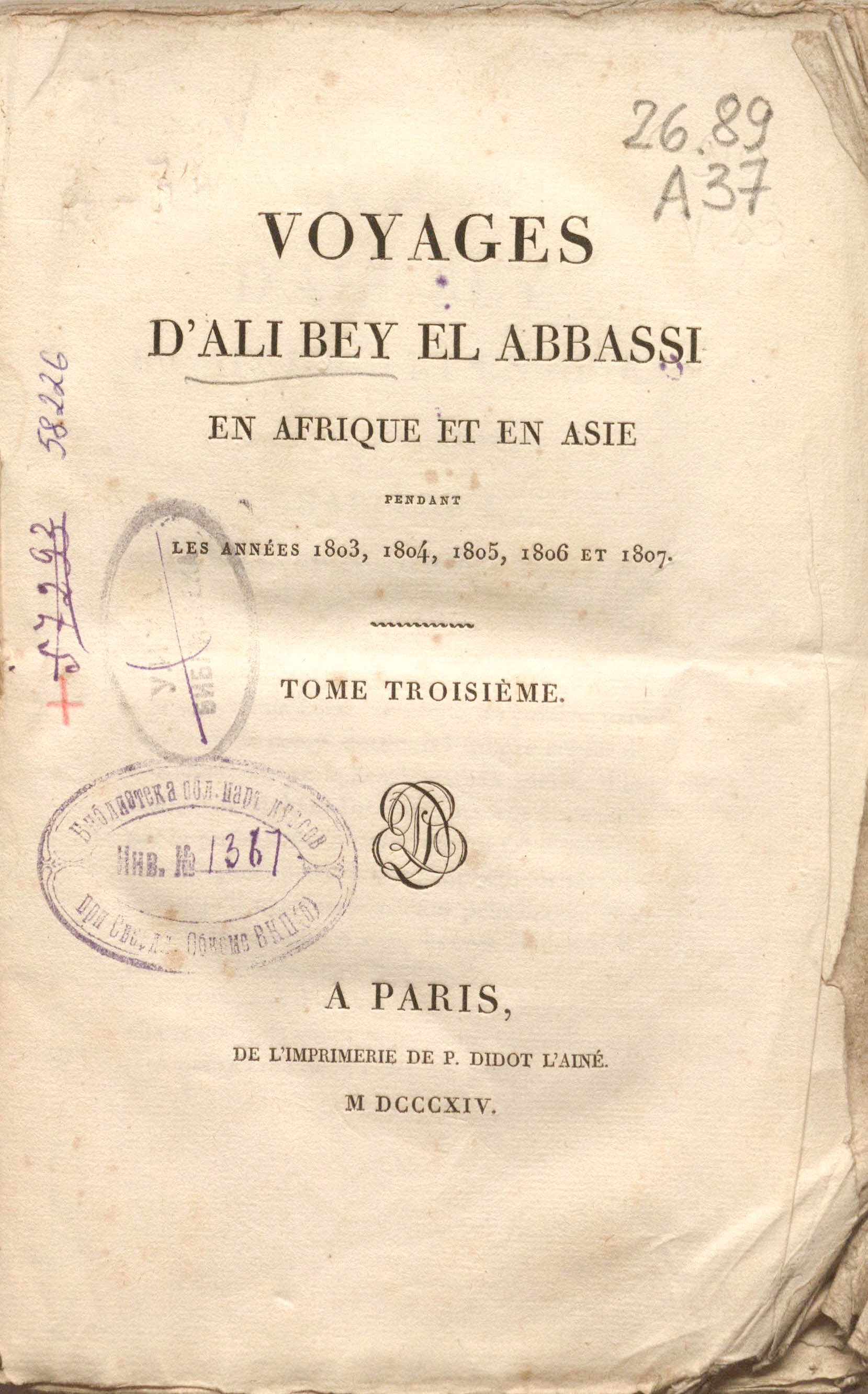 Путешествия Али-бея эль-Аббасси по Африке и Азии в 1803, 1804, 1805, 1806 и 1807 годах. – 3 т., атлас. – Т. 3. – Париж : П. Дидо старший, 1814. – 410, [1] с. ; 14х21 см.