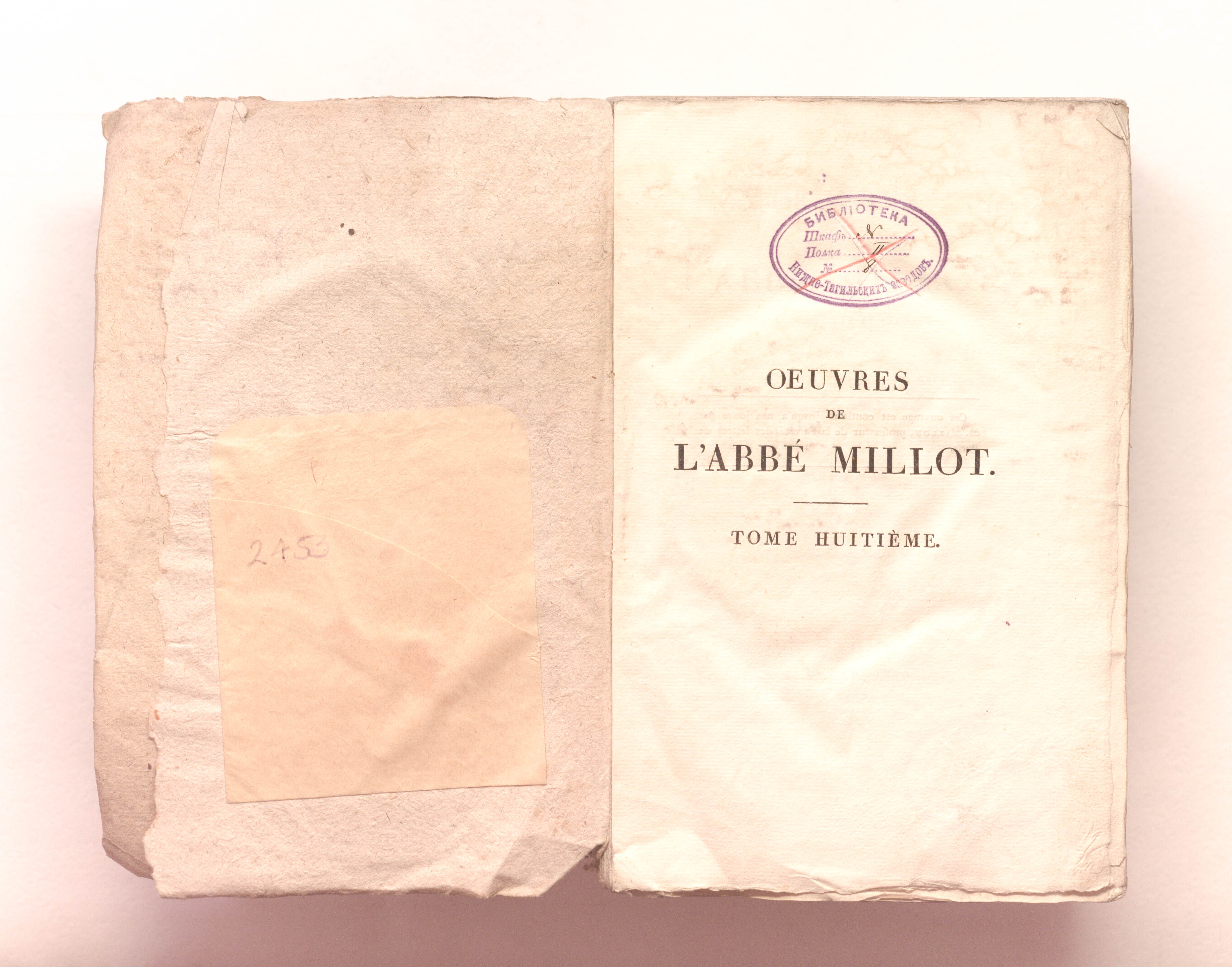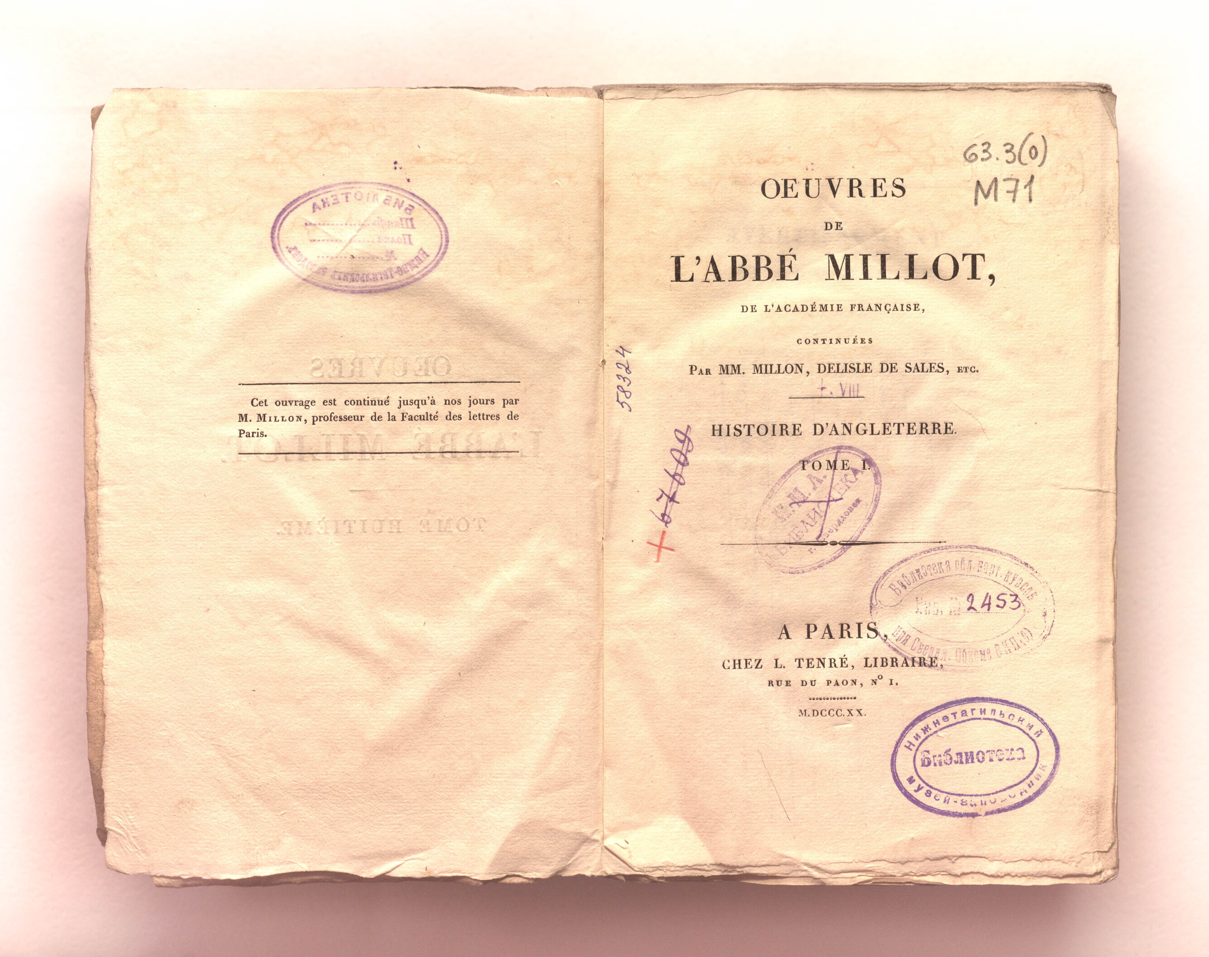Сочинения аббата Мийо,... в продолжение работ господ Мийона, Делиль де Саль и др. Том восьмой. История Англии. Том 1. – Т. 8 (1). – Париж: Леду и Тенре, 1820. – VIII, 706 с.; 13х21 см.