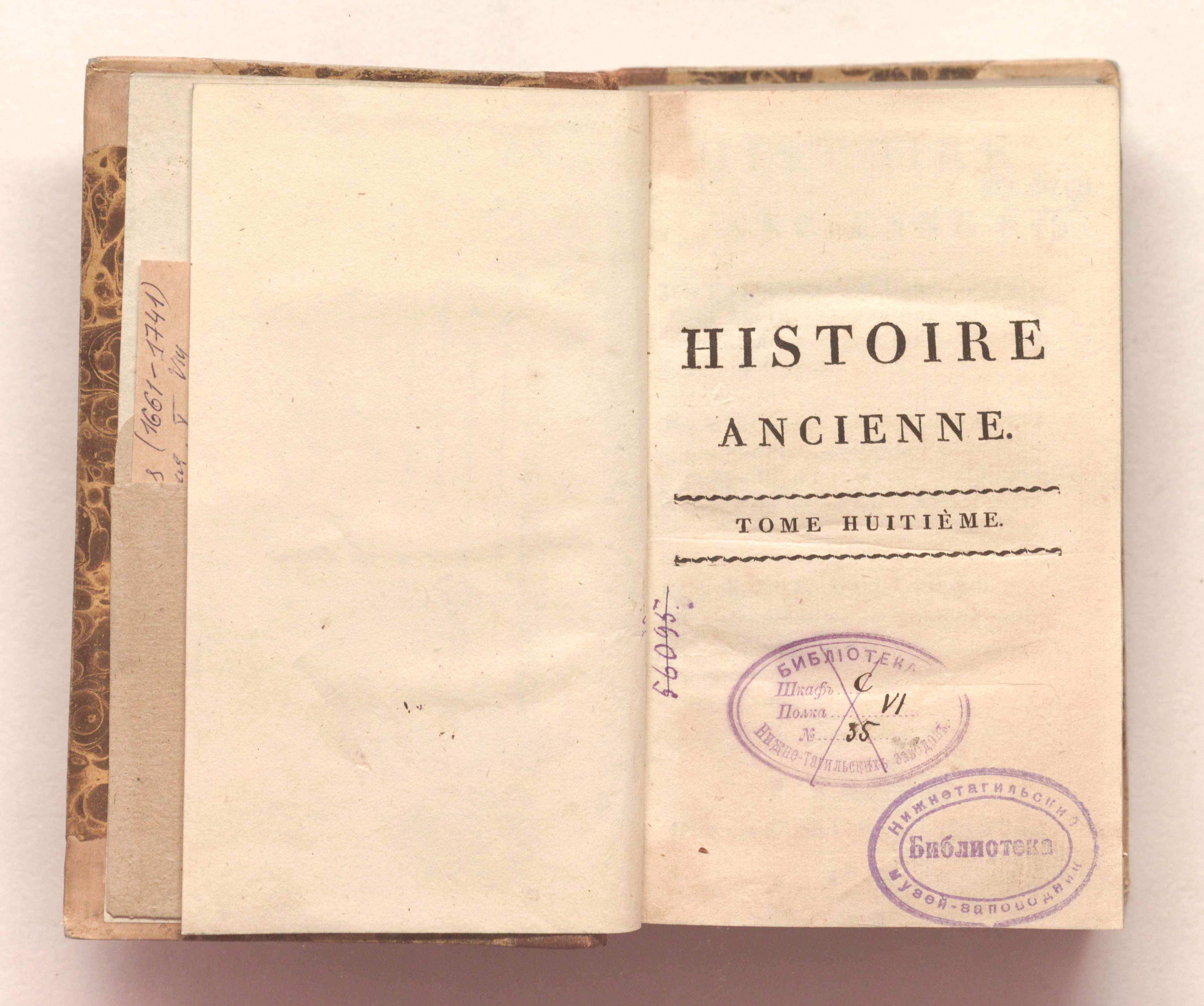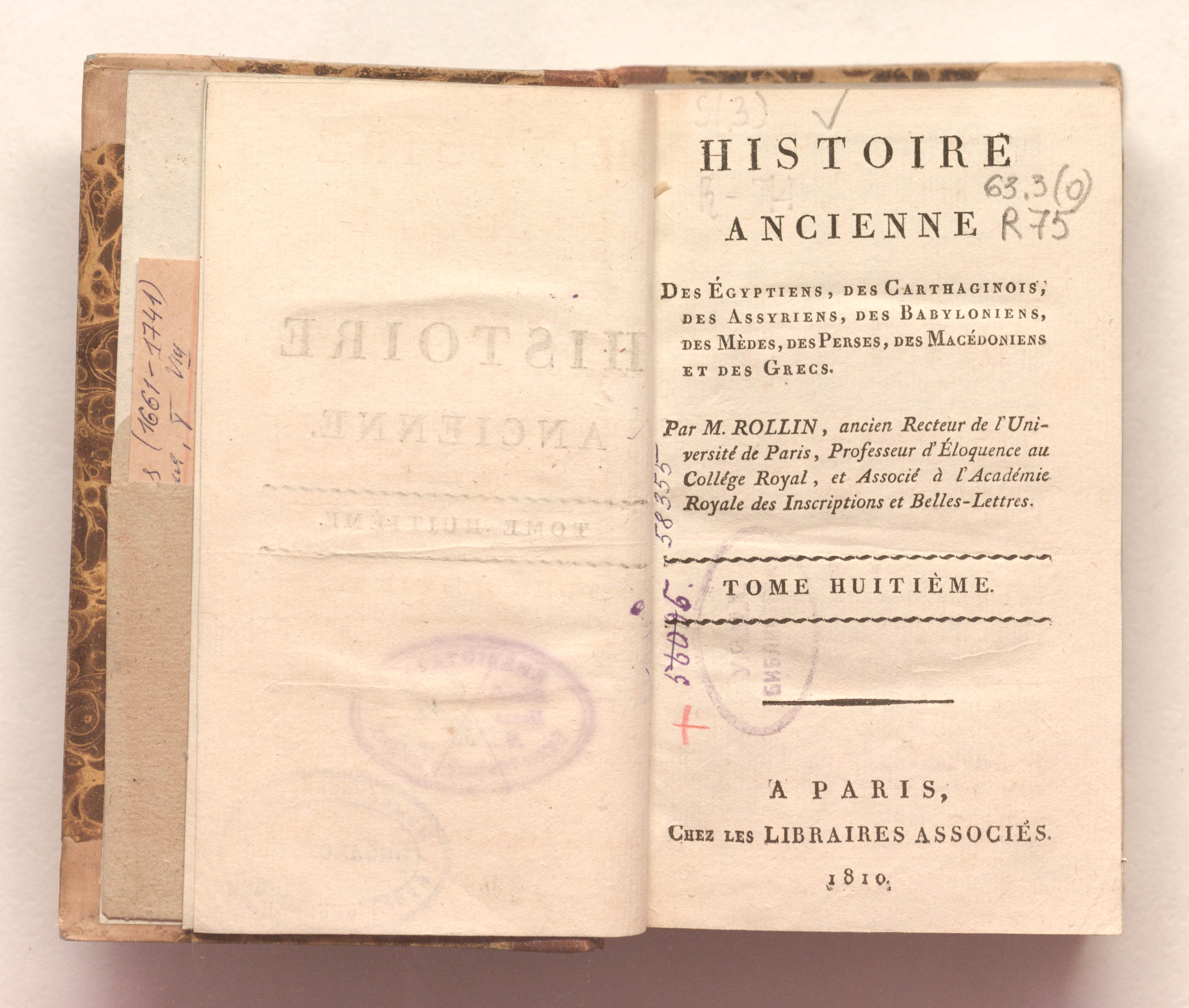 Древняя история египтян, карфагенян, ассирийцев, вавилонян, мидян и персов, македонцев, греков. – Т. 6. – Париж : Объединенные книготорговцы, 1809. – 536 с.; 10,5х16,5 см.