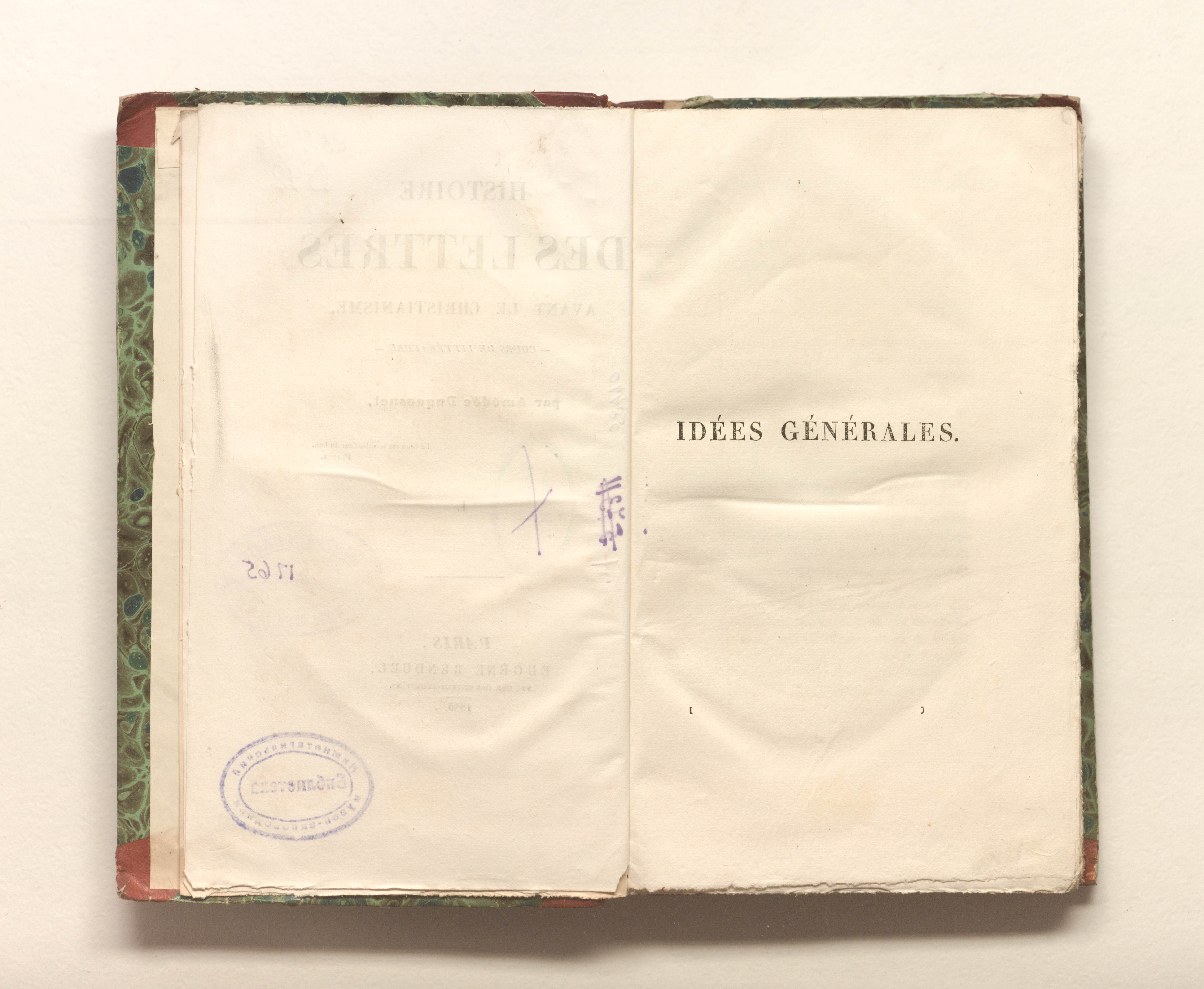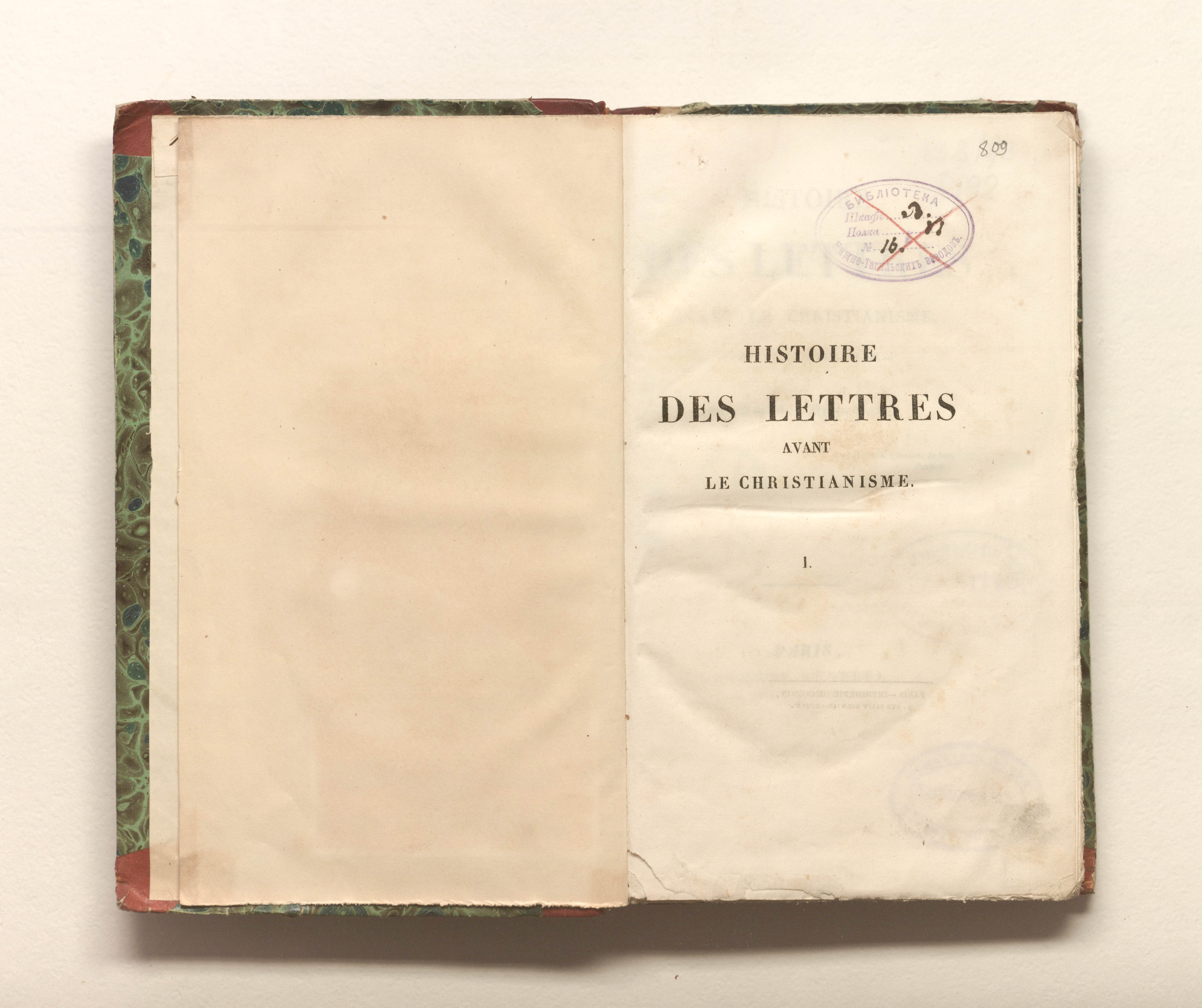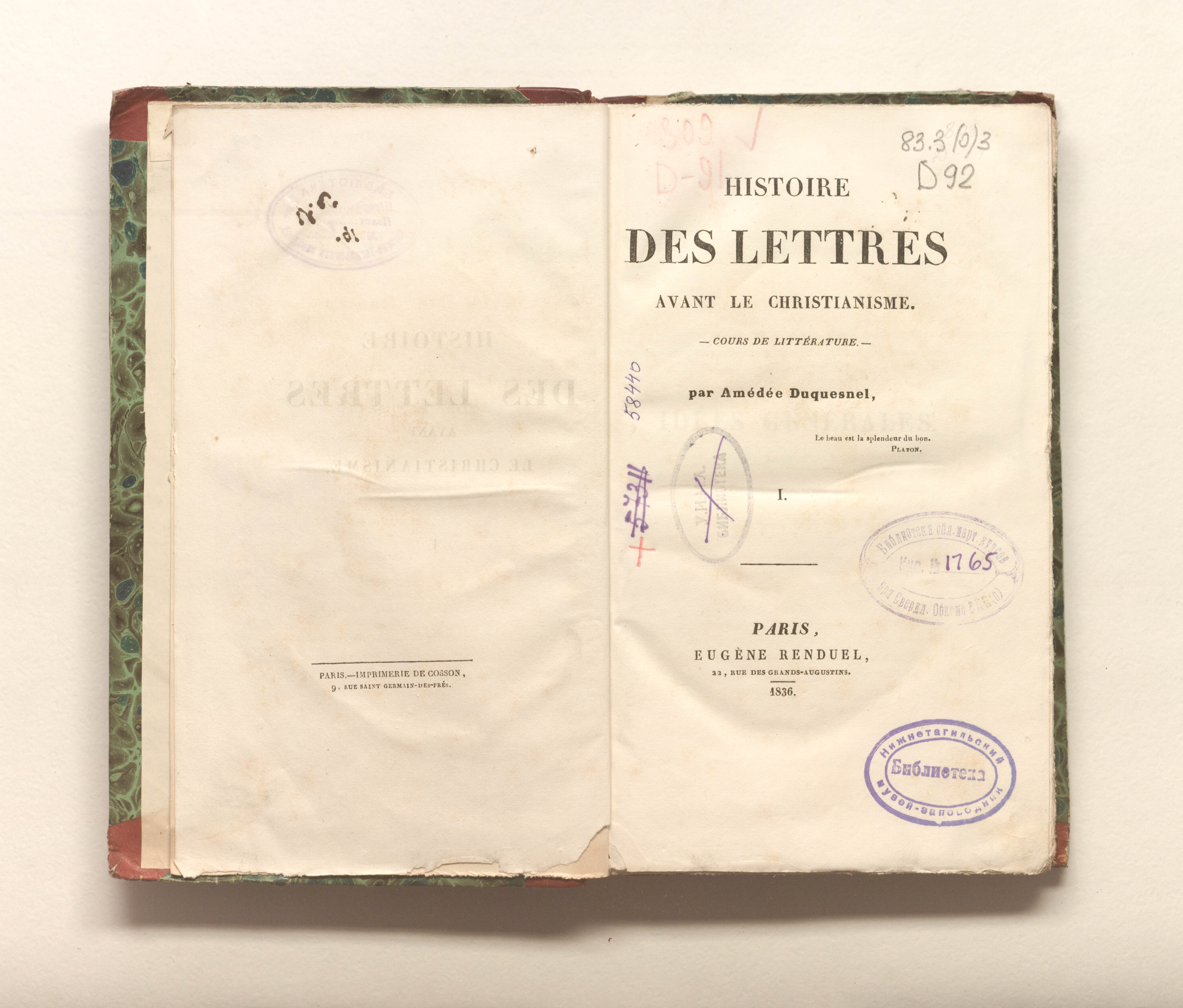 Histoire des lettres avant le christianisme. Cours de litterature . Par Amedee Duquesnel. Tome I / A. Duquesnel. T. 1 (En 2). — Paris : E. Renduel, 1836. — 368 p. : 23,5х14,5 cm.
