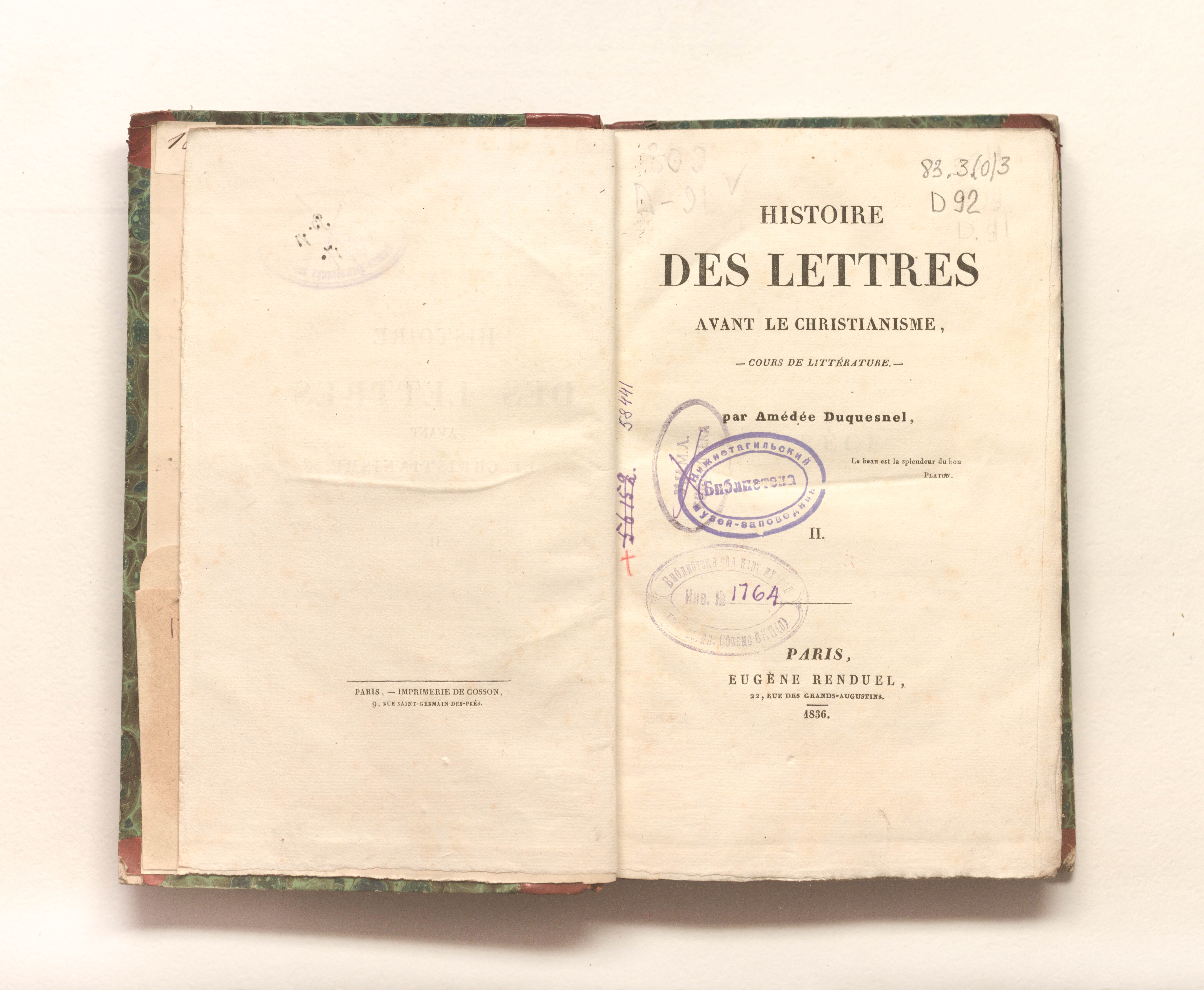 Histoire des lettres avant le christianisme. Cours de litterature . Par Amedee Duquesnel. Tome II / A. Duquesnel. T. 2 (En 2). — Paris : E. Renduel, 1836. — 416 p. : 23,5х14,5 cm.