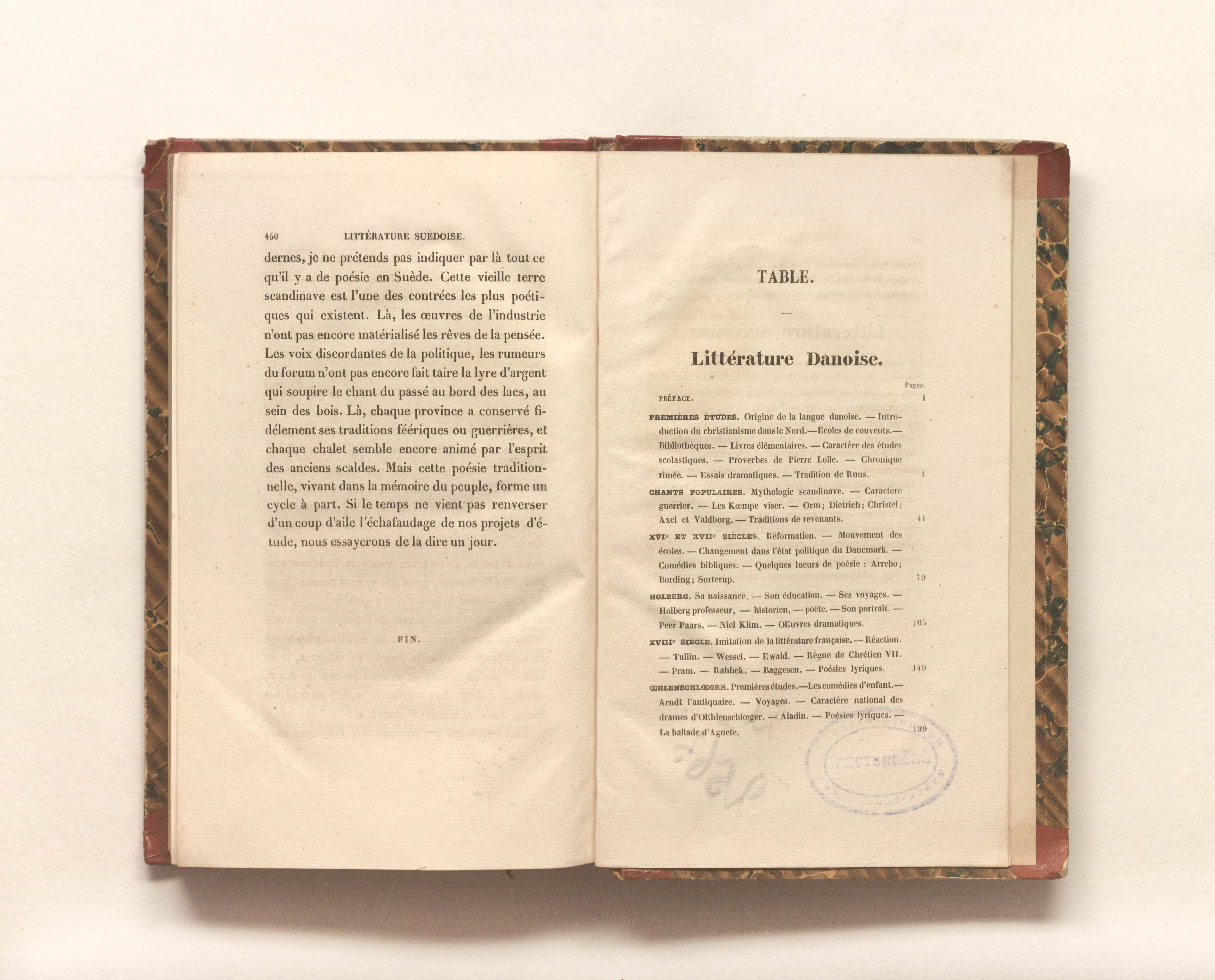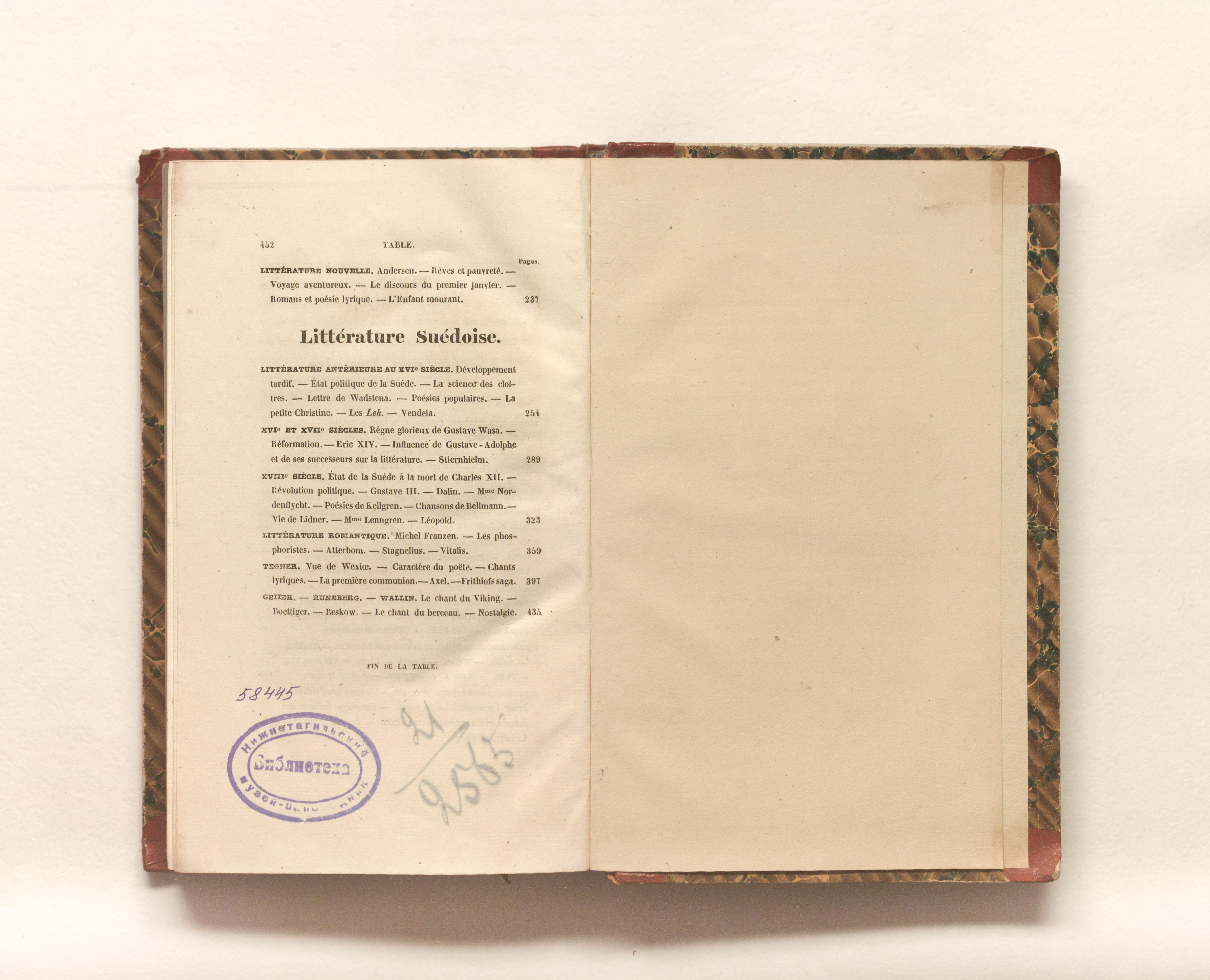 История литературы Дании и Швеции / К. Мармье. — Париж : Ф. Боннер, 1839. — VIII, 452 с. ; 21,5х13,5 см.