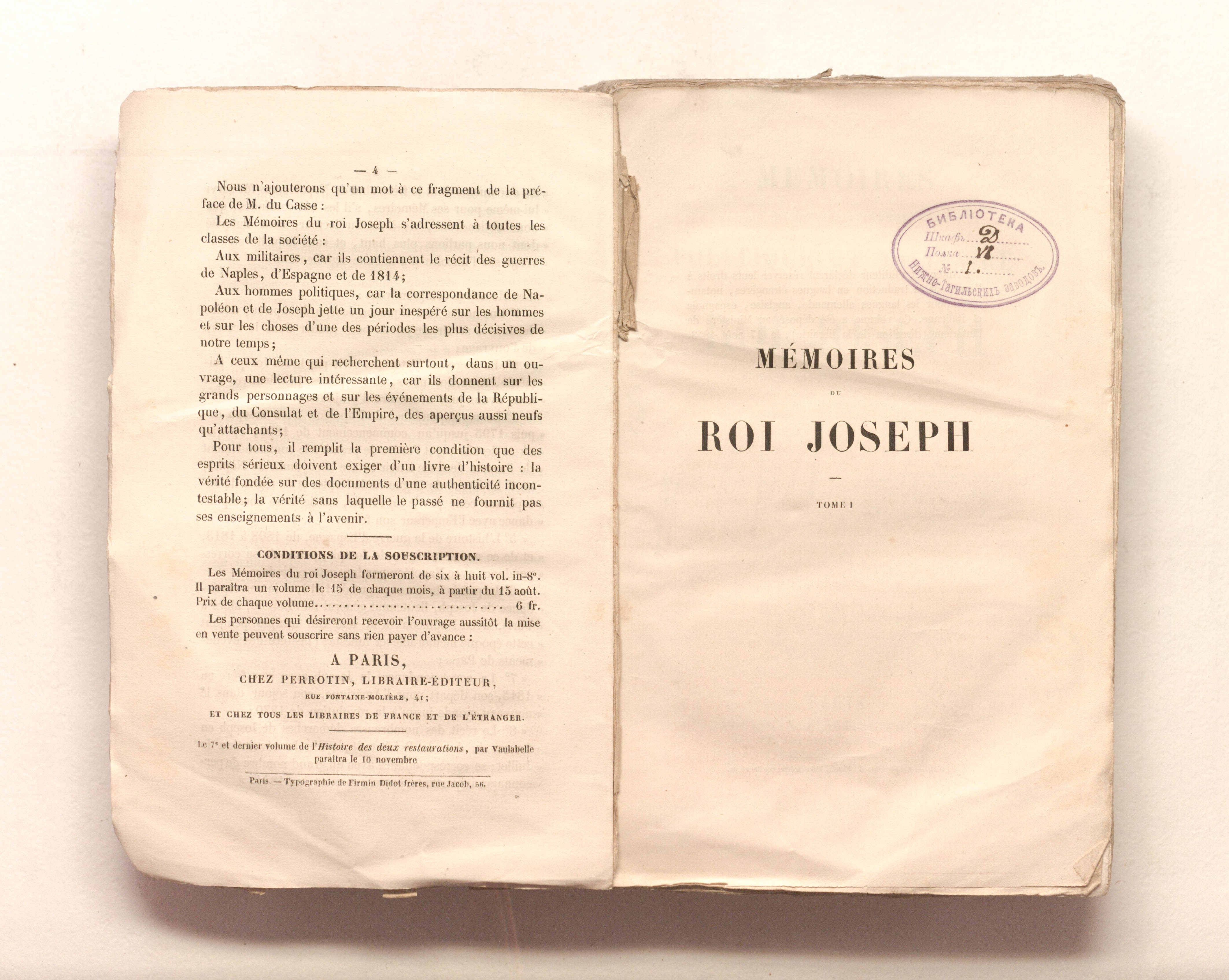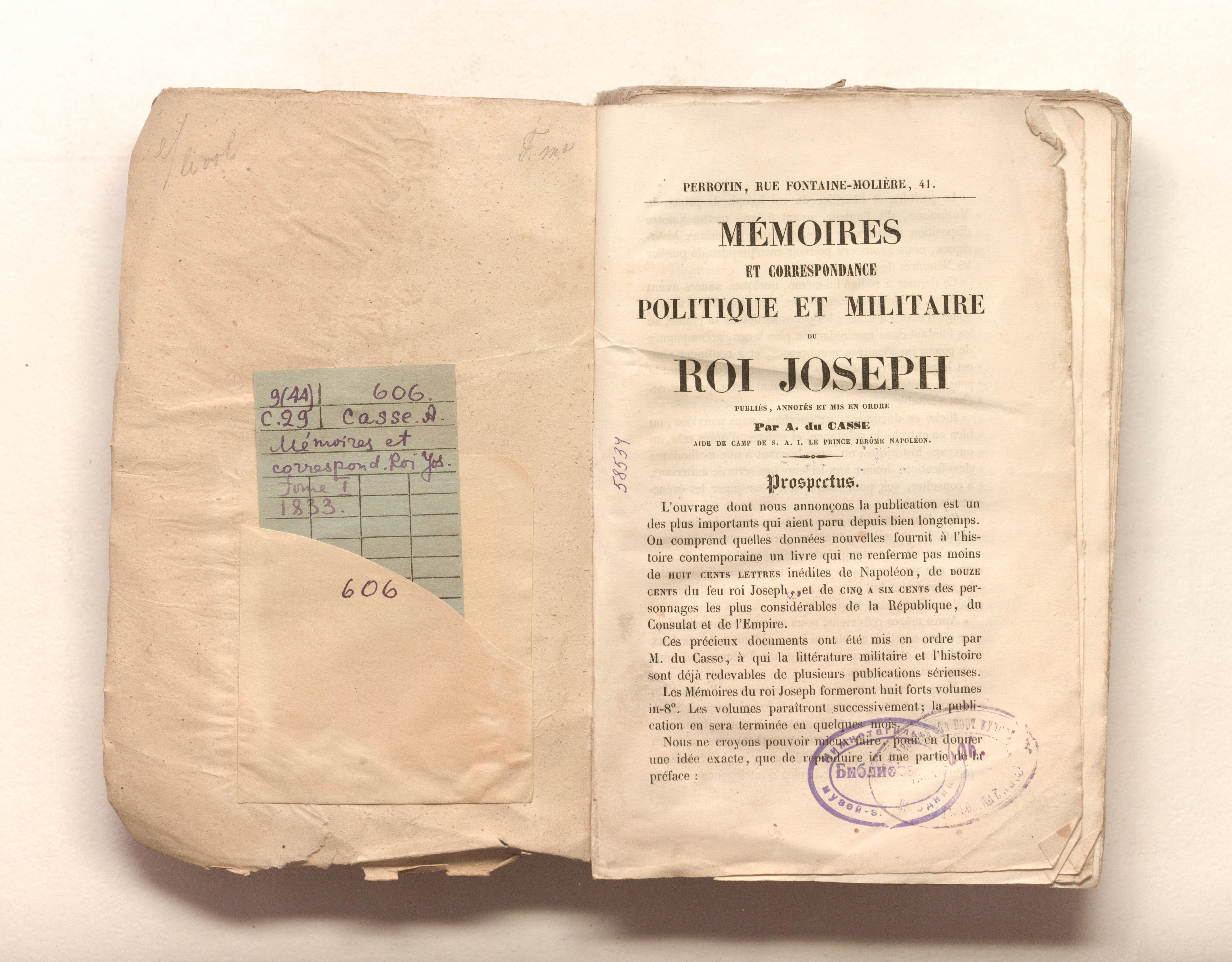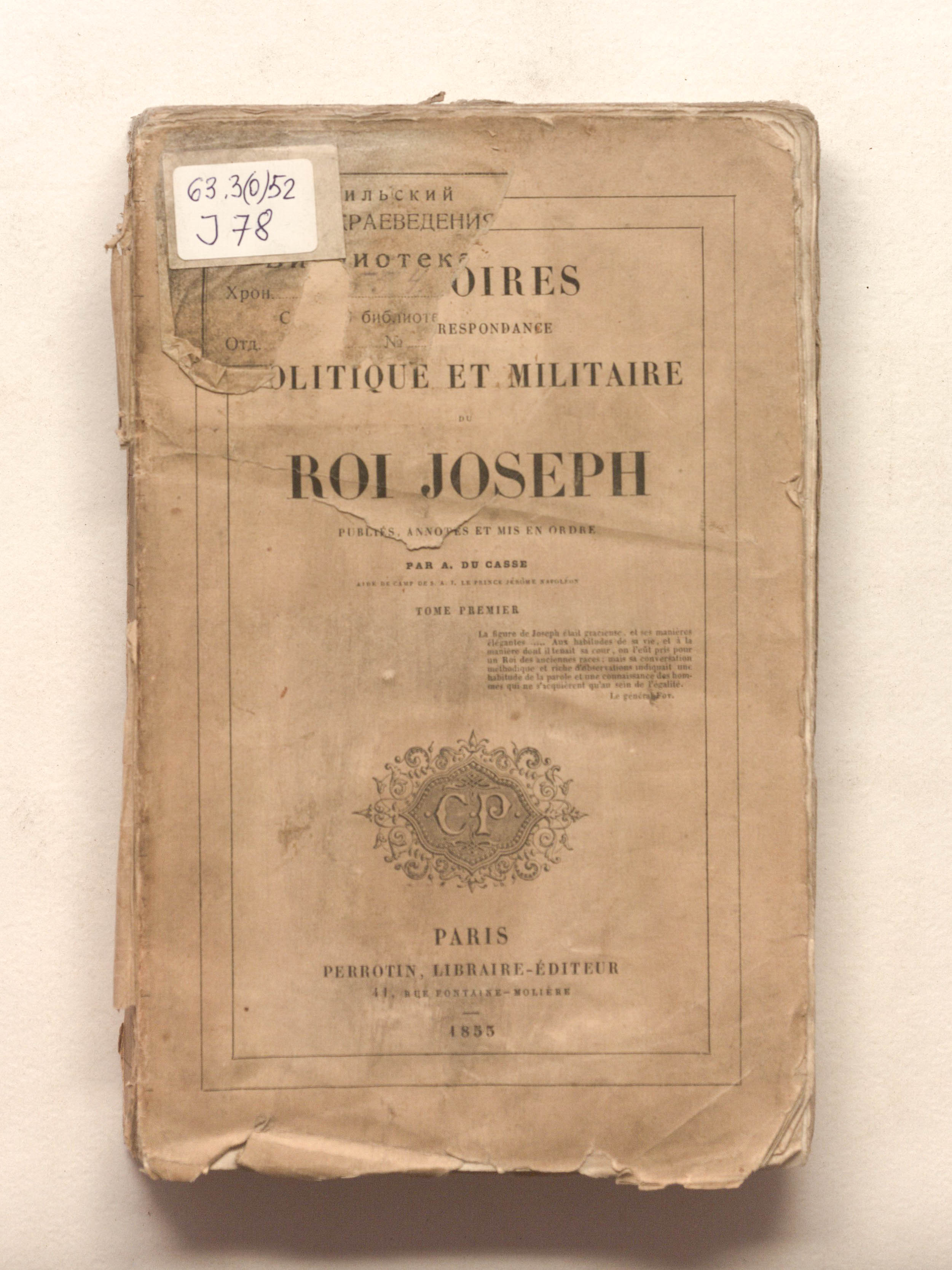 Memoires et correspondance politique et militaire du roi Joseph. Publies, annotes et mis en ordre par A. Du Casse, ... Tome premier. - Paris : Perrotin, 1853. - 4, 364, 8 p. ; 14,5х22,5 cm.