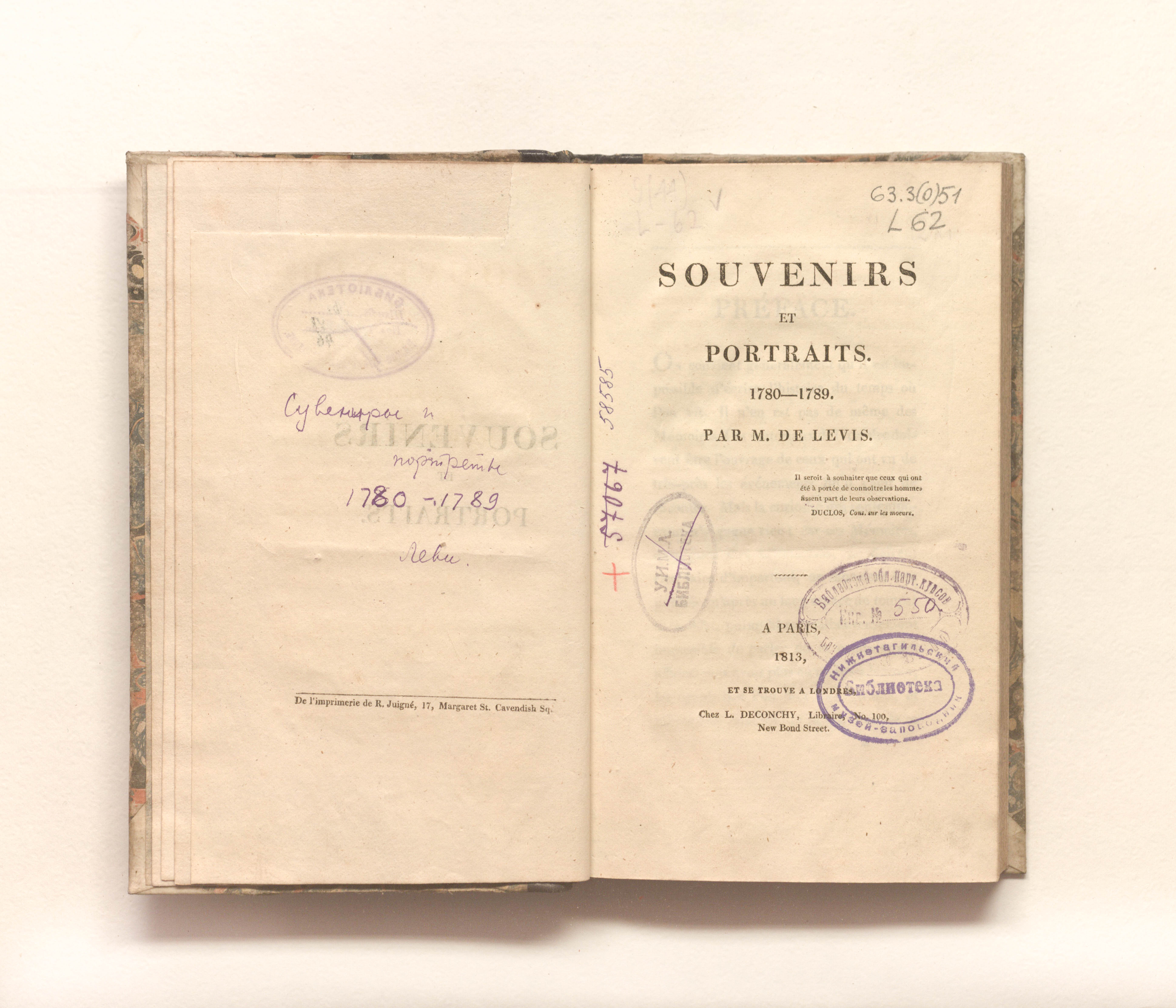 Souvenirs et portraits. 1780-1789. Par M. de Levis / G. de Levis. — Paris; Londres : L. Deconchy, 1813. — XXIII, 268, [1] p. ; 21х12,5cm.