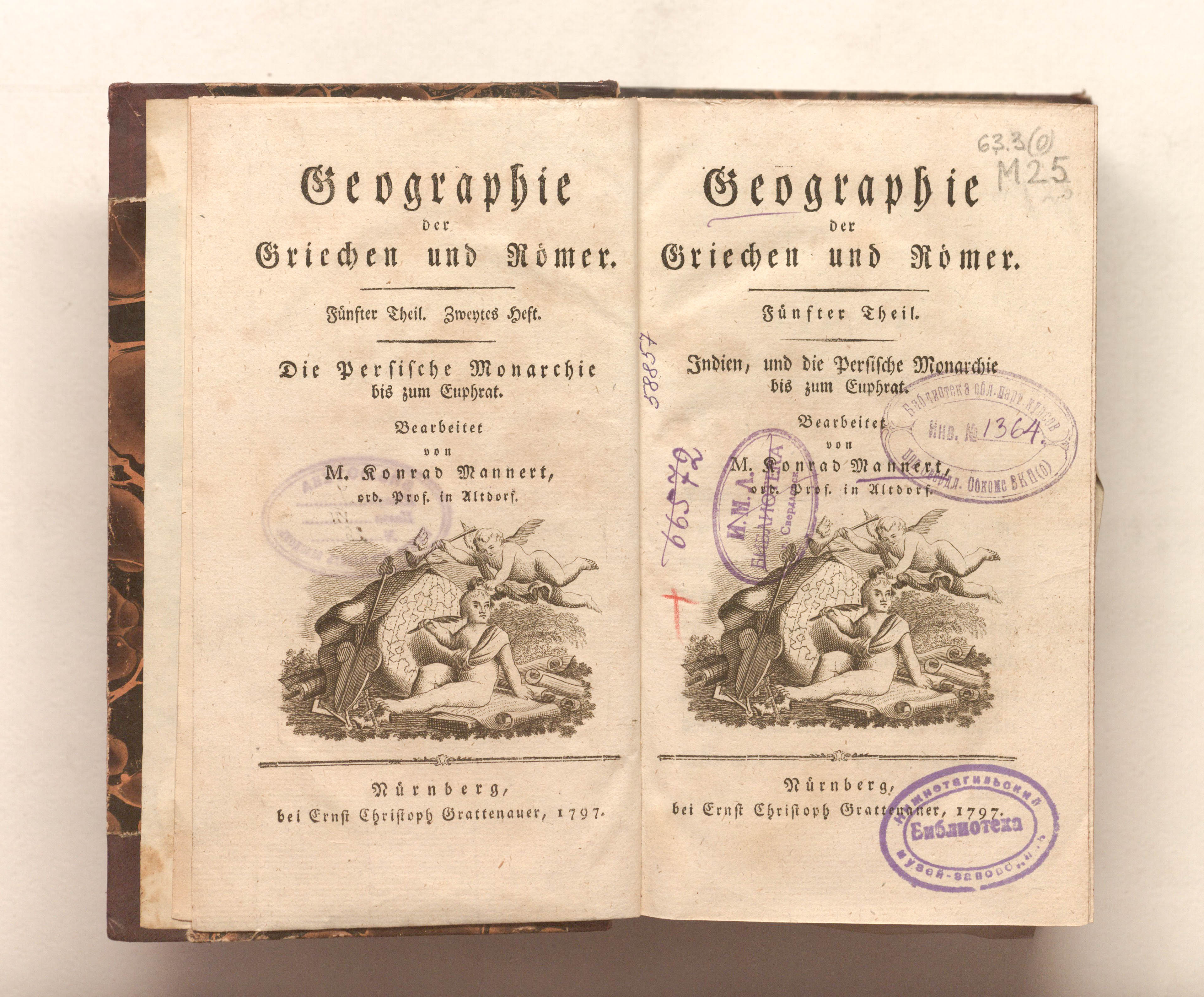 Mannert, Conrad (1756-1834). Geographie der Griechen und Roemer. Fuenfter Theil. Indien, und die Persische Monarchie bis zum Euphrat. Fuenfter Theil, Zweytes Heft. Die Persische Monarchie bis zum Euphrat. - Nuernberg: Grattenauer, 1797. - XXIV, 308; 547, [1] s., 2 gef. Kart.; 13х21cm.