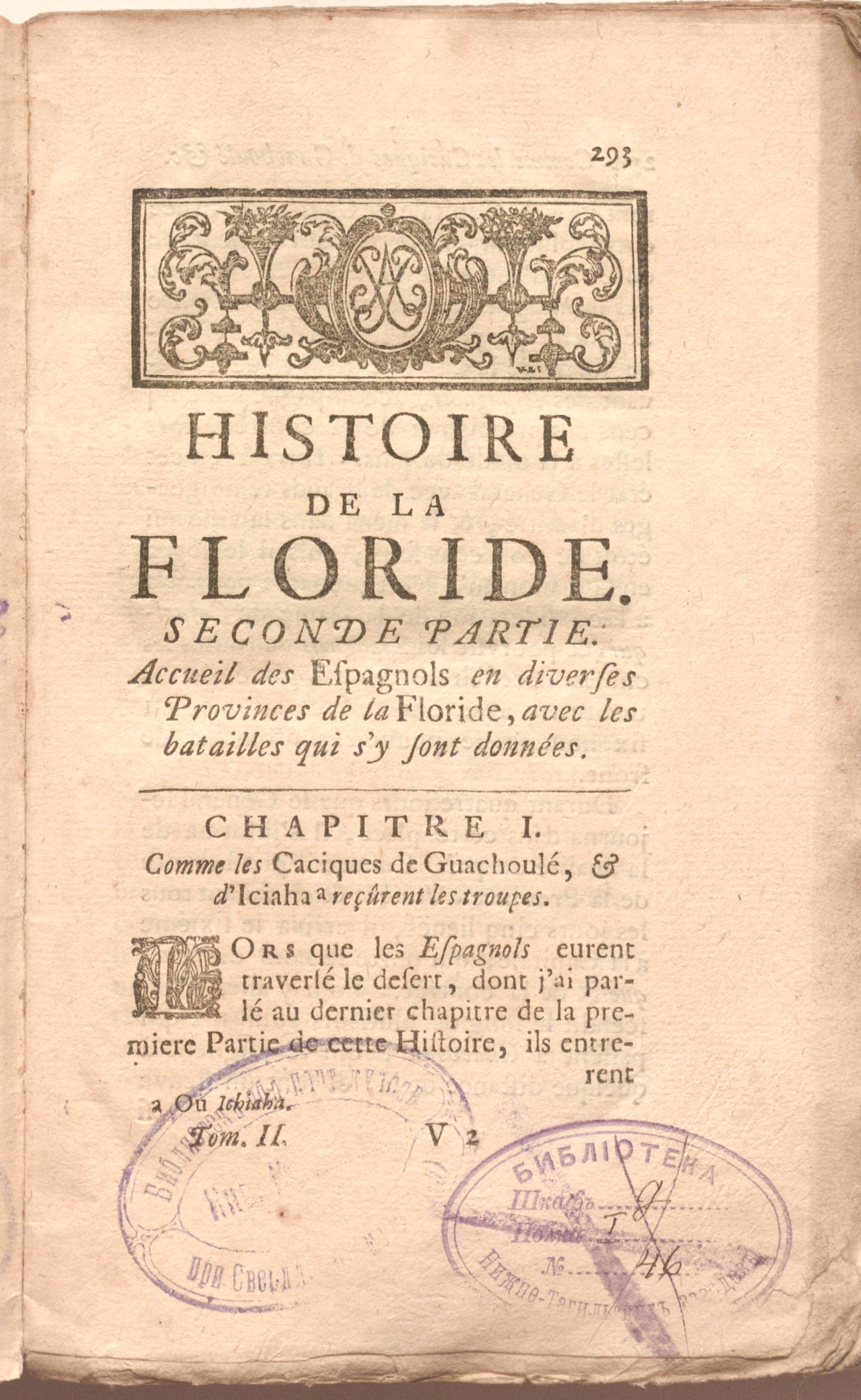 История завоевания Флориды, или Рассказ о том, что произошло при открытии этой страны Фердинандом де Сото; составлено на испанском языке Инкой Гарсиласо де Ла Вега и переведено на французский сэром Пьером Ришеле. – 2 т. – Т. 2. – Лейден : П. Ван дер Аа, 1731, – 290 (293-582) с., 3 ил. ; 12х18 см.