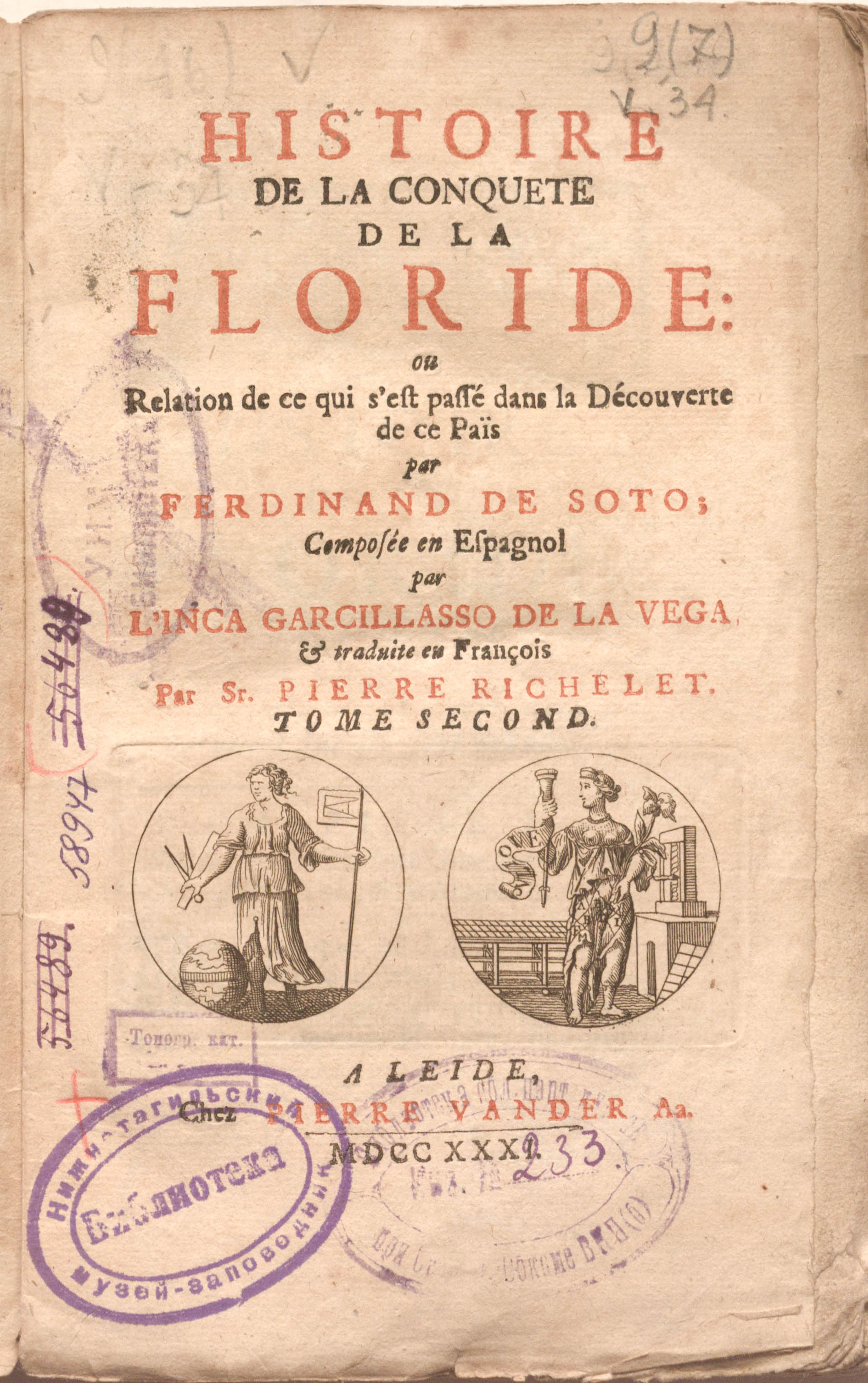 Histoire de la conquete de la Floride, ou Relation de ce qui s'est passe dans la decouverte de ce pais par Ferdinand de Soto ; composee en espagnol par l'Inca Garcillasso de La Vega et traduite en francois par Sr. Pierre Richelet. 2 т. – Т. 2. - Leide : P. Van der Aa, 1731. - 290 (293-582) p.ю 3 pl. ; 12x18 cm.
