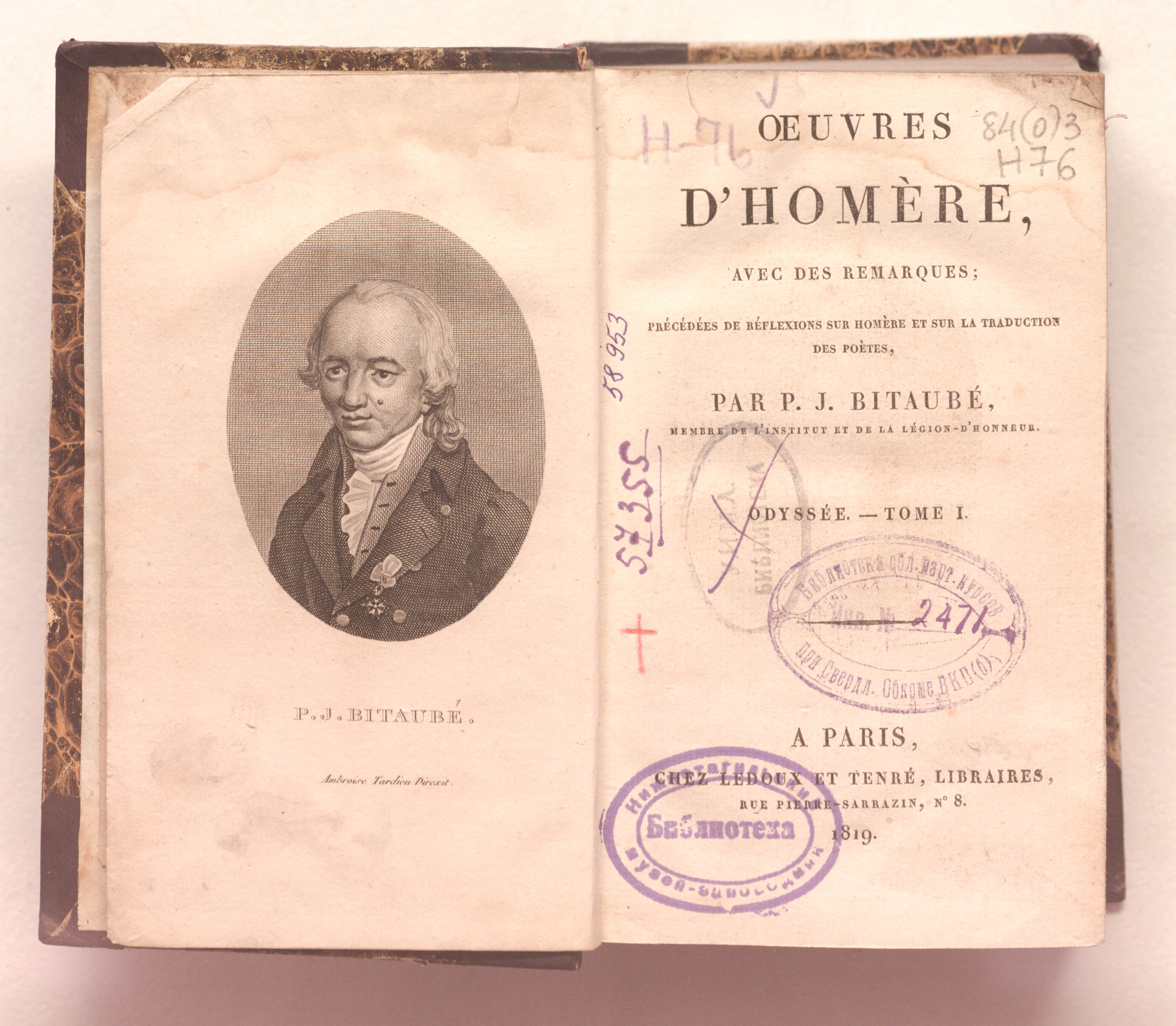 Одиссея. Тома I–II / Произведения Гомера, с примечаниями, предваряемыми размышлениями о Гомере и о переводах поэтов, П.-Ж. Битобе. – 4 т. – Т. 3-4. – Париж : Леду и Тенре, 1819. – IV, 431; 451 с. : 2 грав. фронт. ; 10х17 см.