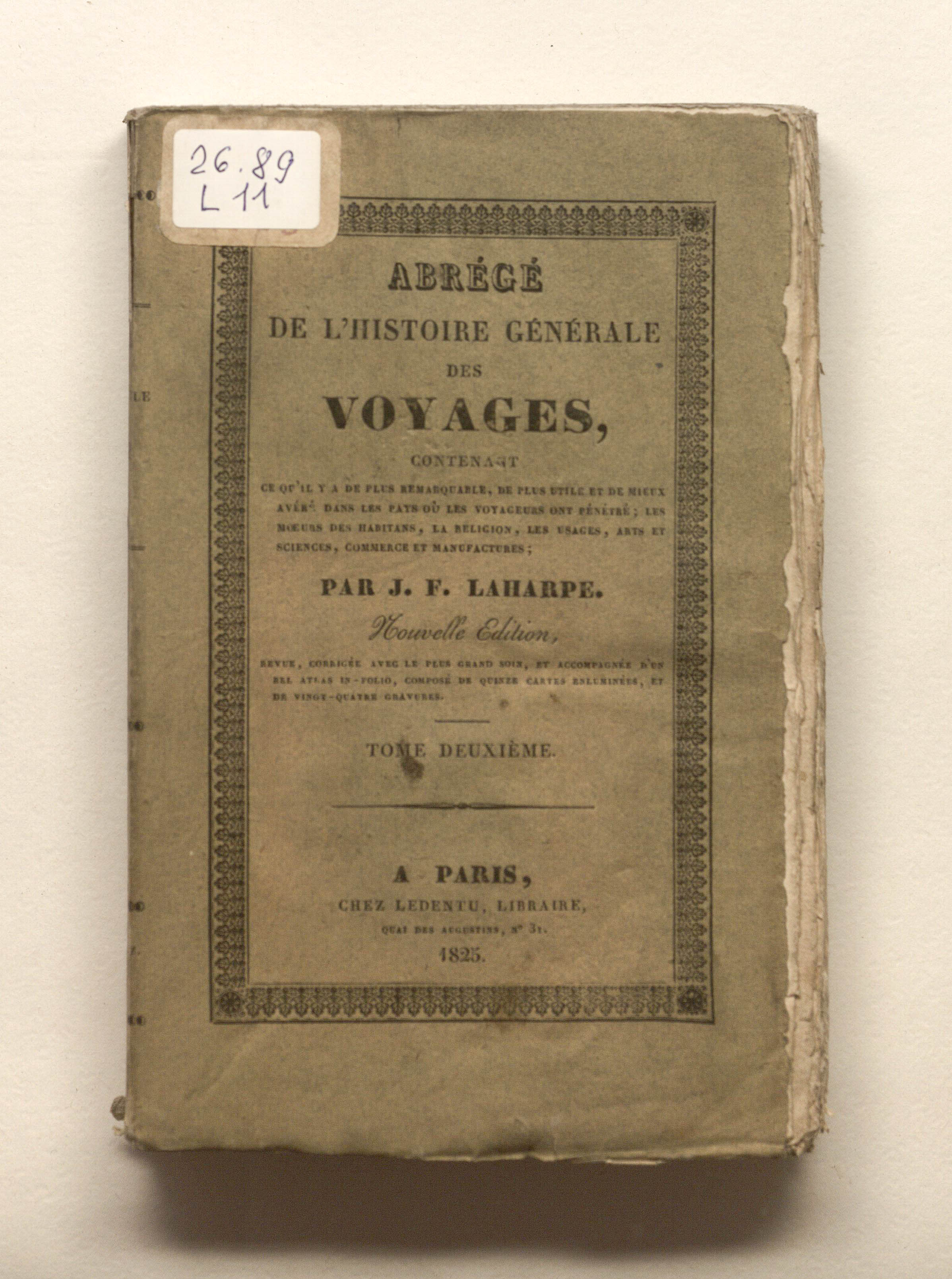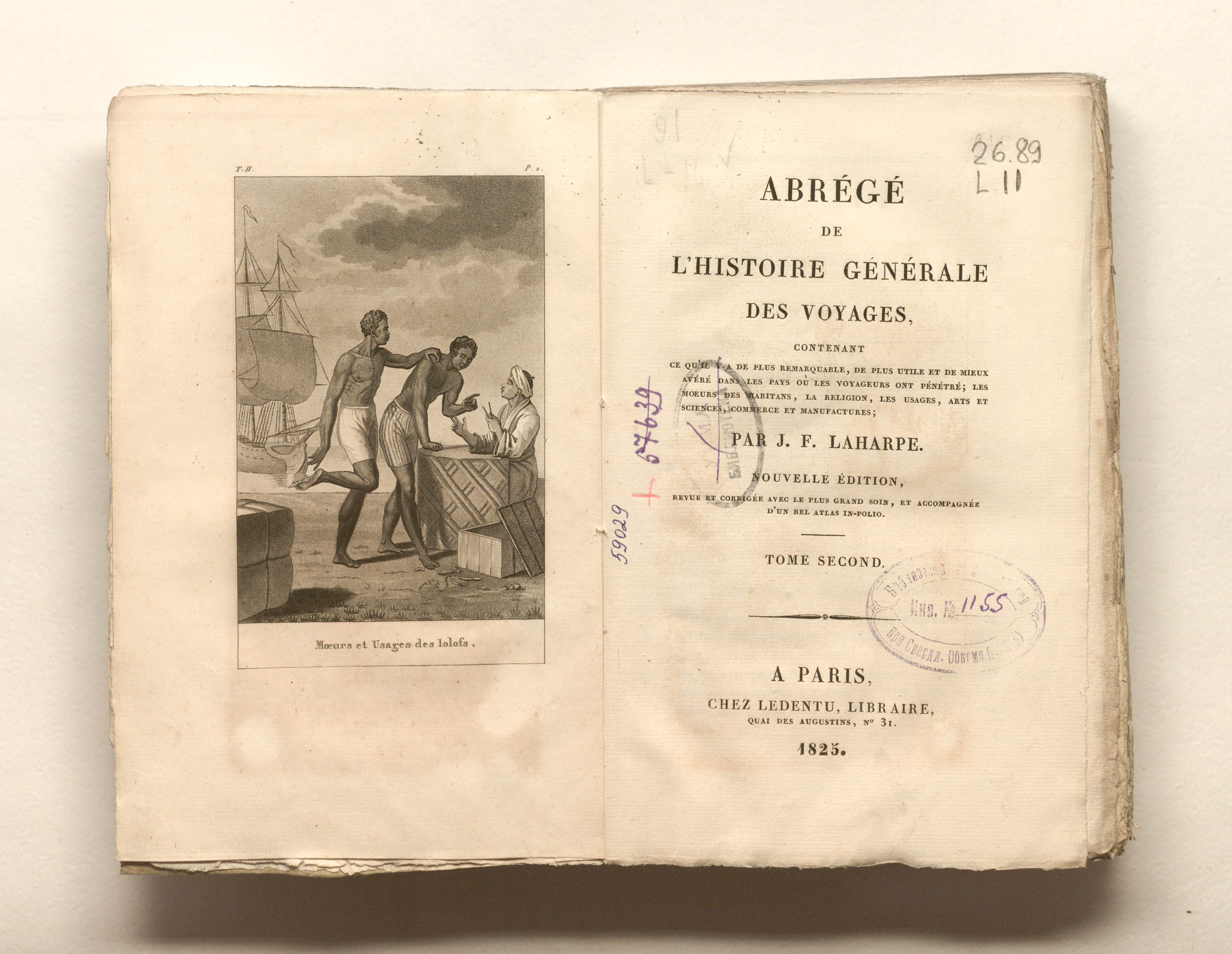 Лагарп Жан Франсуа де. Краткая всеобщая история путешествий, содержащая всё самое замечательное, самое полезное и лучше всего проверенное в странах, куда проникли путешественники: нравы жителей, религия, обычаи, искусство и наука, торговля, промышленное производство. Г-на де Лагарпа. Новое издание. Том второй. - Париж: Ледентю, 1825. - 480, [1] с. : грав. фронт. ; 13,5х21 см.
