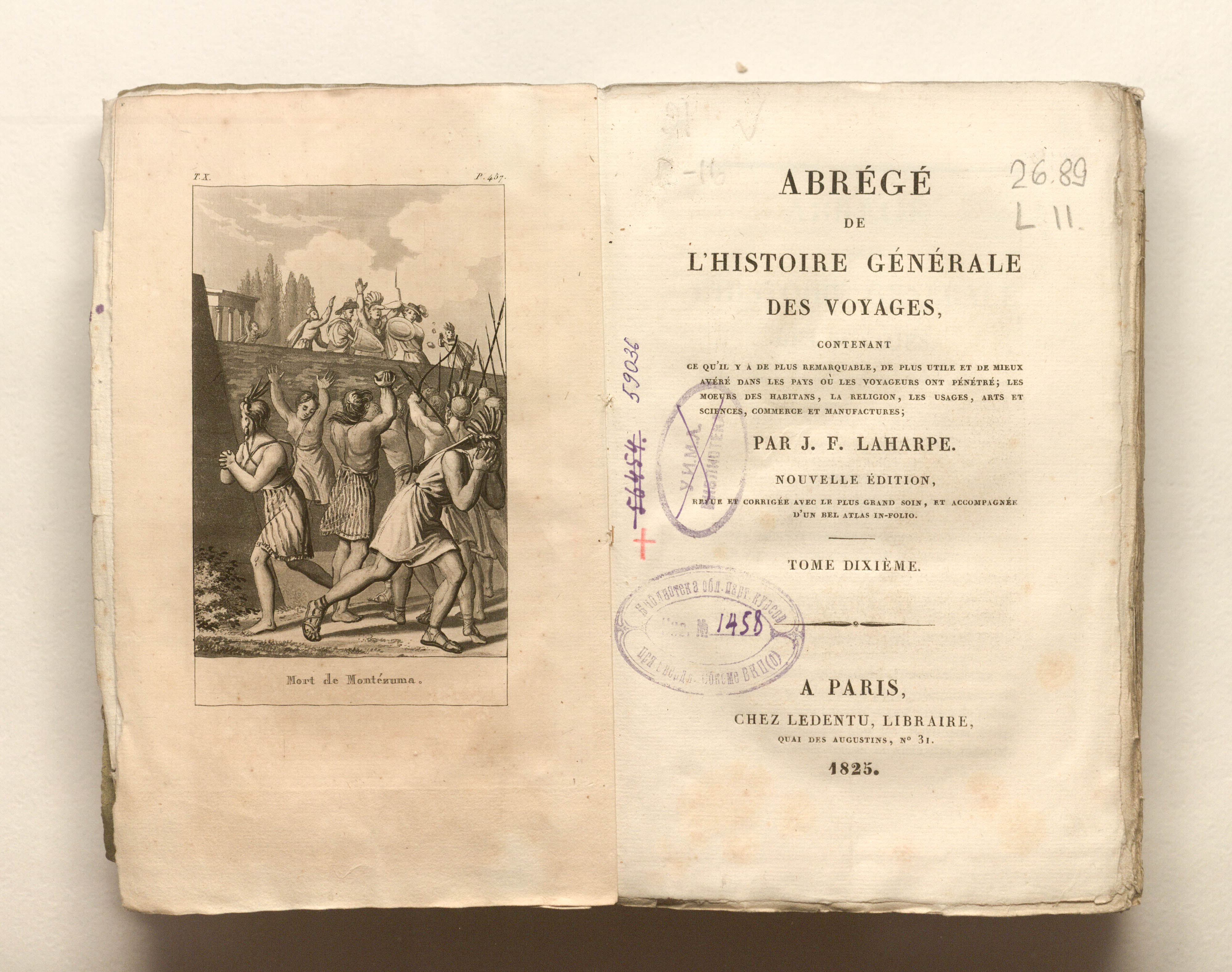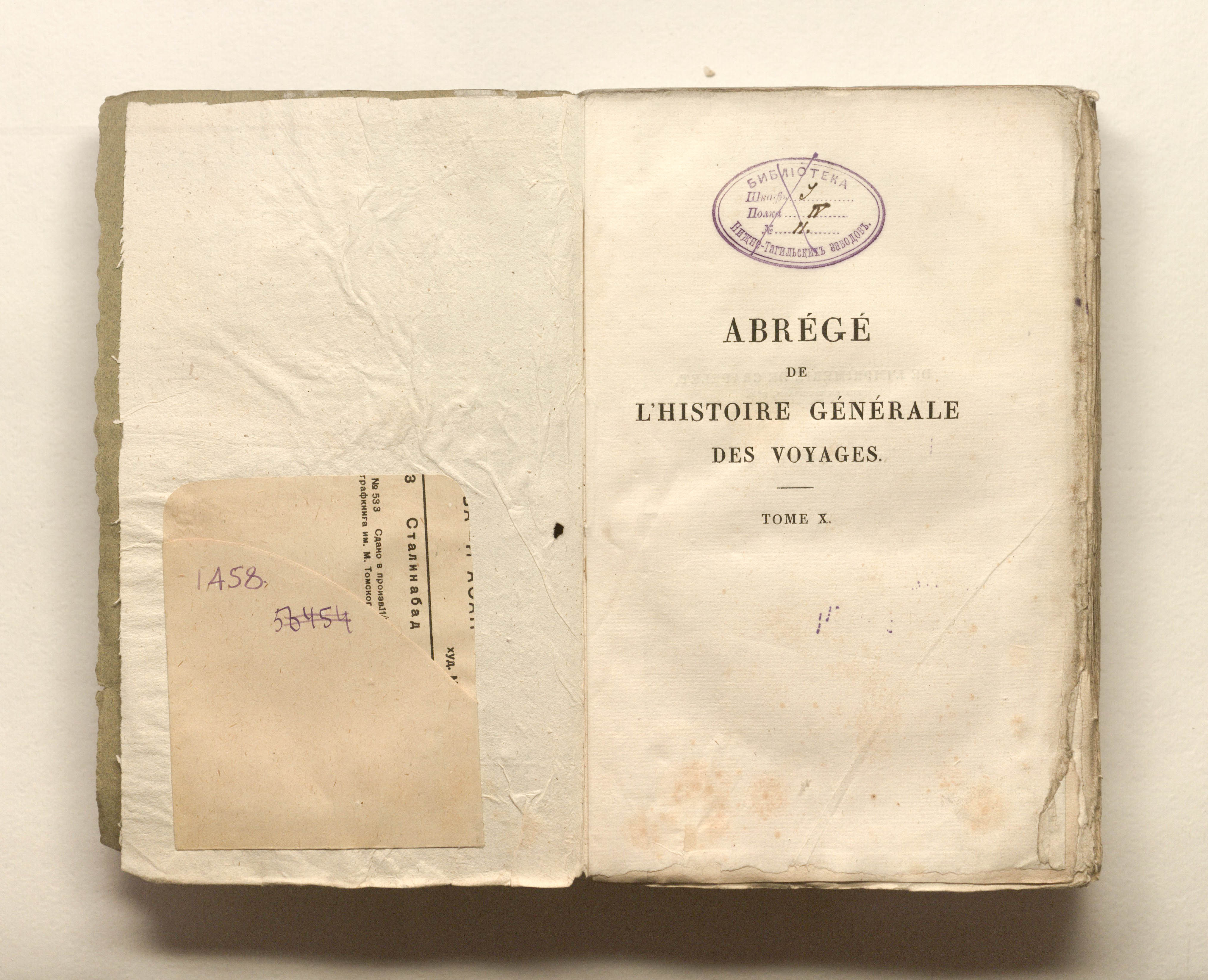 Лагарп Жан Франсуа де. Краткая всеобщая история путешествий, содержащая всё самое замечательное, самое полезное и лучше всего проверенное в странах, куда проникли путешественники: нравы жителей, религия, обычаи, искусство и наука, торговля, промышленное производство. Г-на де Лагарпа. Новое издание. Том десятый. - Париж: Ледентю, 1825. - 586, [1] с. : грав. фронт. ; 13,5х21 см.