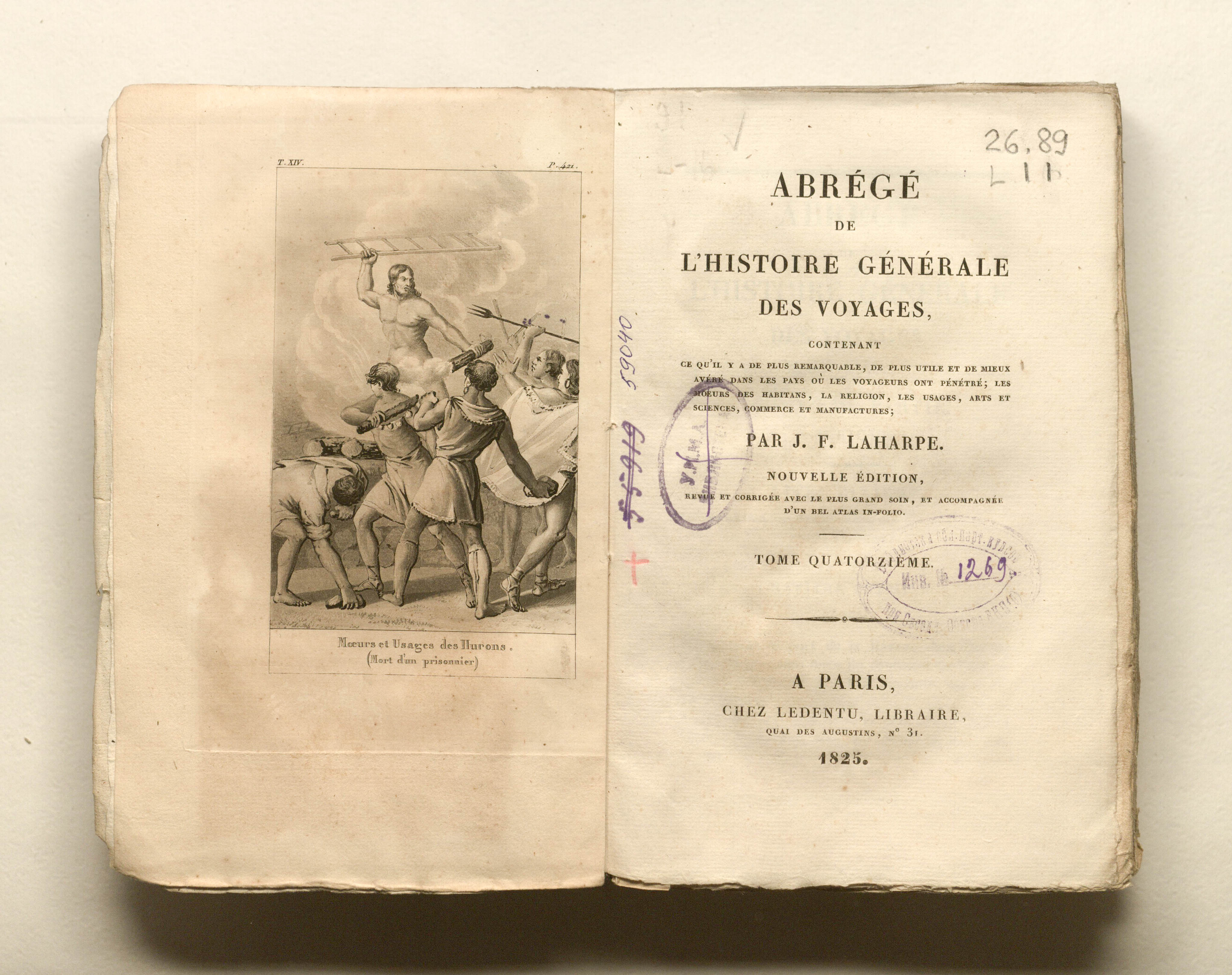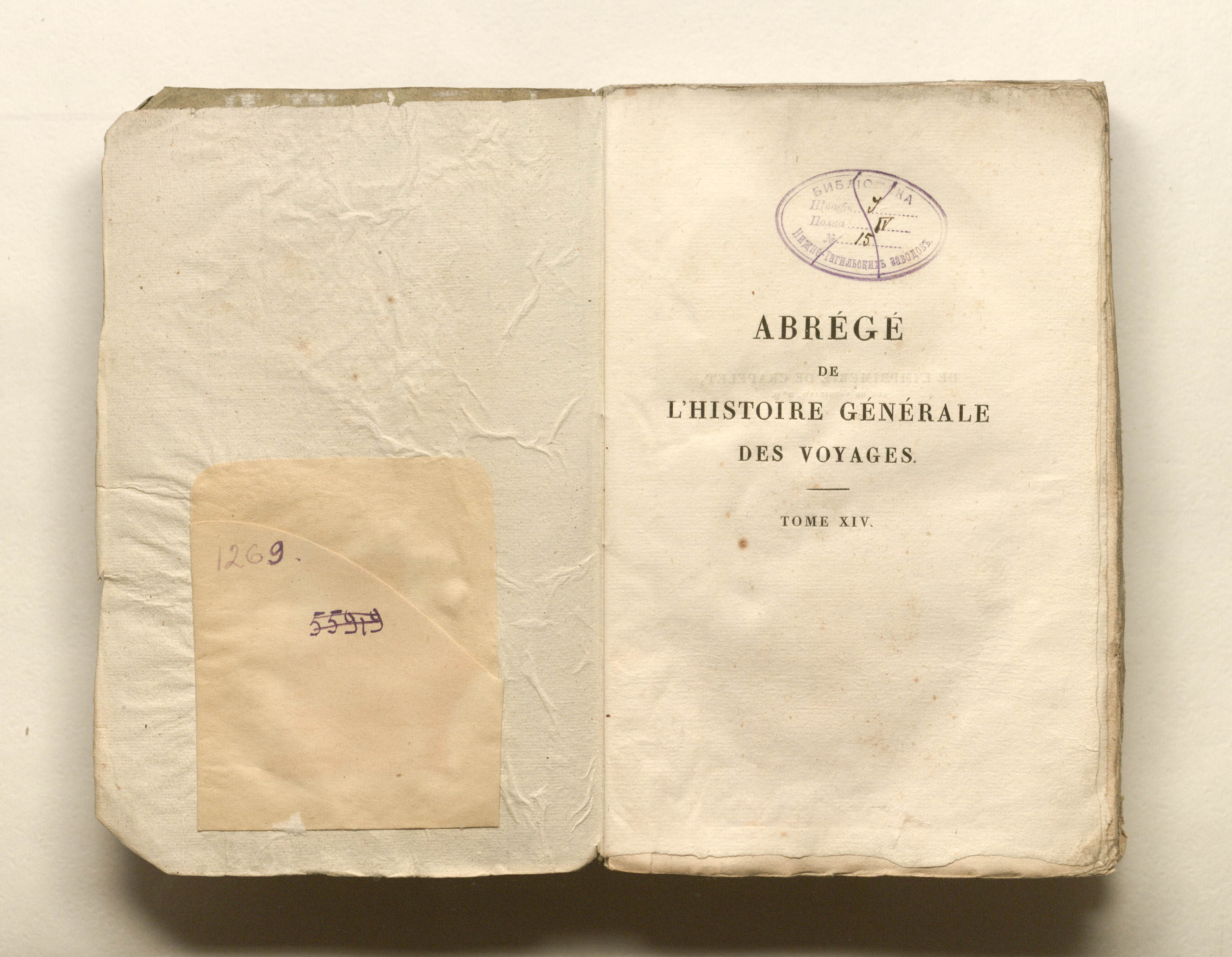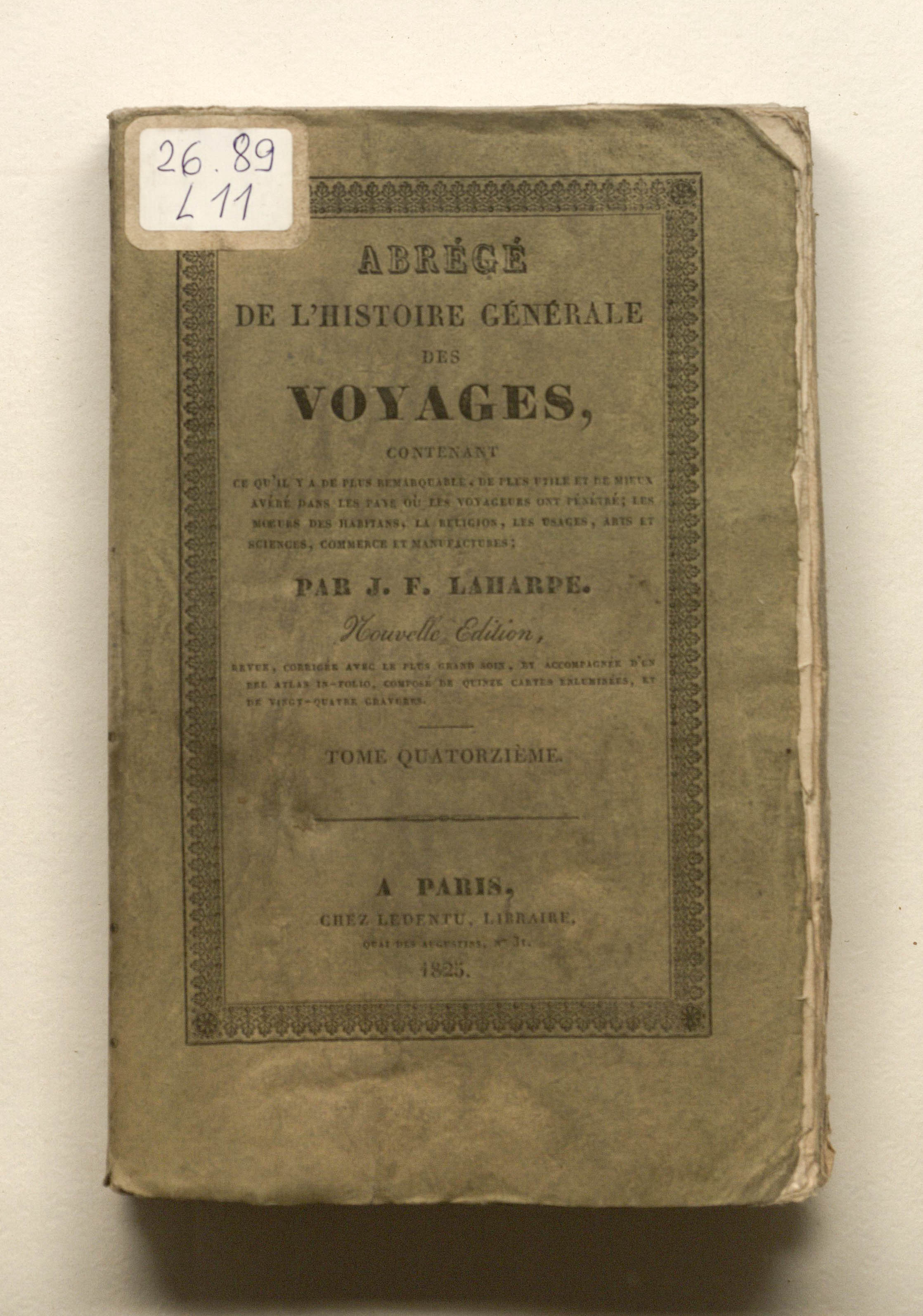 Лагарп Жан Франсуа де. Краткая всеобщая история путешествий, содержащая всё самое замечательное, самое полезное и лучше всего проверенное в странах, куда проникли путешественники: нравы жителей, религия, обычаи, искусство и наука, торговля, промышленное производство. Г-на де Лагарпа. Новое издание. Том четырнадцатый. - Париж: Ледентю, 1825. - 522, [1] с. : грав. фронт. ; 13,5х21 см.