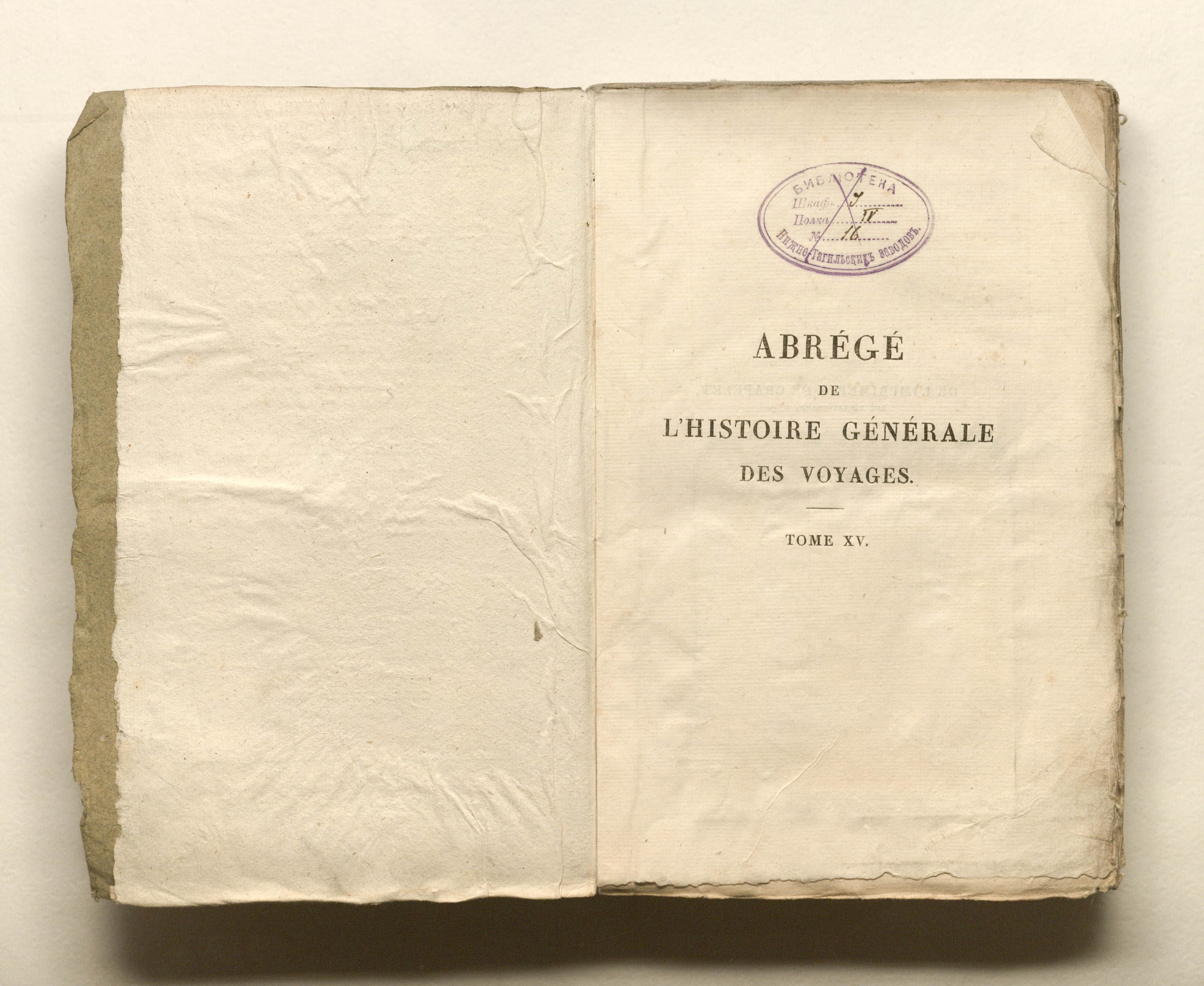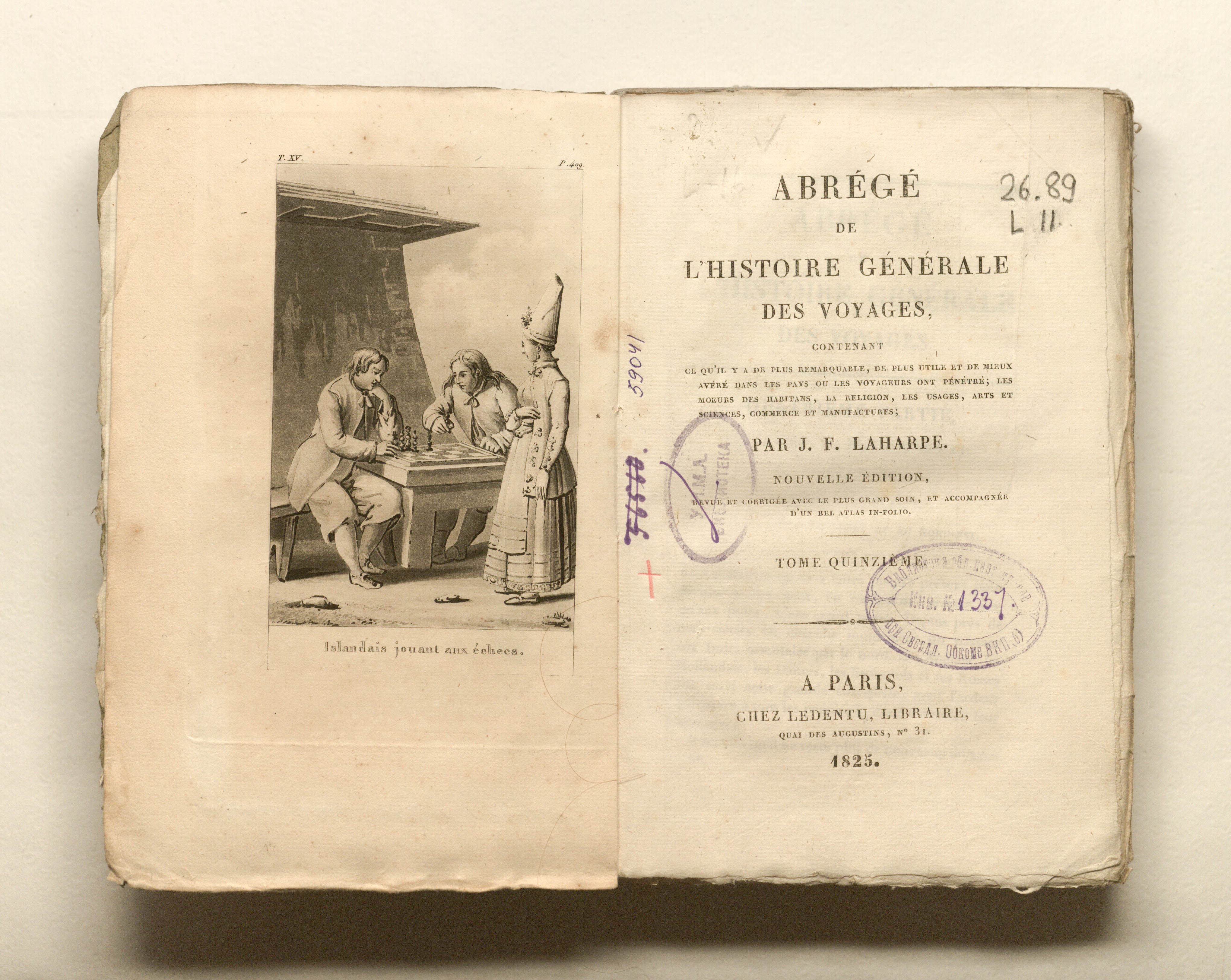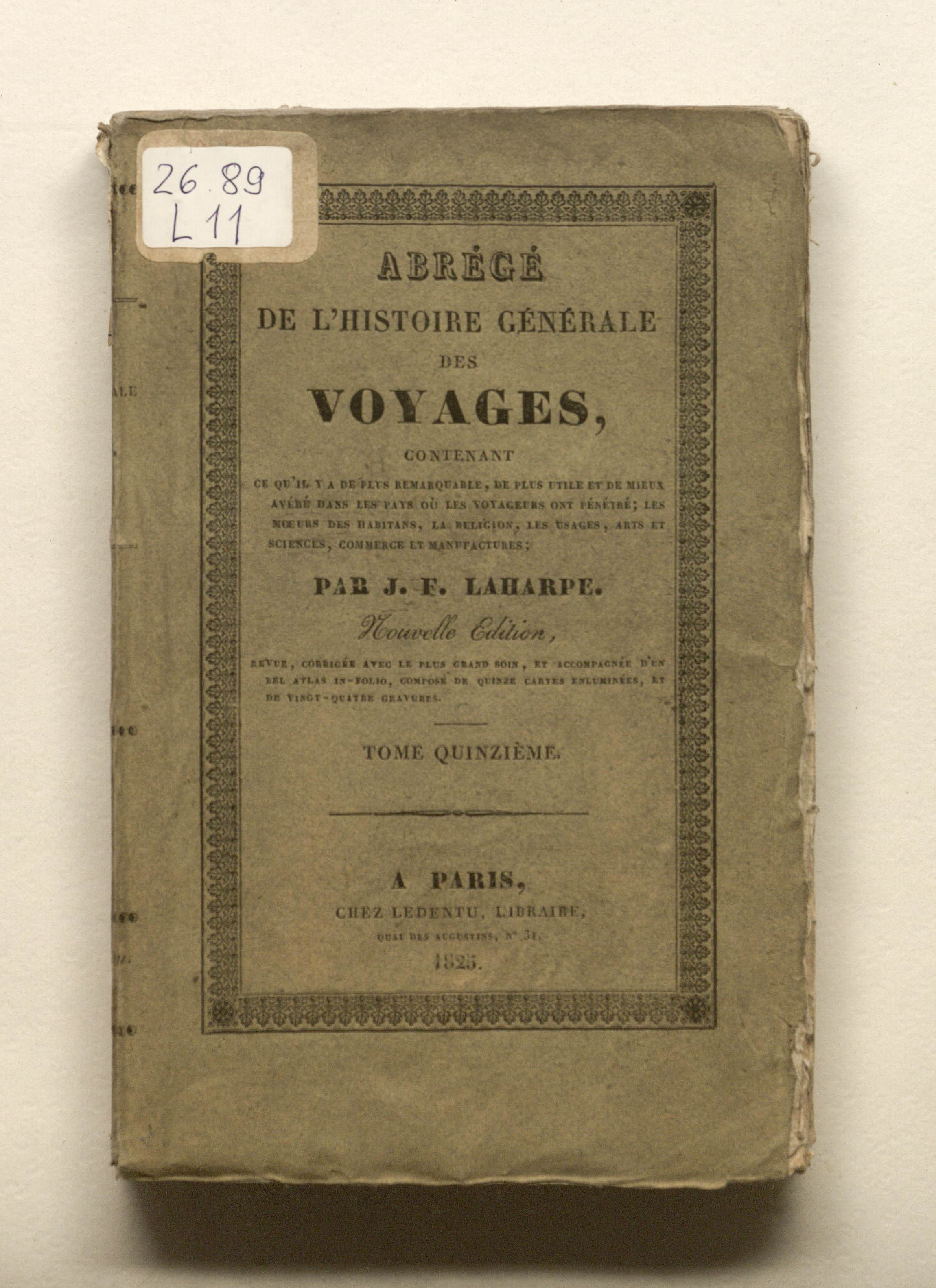 Лагарп Жан Франсуа де. Краткая всеобщая история путешествий, содержащая всё самое замечательное, самое полезное и лучше всего проверенное в странах, куда проникли путешественники: нравы жителей, религия, обычаи, искусство и наука, торговля, промышленное производство. Г-на де Лагарпа. Новое издание. Том пятнадцатый. - Париж: Ледентю, 1825. - 415, [1] с. : грав. фронт. ; 13,5х21 см.
