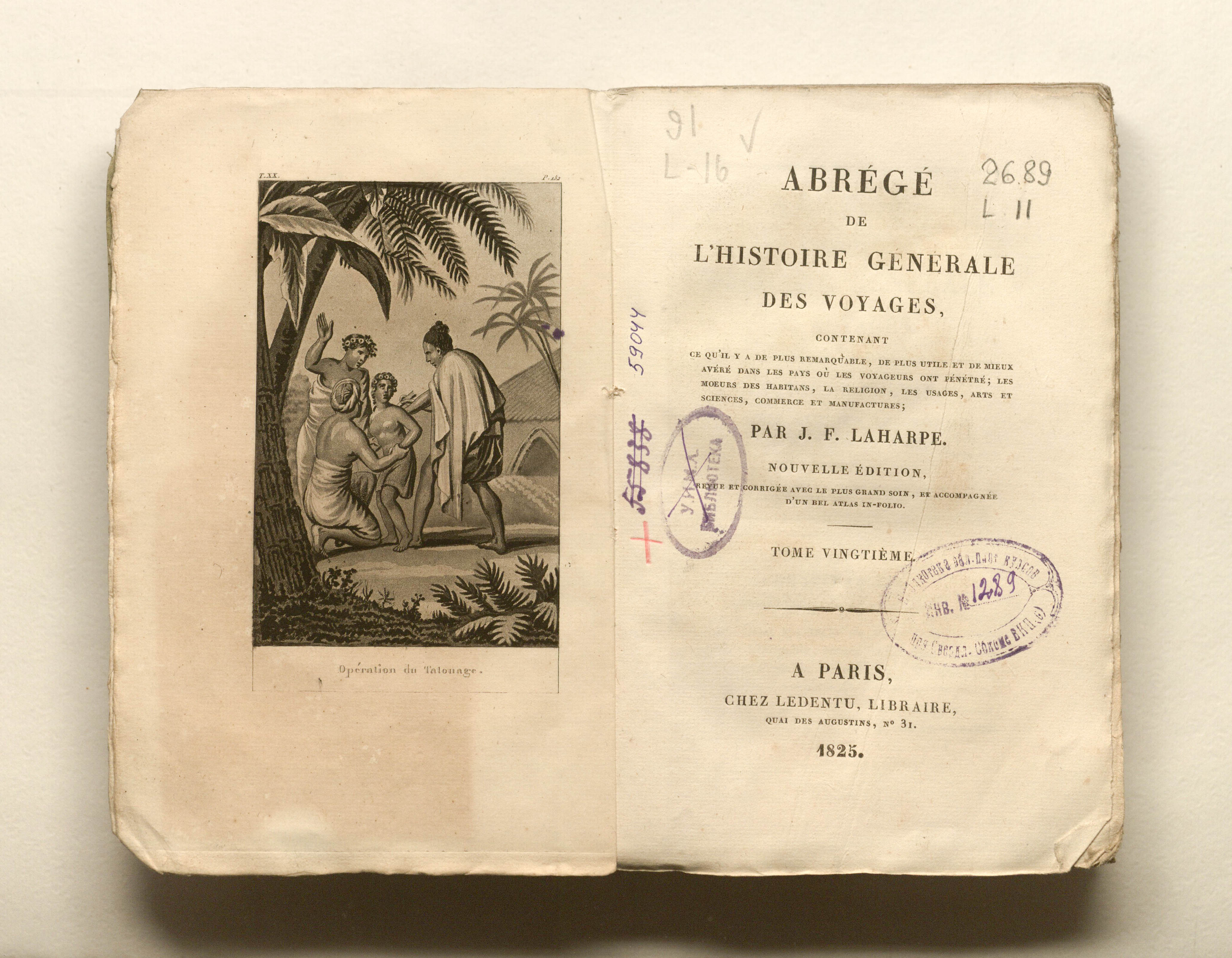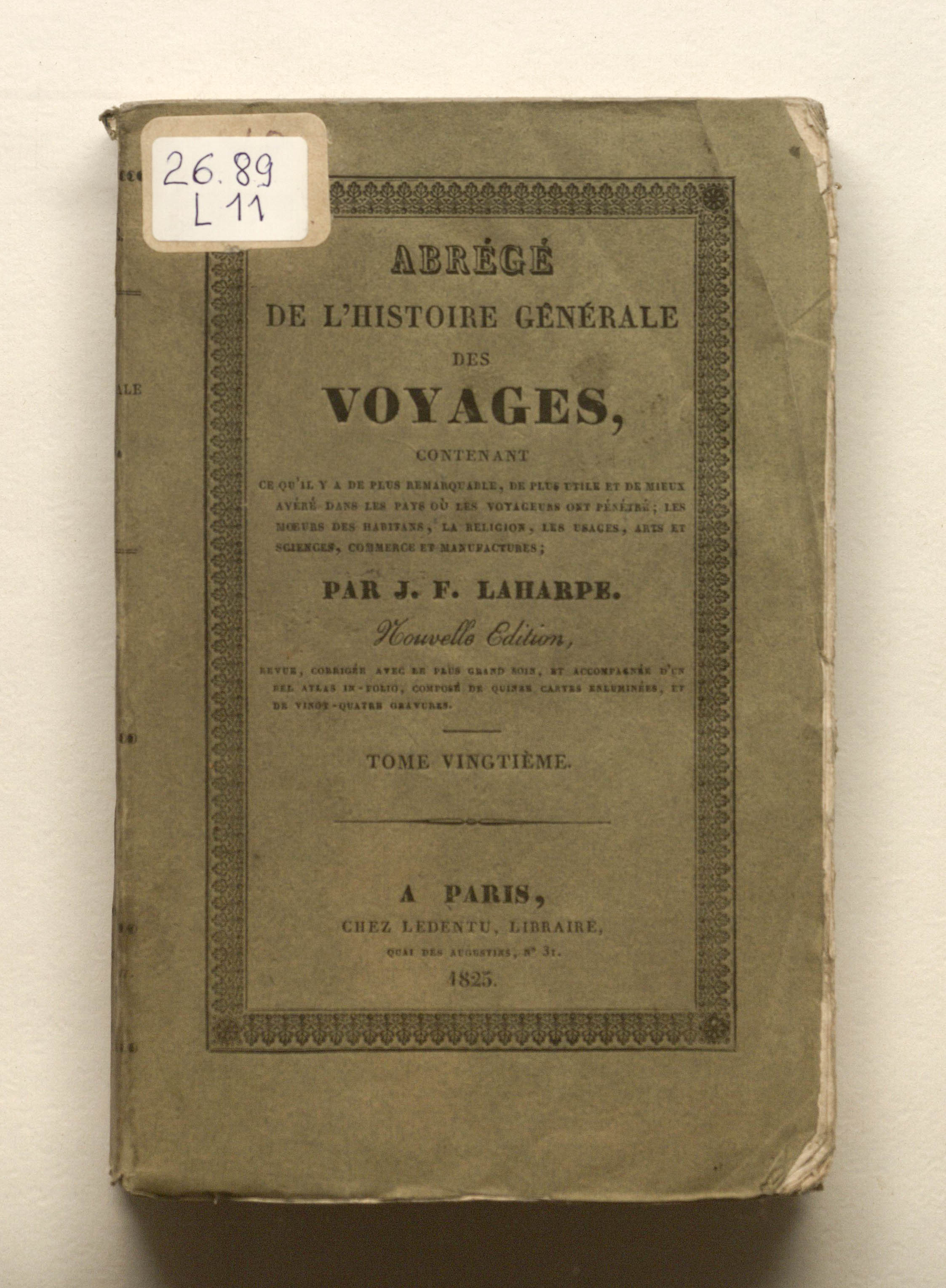 La Harpe, Jean Francois de (1739-1803). Abrege de l'histoire generale des voyages, contenant ce qu'il y a de plus remarquable, de plus utile et de mieux avere dans les pays ou les voyageurs ont penetre ; les moeurs des habitans, la religion, les usages, arts et sciences, commerce, manufactures. Par M. de La Harpe. Nouvelle edition. Tome vingtieme. - T. 20 (En 24). - Nouv. ed. - Paris : Ledentu, 1825. - 429, [1] p. : grav. front. ; 13,5х21cm.
