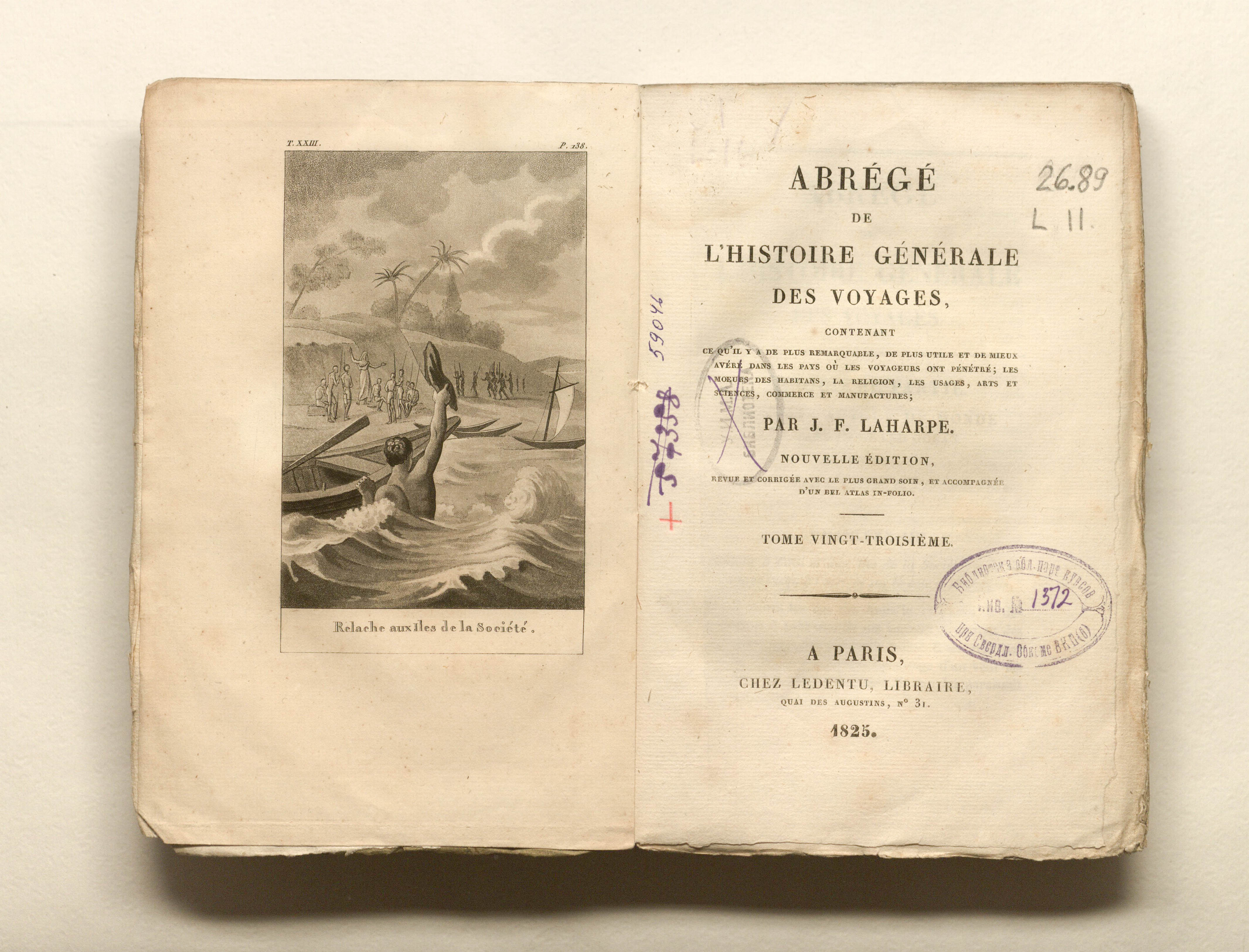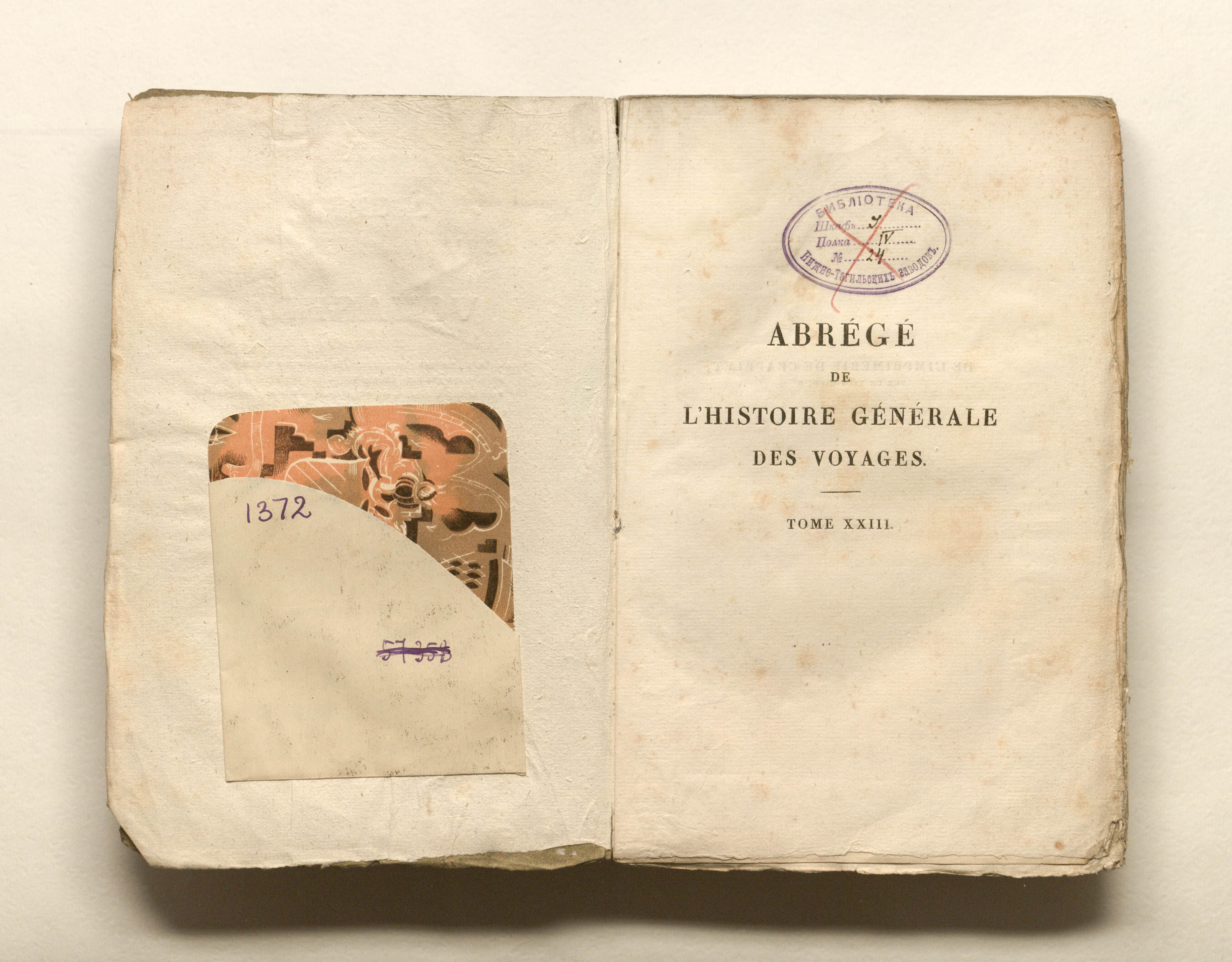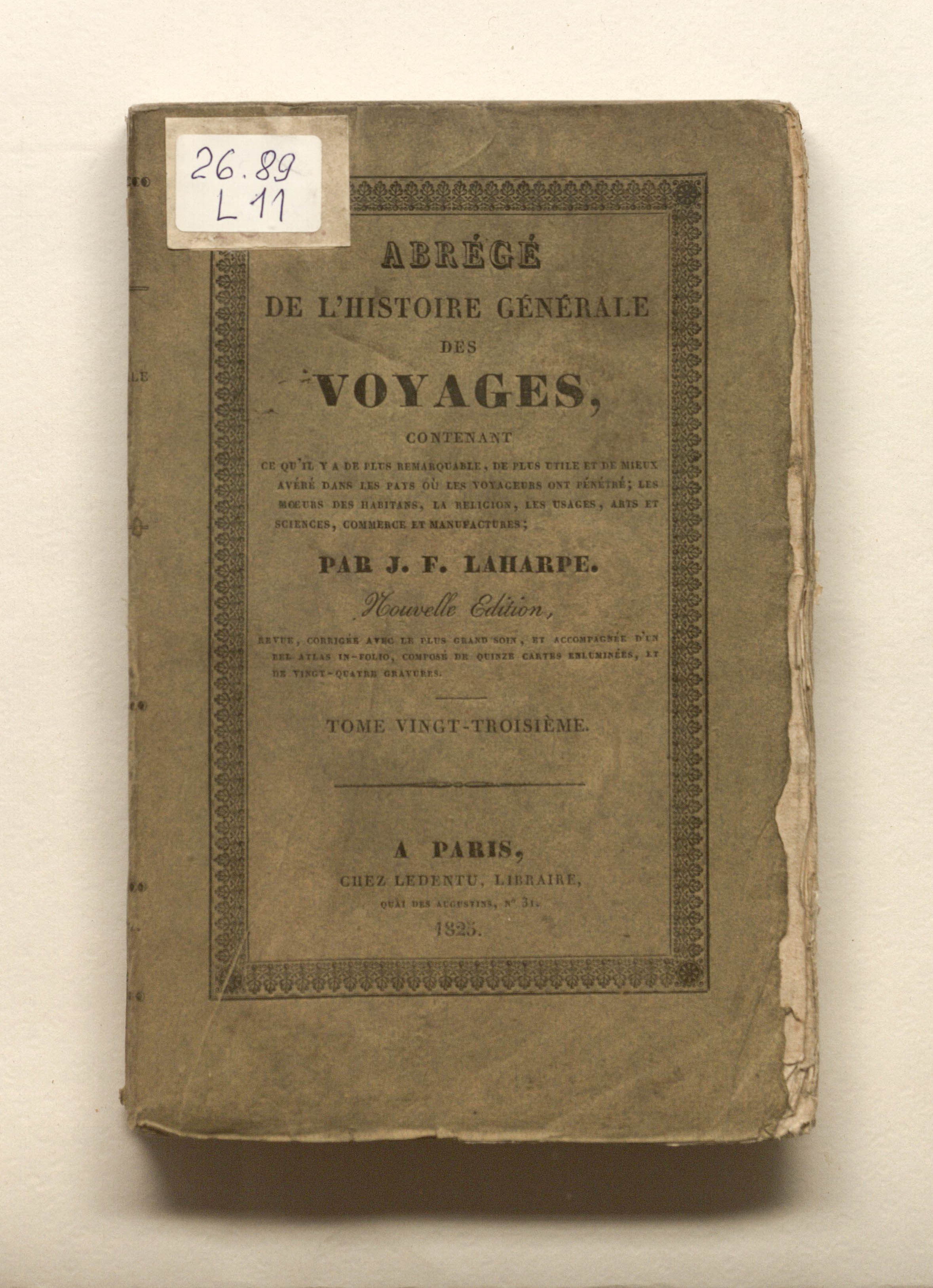 Лагарп Жан Франсуа де. Краткая всеобщая история путешествий, содержащая всё самое замечательное, самое полезное и лучше всего проверенное в странах, куда проникли путешественники: нравы жителей, религия, обычаи, искусство и наука, торговля, промышленное производство. Г-на де Лагарпа. Новое издание. Том двадцать третий. - Париж: Ледентю, 1825. - 379, [1] с. : грав. фронт. ; 13,5х21 см.