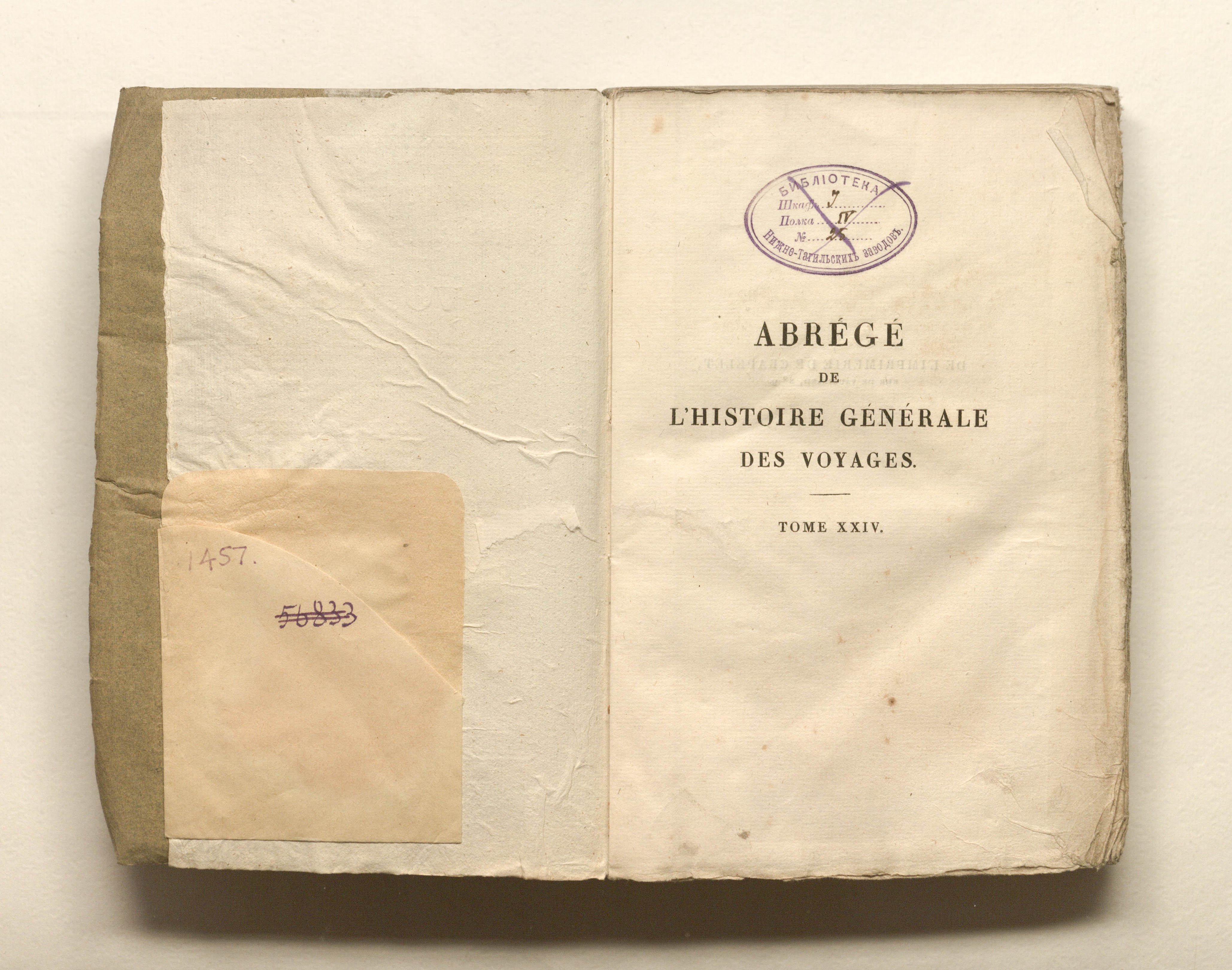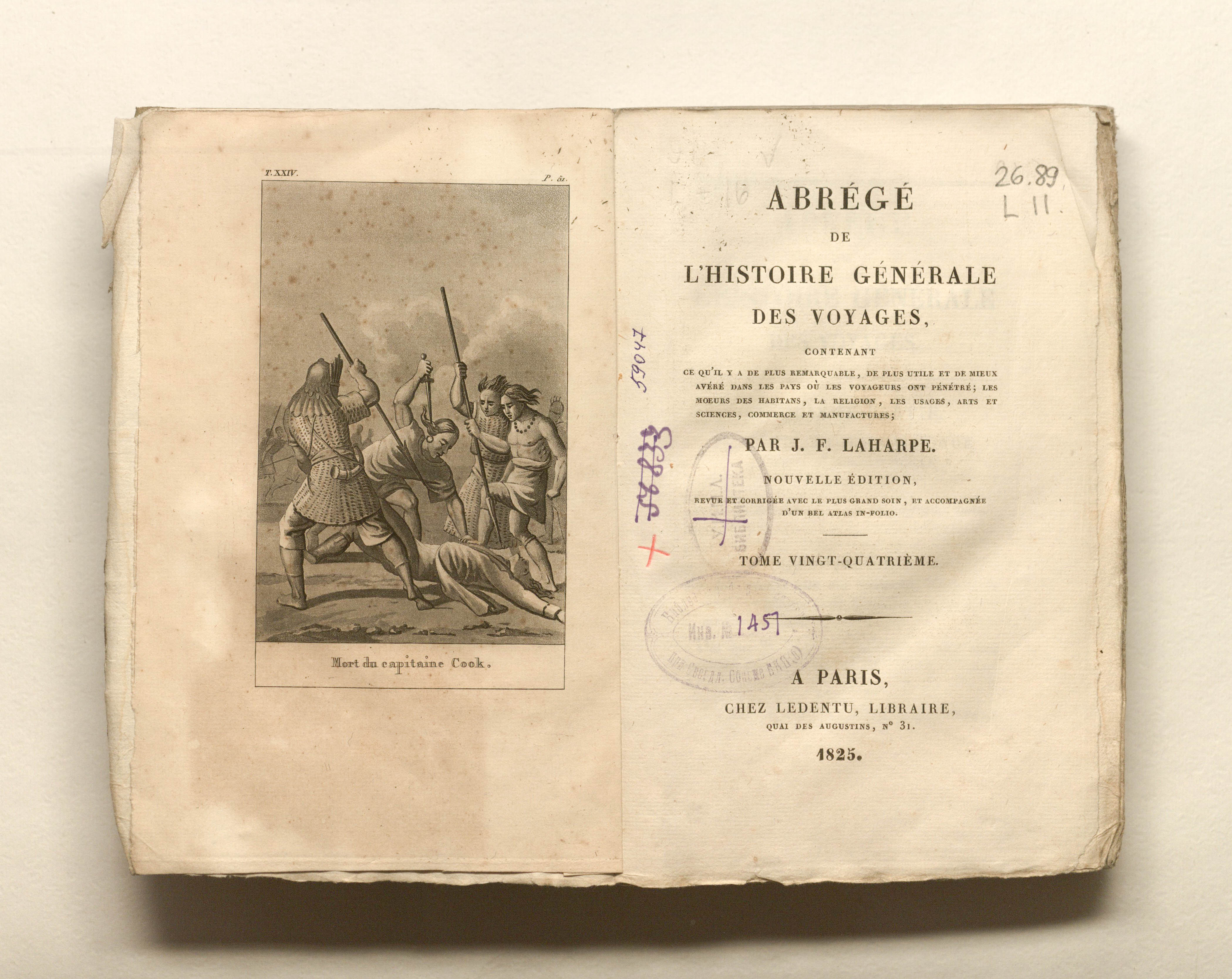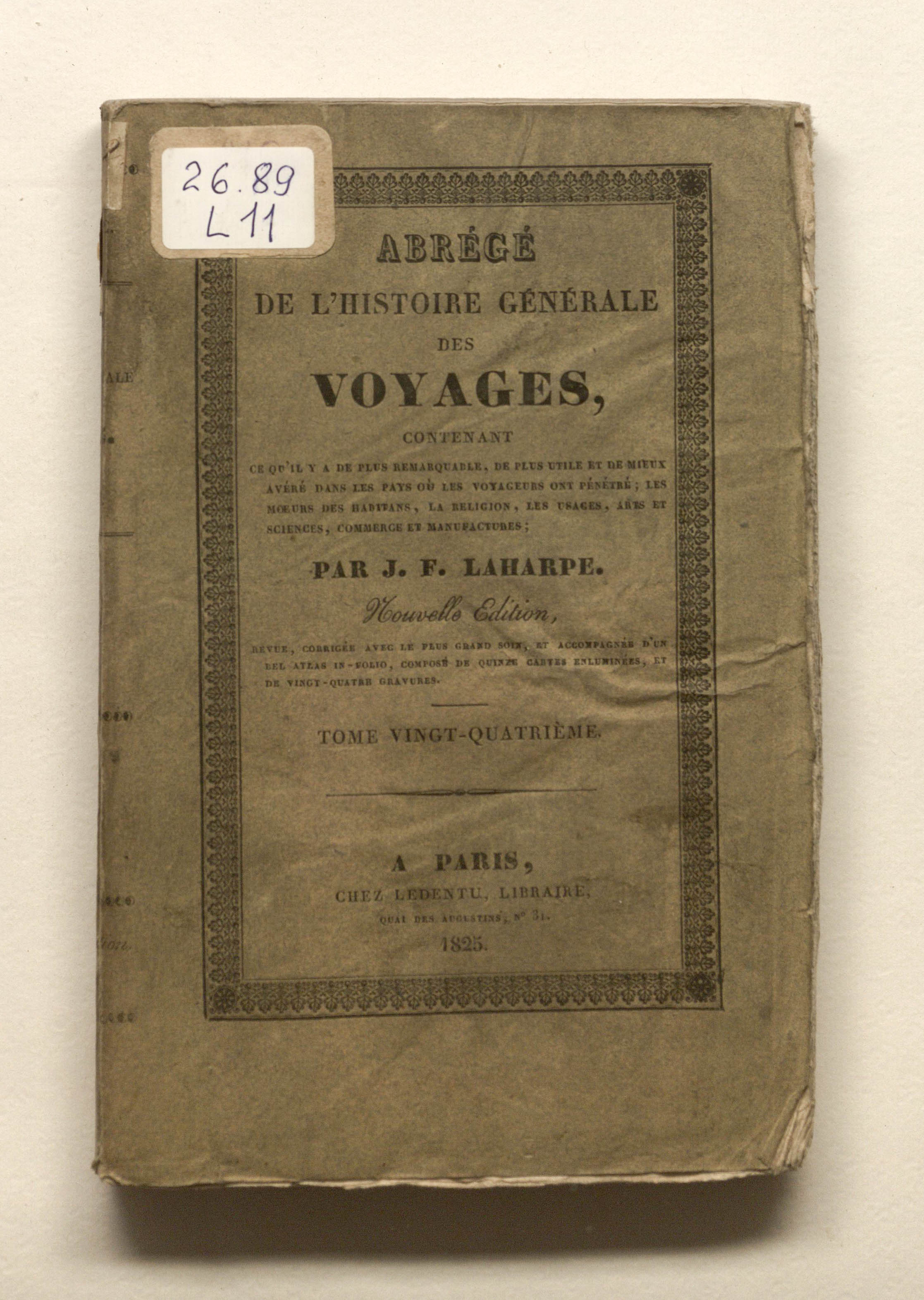 Лагарп Жан Франсуа де. Краткая всеобщая история путешествий, содержащая всё самое замечательное, самое полезное и лучше всего проверенное в странах, куда проникли путешественники: нравы жителей, религия, обычаи, искусство и наука, торговля, промышленное производство. Г-на де Лагарпа. Новое издание. Том двадцать четвертый. - Париж: Ледентю, 1825. - 379, [1] с. : грав. фронт. ; 13,5х21 см.