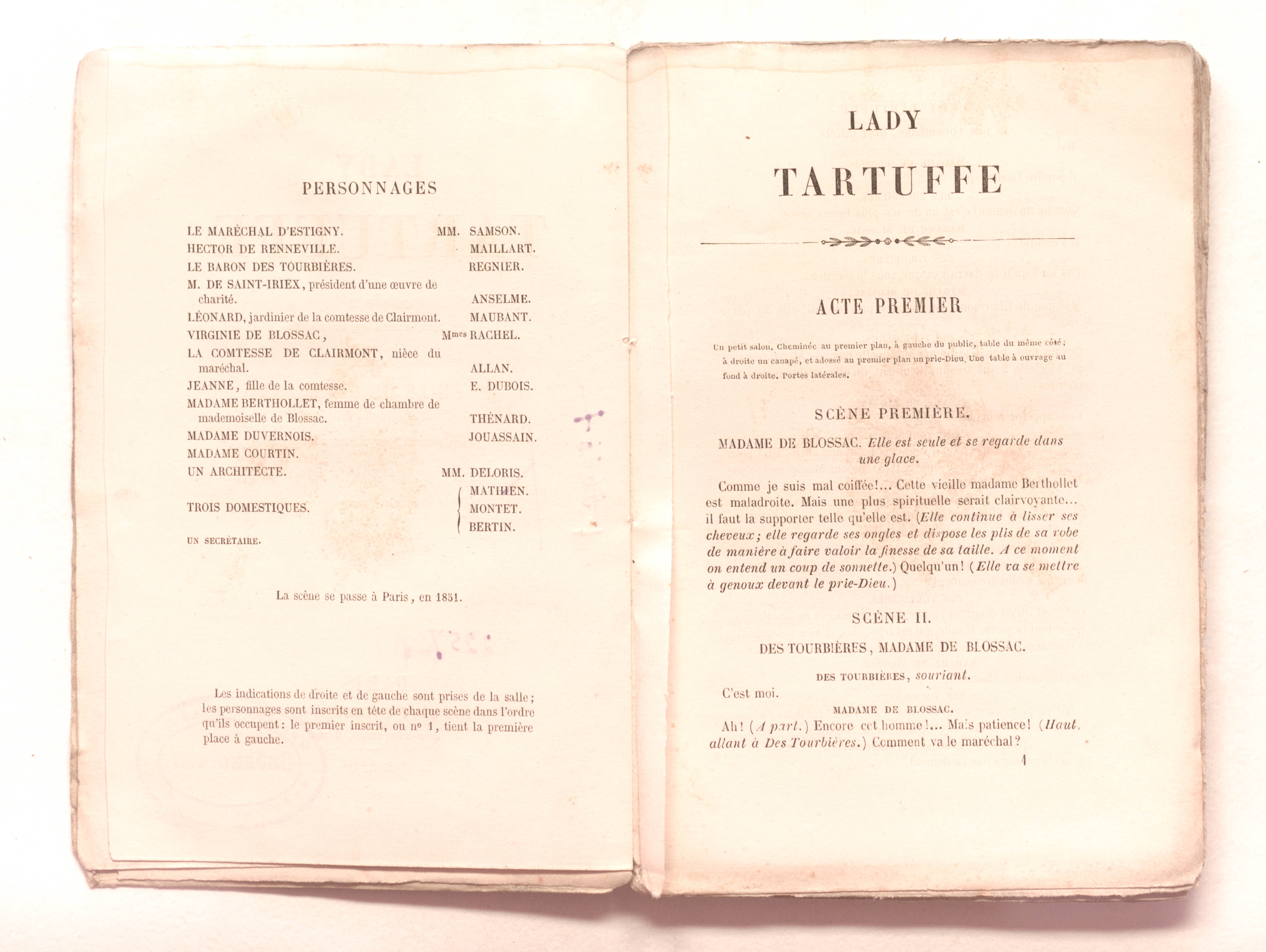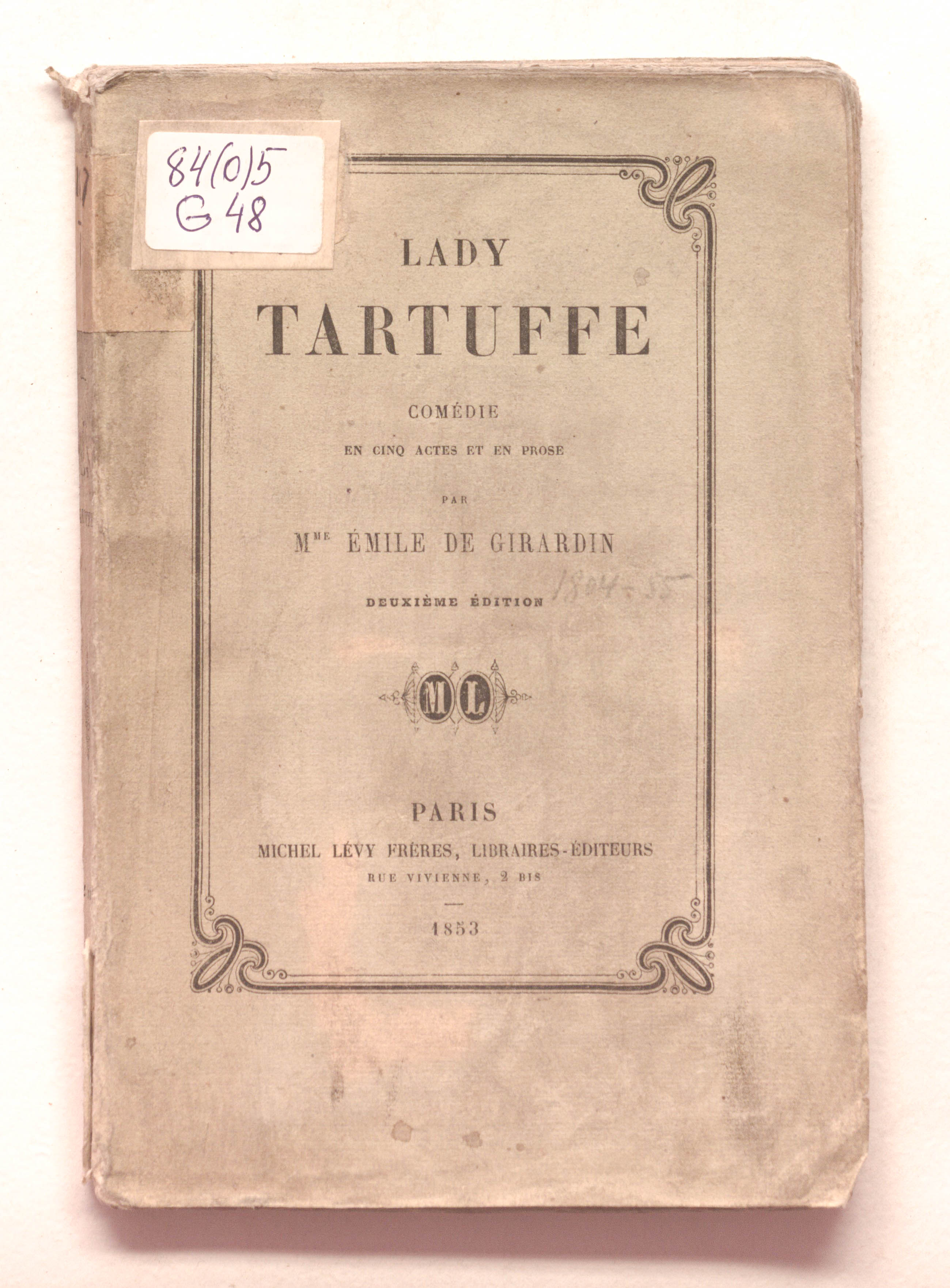 Lady Tartuffe. Comedie en cinq actes et en prose, par Mme Emile de Girardin. [Paris, Comedie Francaise, 10 fevrier 1853]. – 2e ed. – Paris : Michel Levy freres, 1853. – 119 p. ; 13x19 cm.