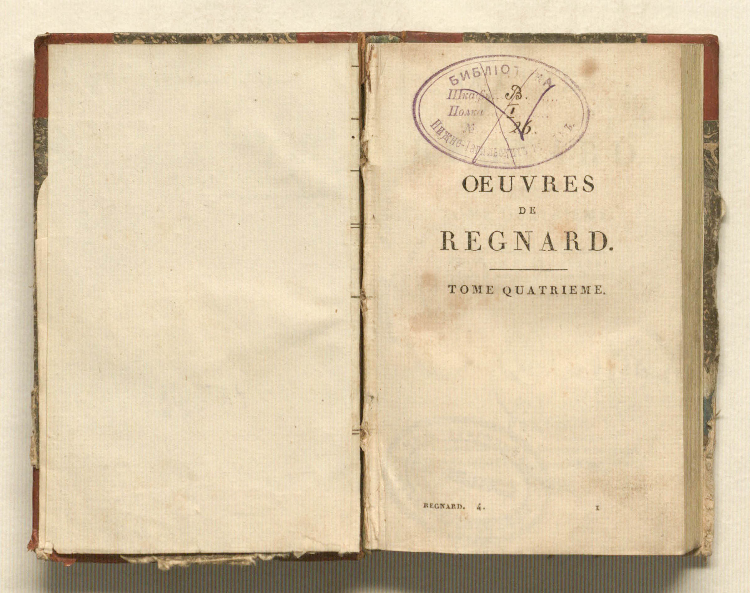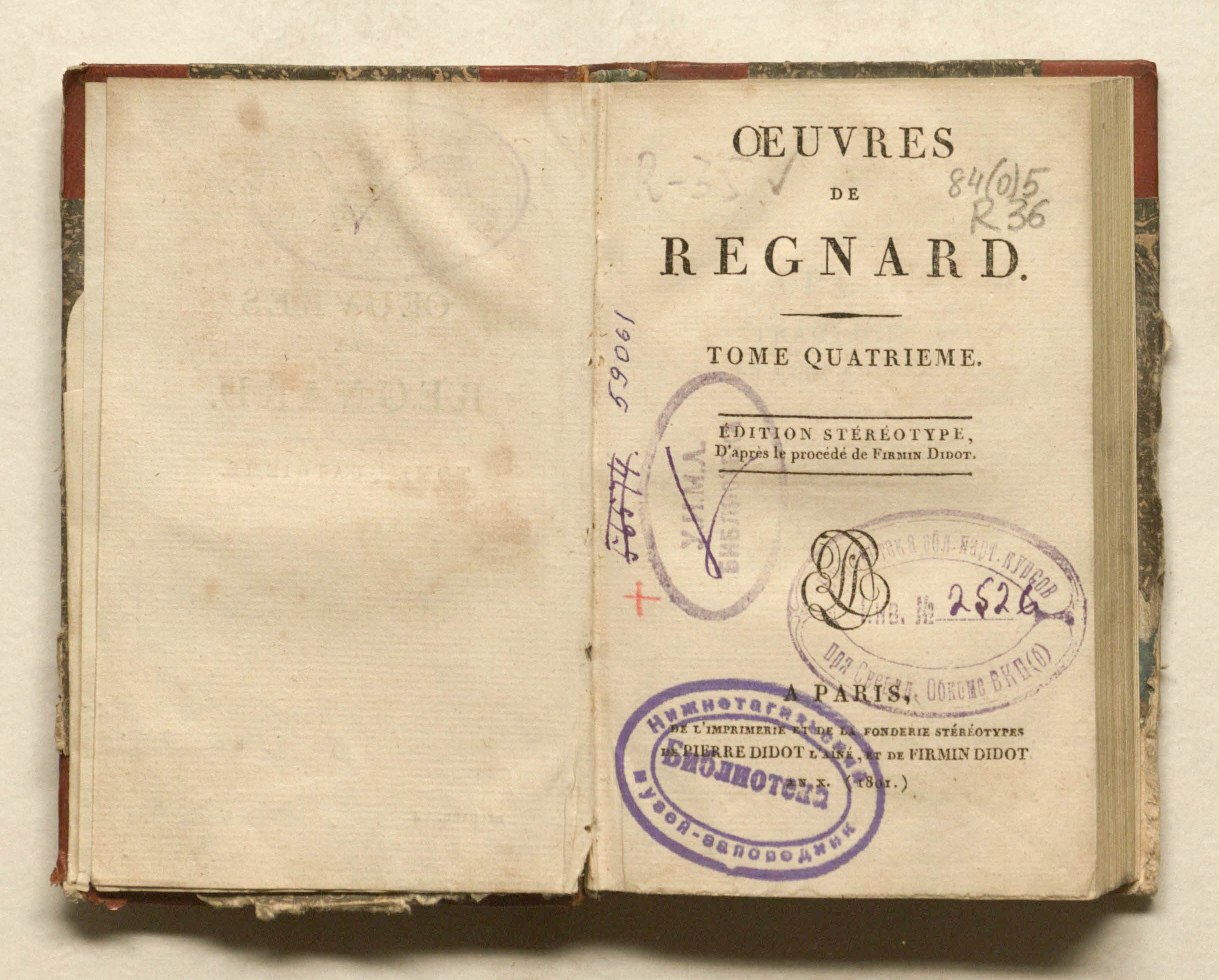 Сочинения Реньяра. Стереотипное издание. – 5 т. – Т. 4. – Париж : П. Дидо старший; Ф. Дидо, Год X (1801). – 265 с.; 9х14 см.