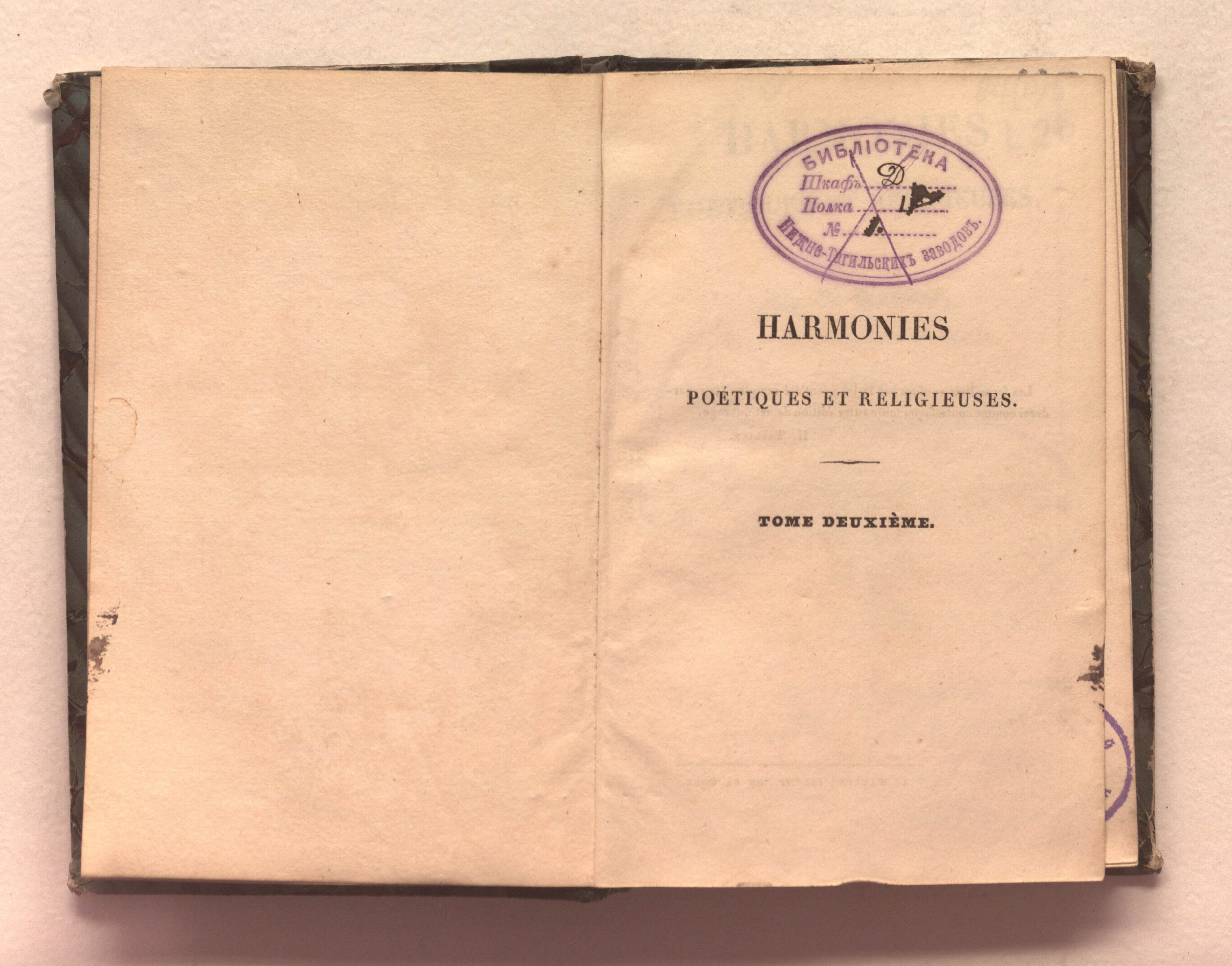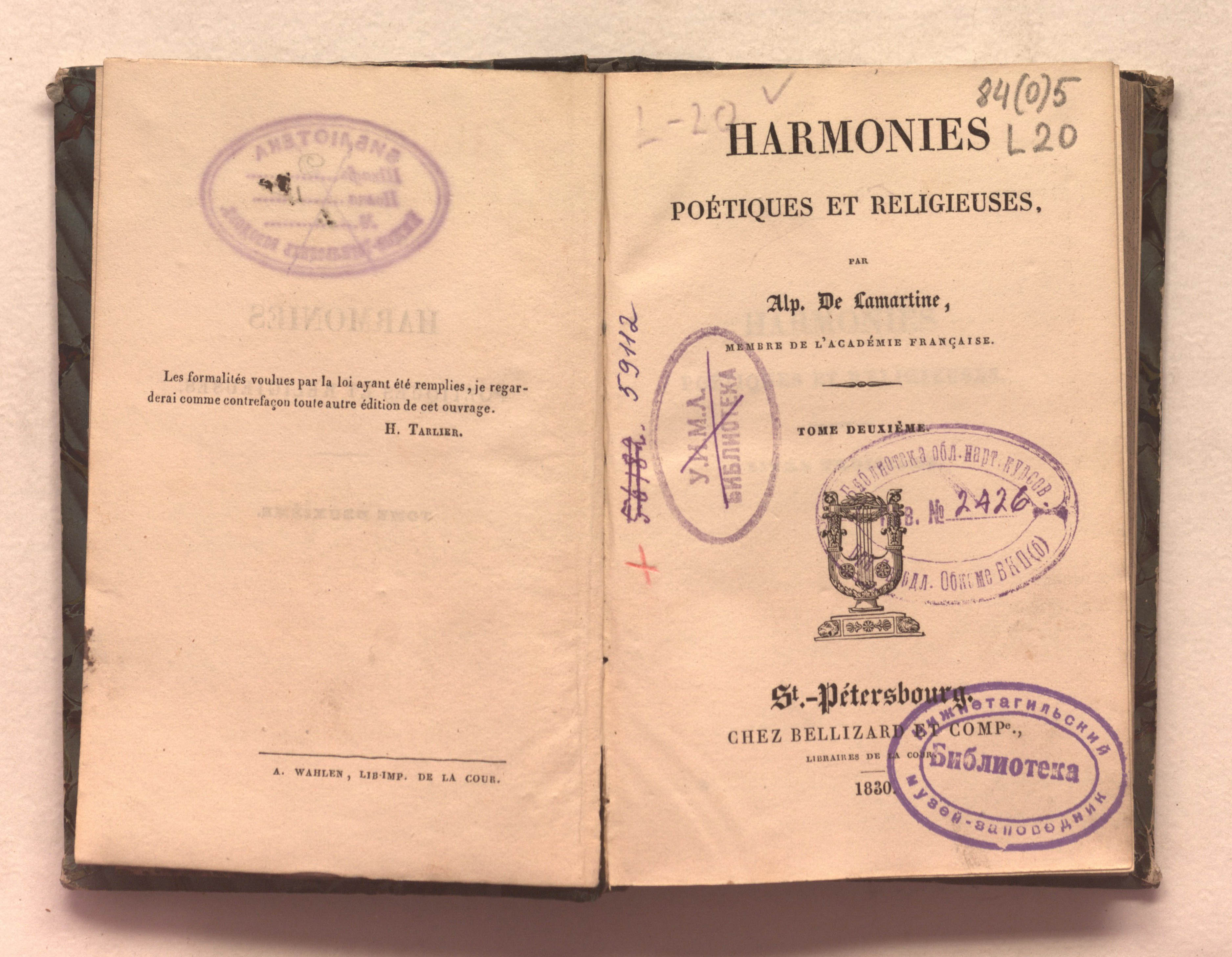 Harmonies poetiques et religieuses, par Alf. de Lamartine, ... – 2 t. - T. 2. - Saint-Petersbourg : Bellizard et Comp., 1830. - 272 p.; 11x15,5 cm.