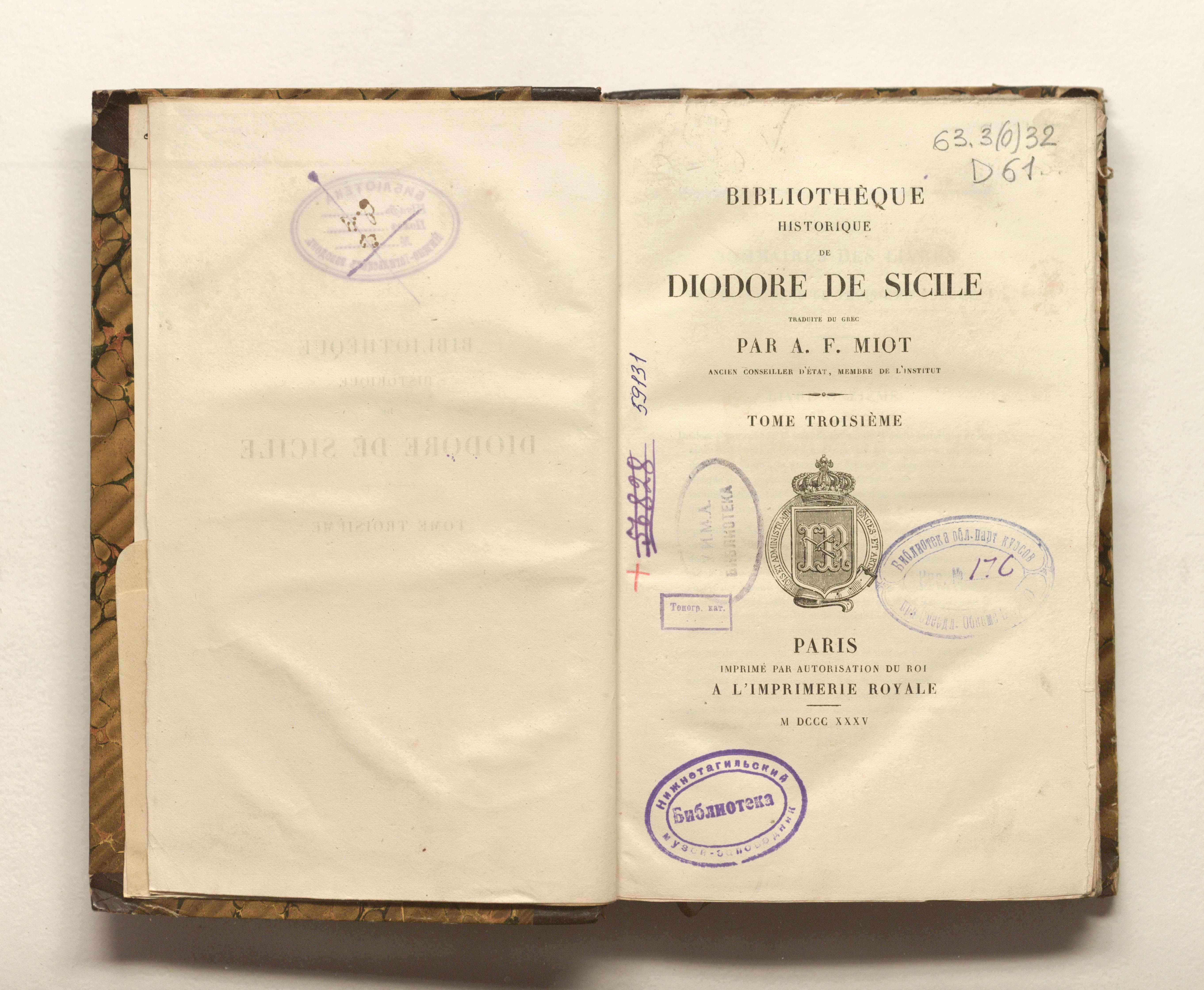 Диодор Сицилийский. Историческая библиотека Диодора Сицилийского, перевод с греческого А.-Ф. Мио...- Т. 3 [Из 7-ми]. -Париж : Королевская типография, 1835. - XXXV, 439, [1] с. ; 14х22,5 см.