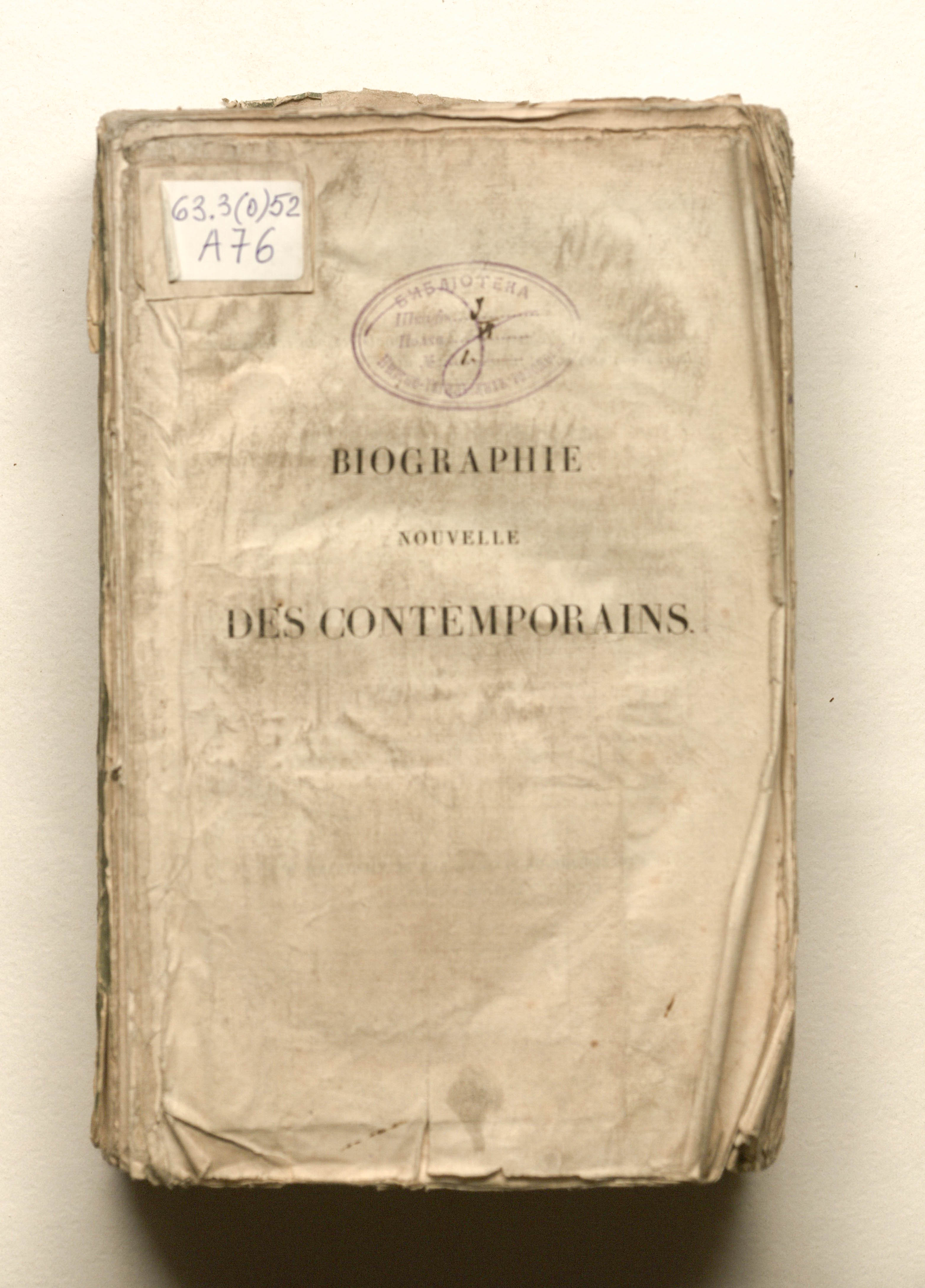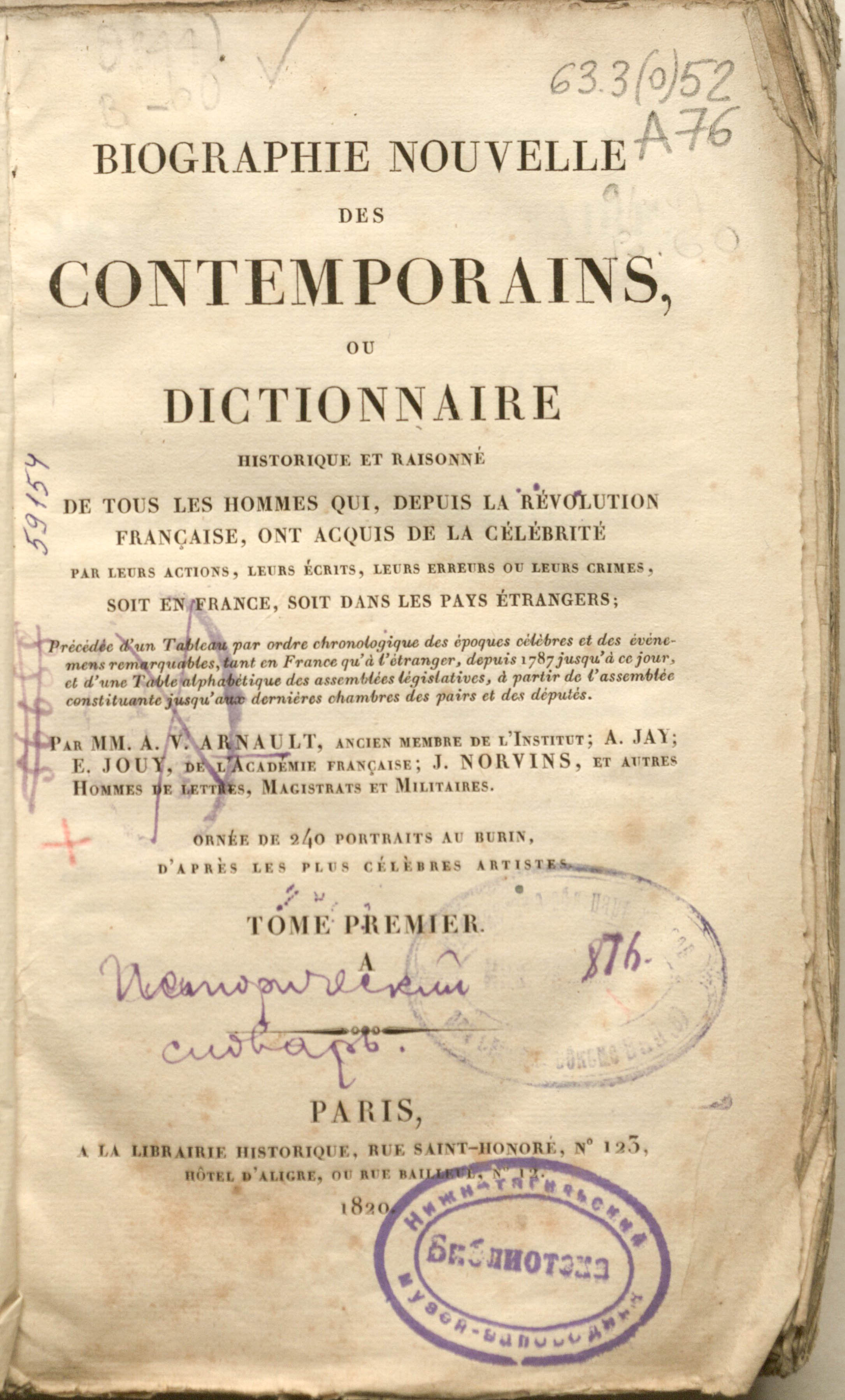 Biographie nouvelle des contemporains, ou Dictionnaire historique et raisonne de tous les hommes qui, depuis la Revolution Francaise, ont acquis de la celebrite par leur actions, leurs ecrits, leurs erreurs ou leurs crimes, soit en France, soit dans les pays etrangers ; precedee d'un tableau par ordre chronologique des epoques celebres et des evenemens remarquables, tant en France qu'a l'etranger, depuis 1787 jusqu'a ce jour, et d'une table alphabetique des assemblees legislatives, a partir de l'assemblee constituante jusqu'aux dernieres chambres des pairs et des deputes. Ornee de 240 portraits au burin, d'apres les plus celebres artiste. Tome premier. - Paris : Librairie Historique, 1820. - CLXXXIV, 346 p.; 14х22 cm.