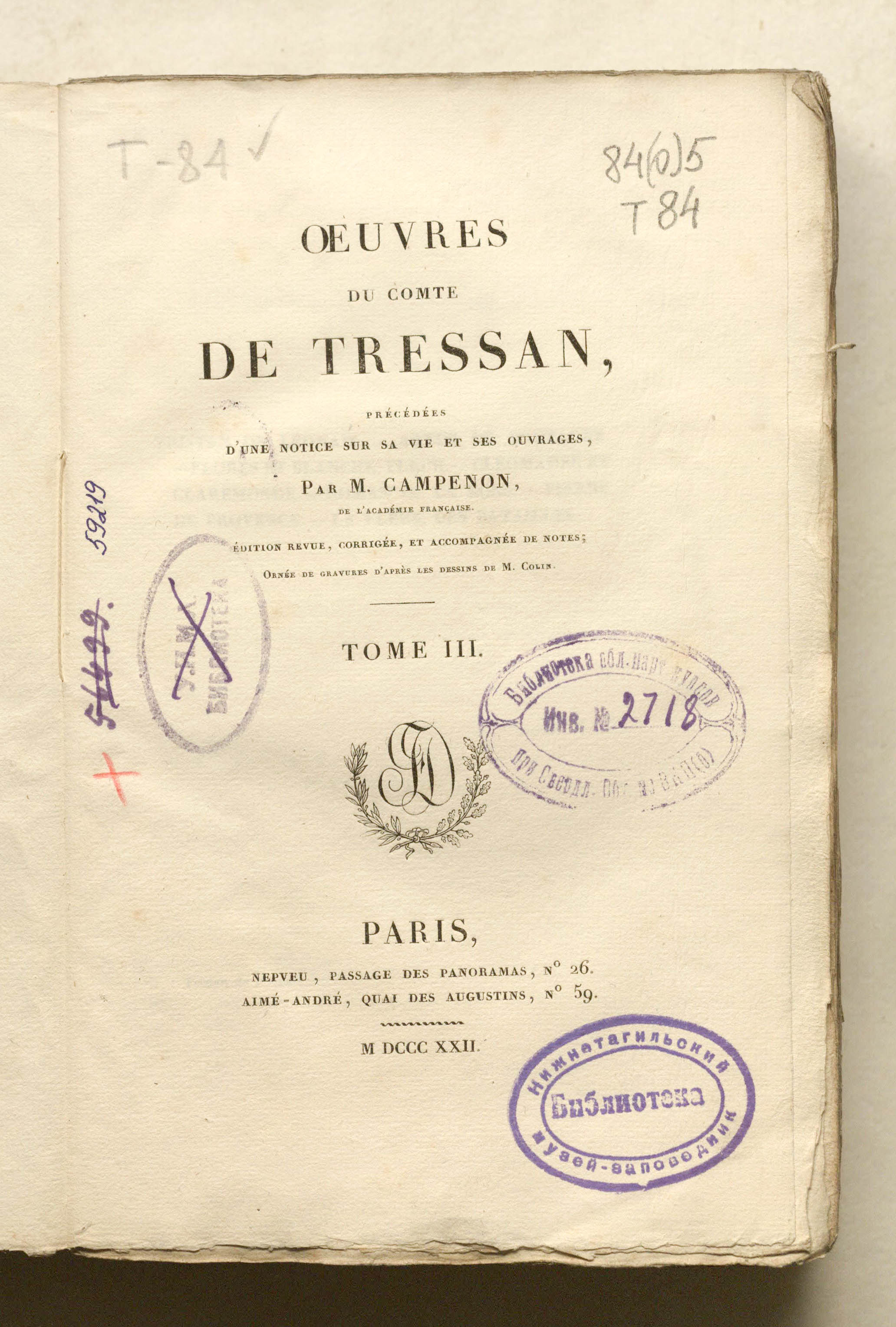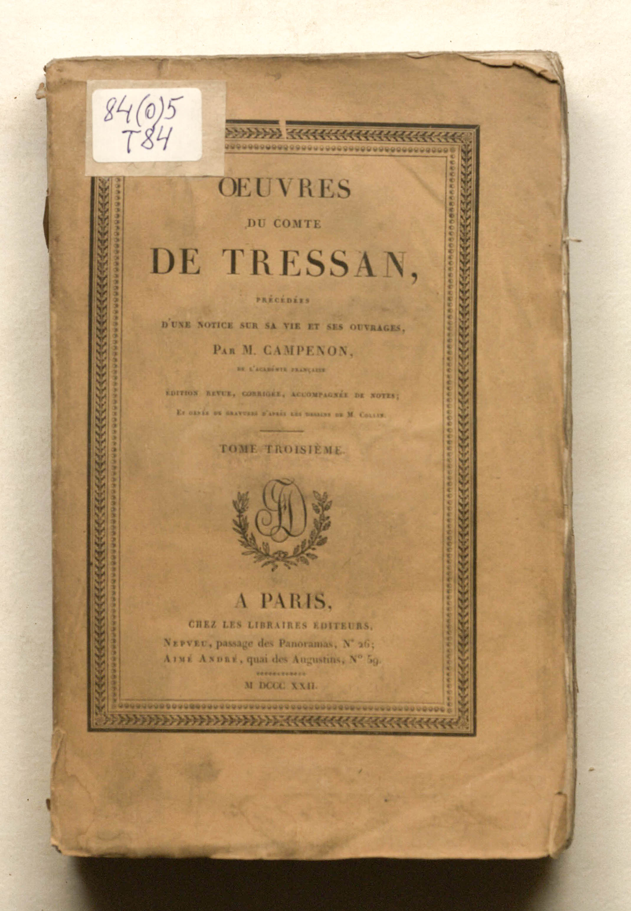 Сочинения графа Трессана, предварённые запиской о его жизни и творчестве, написанной М. Кампеноном, членом Французской академии. Переработанное, исправленное издание с примечаниями, украшенное гравюрами по рисункам М. Колена. – 10 т. – Т. 3. – Париж : Непвё; Эме-Андре, 1822. – 504 с. ; 14х22 см.