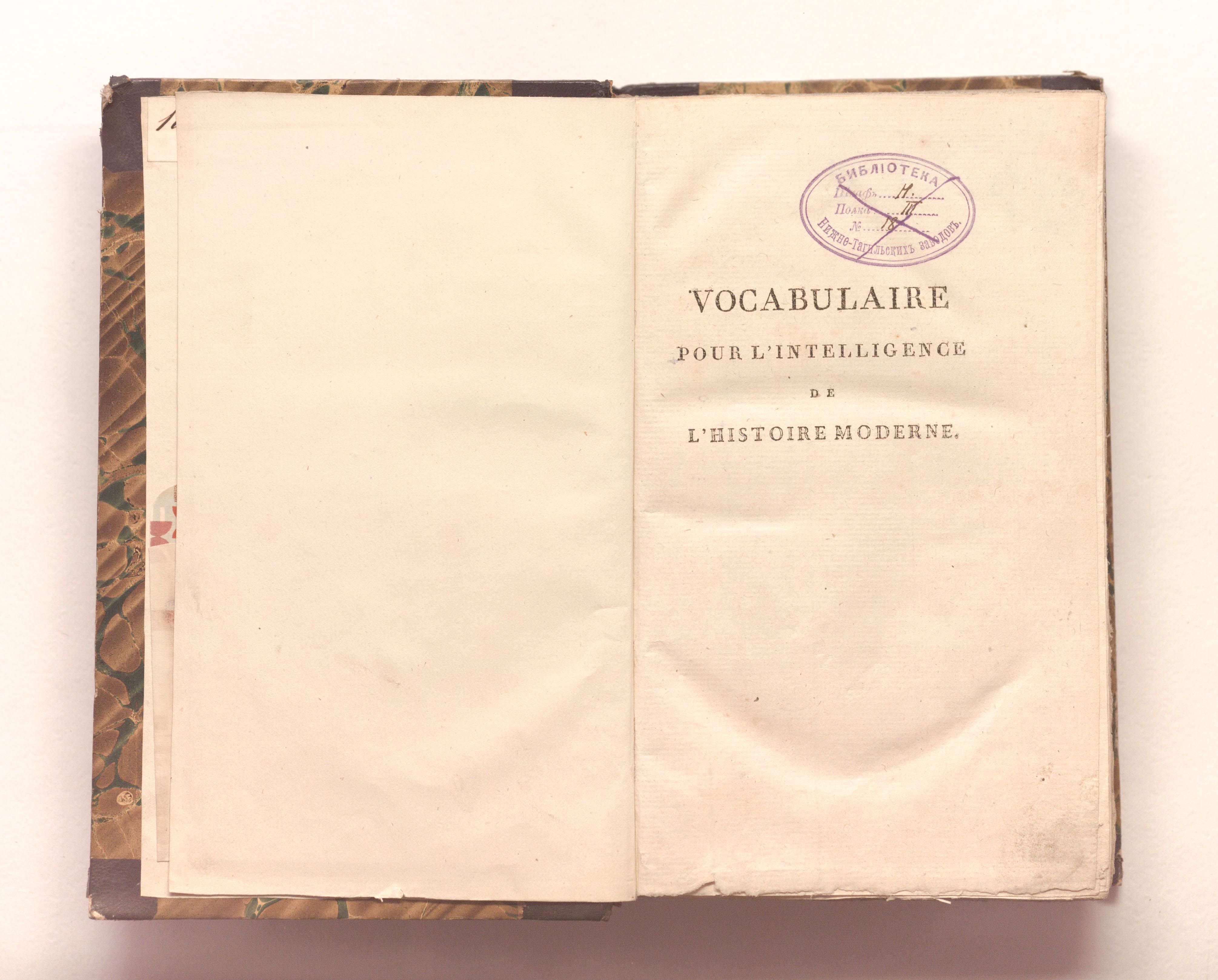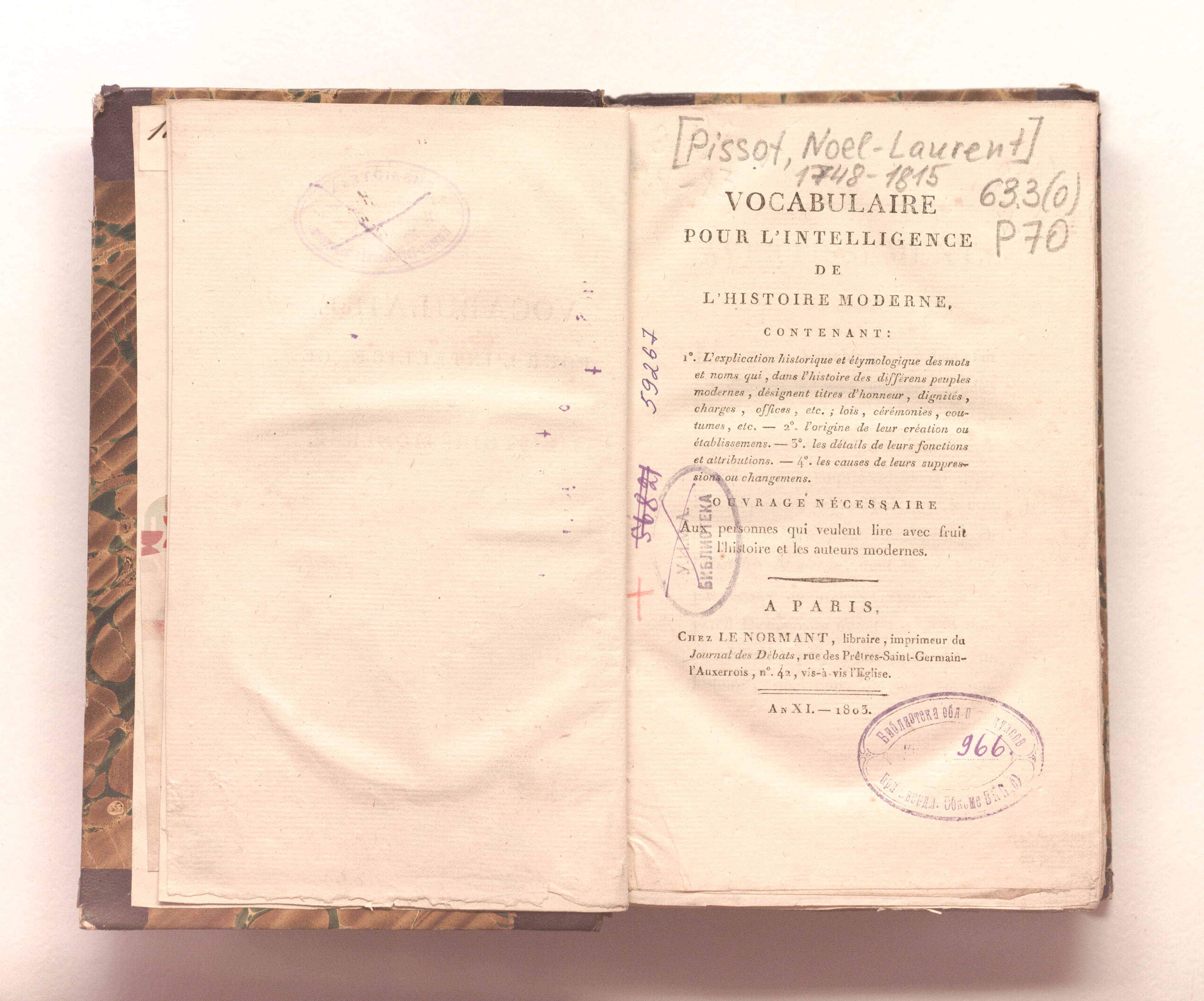 Словарь для понимания новейшей истории, содержащий: 1. Историко-этимологическое объяснение слов и названий, которые в истории разных современных народов обозначают почетные звания, достоинства, должности, и т. д.; законы, обряды, обычаи и т. д. 2. Происхождение их создания или учреждения. 3. Подробную информация об их функциях и полномочиях. 4. Причины их упразднения или изменения. – Париж: Ленорман, Год XI (1803). - IV, 632 с.; 14x22 см.
