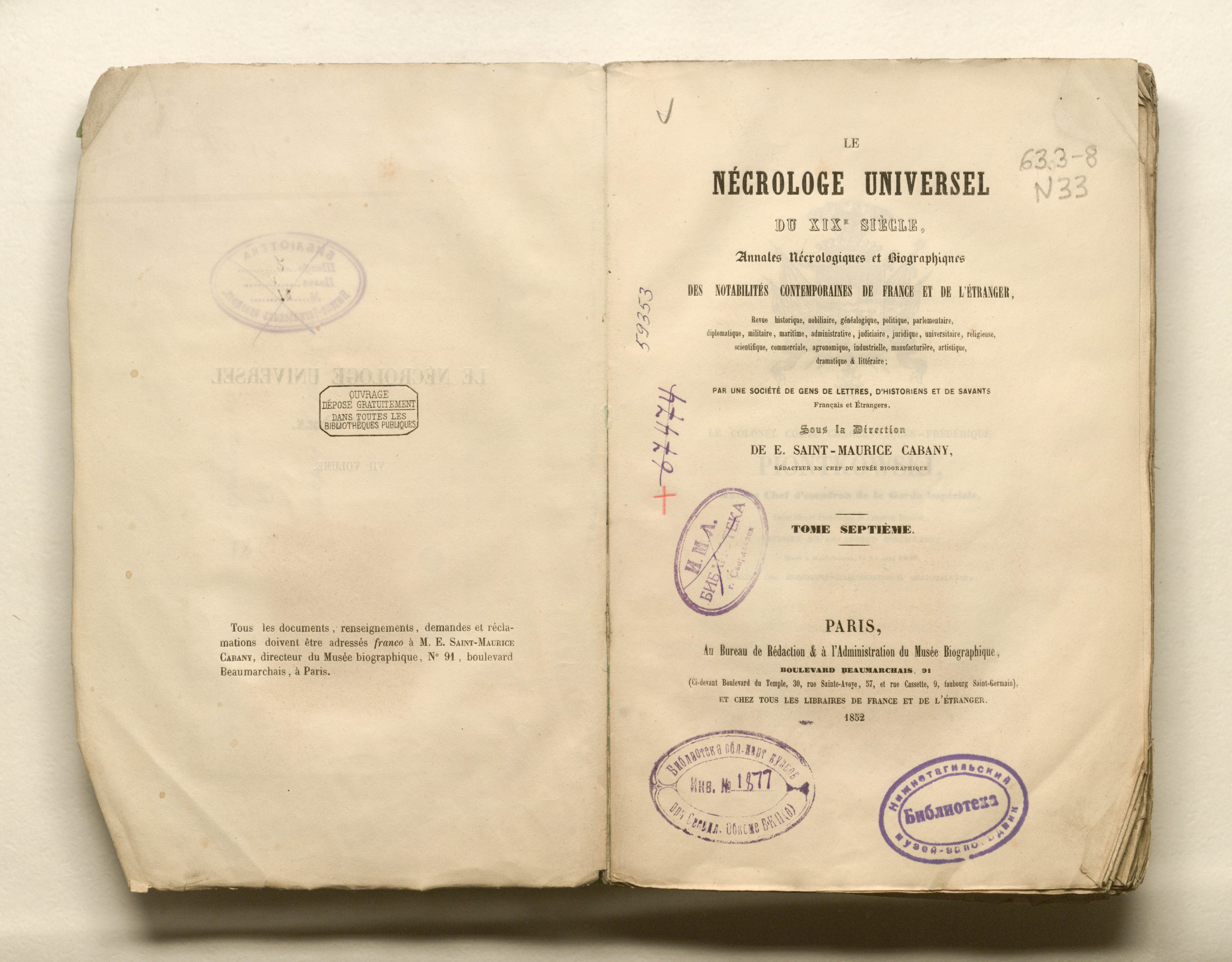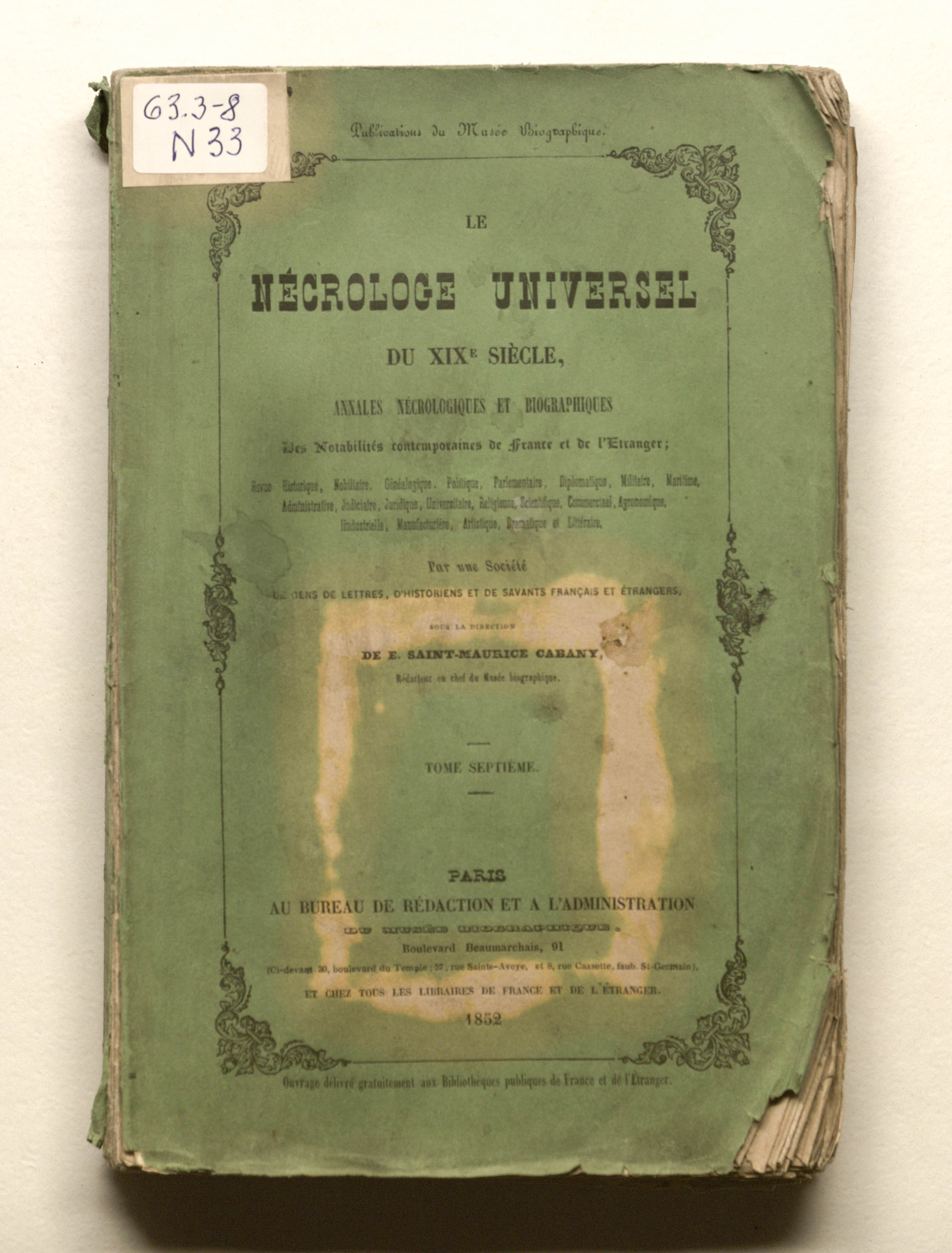 Necrologe universel du XIXe siecle: revue generale necrologique et biographique, historique, nobiliaire, genealogique, politique... Par une societe de gens de lettres, sous la direction de E. de Saint-Maurice Cabany. Tome septieme. - Paris : Bureau de redaction et l'administration du Musee Biographique, 1852. - 226, 218 p. ; 16х24,5 cm.