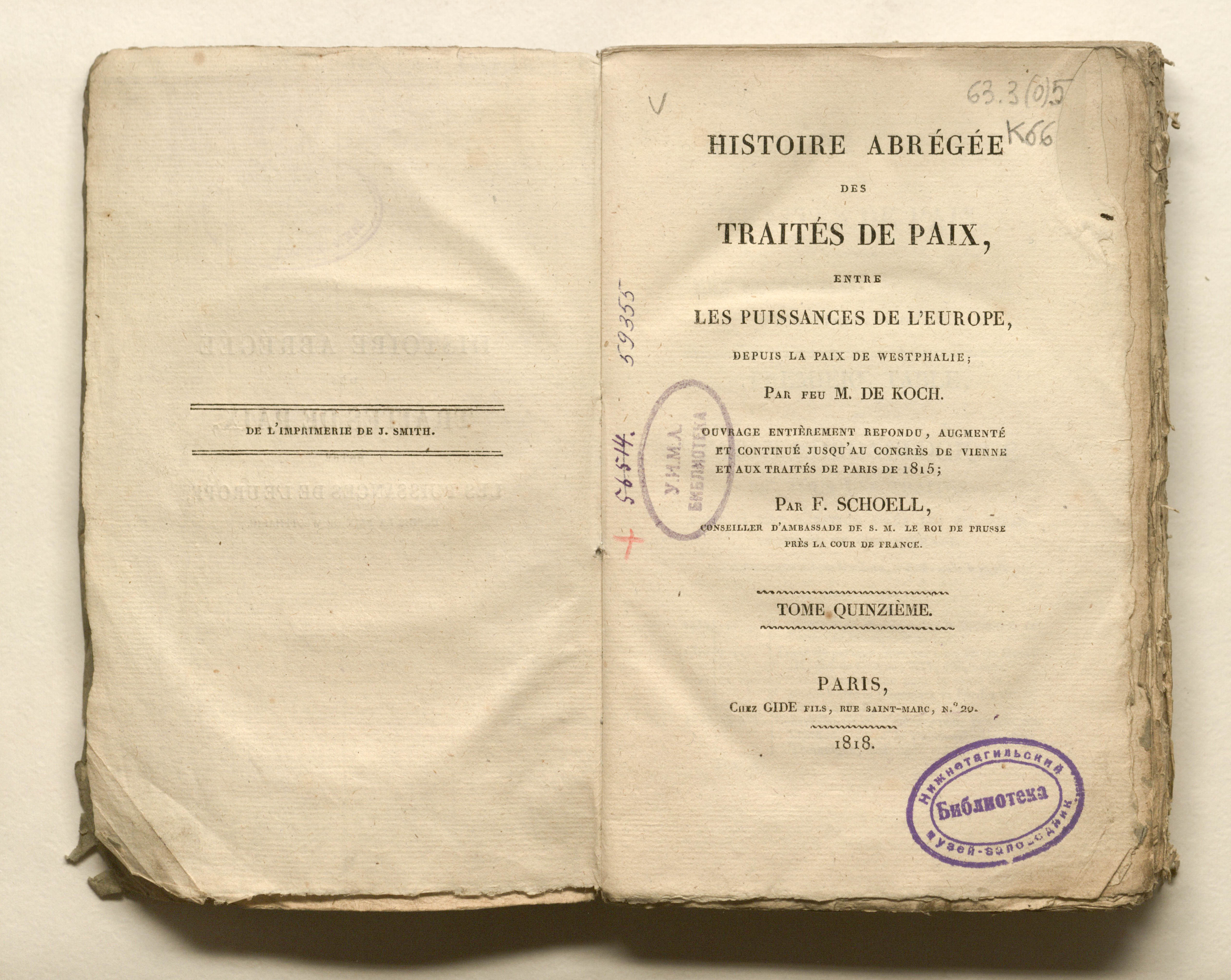 Краткая история мирных договоров между державами Европы, начиная с Вестфальского мира; покойного г-на де Коха. Труд полностью переработан, расширен и продолжен до Венского конгресса и Парижских договоров 1815 года Ф. Шёллем... — Т. 15. – Париж: Жид сын, 1818. — 397 p. ; 14x22 см.