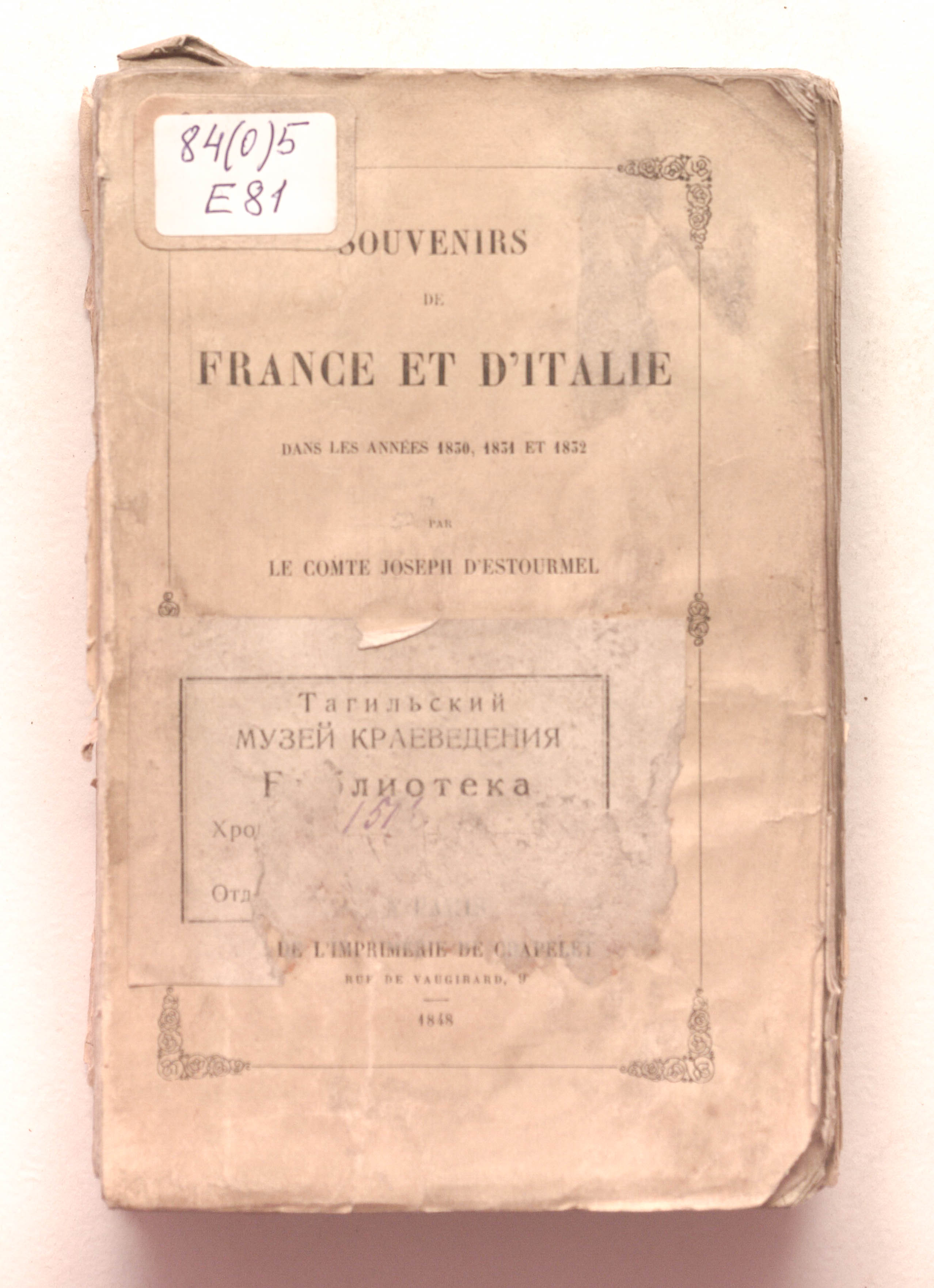 Souvenirs de France et d'Italie dans les annees 1830, 1831 et 1832 par le comte Joseph d'Estourmel. – Paris : Crapelet, 1848. – VII, 556 p. ; 12х18,5 сm.