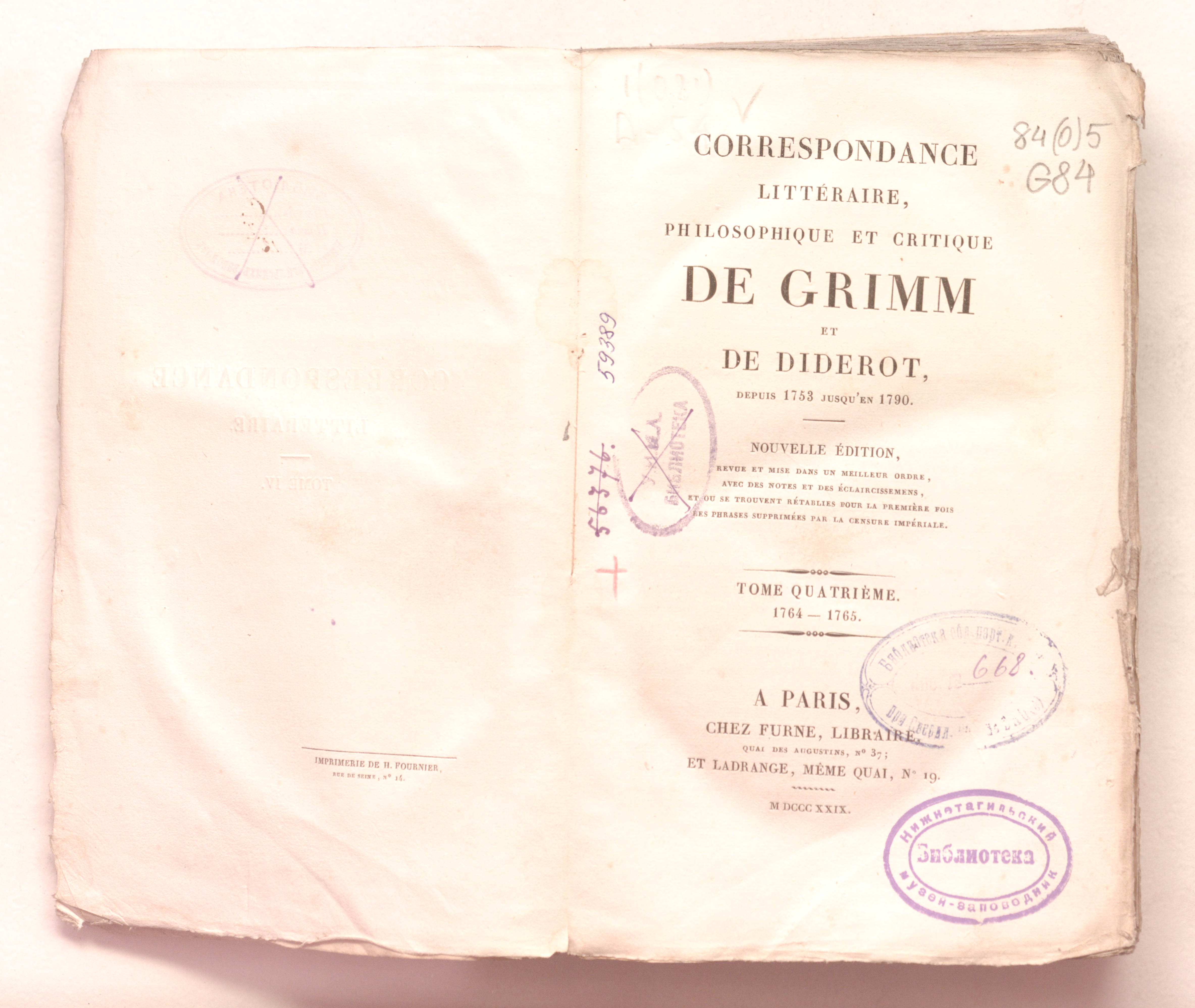 Литературная, философская и критическая переписка Гримма и Дидро с 1753 по 1790 год.  Том четвертый. 1764-1765. – Нов. изд. – 15 т. – Т. 4. – 1764-1765 гг. – Париж : Фюрн; Ладранж, 1829. –  480 с. ; 13х22 см.