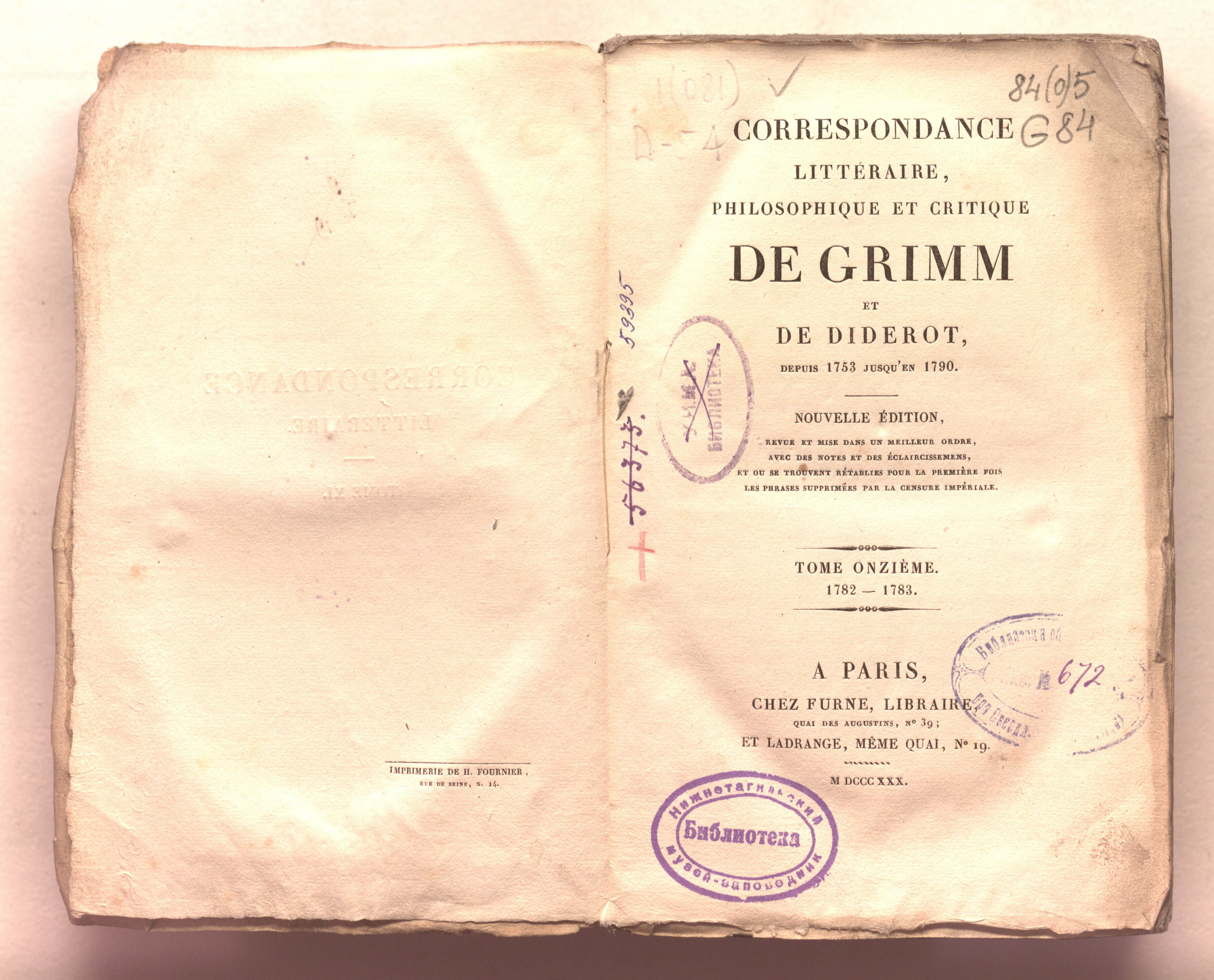 Литературная, философская и критическая переписка Гримма и Дидро с 1753 по 1790 год. Том 11. 1782-1783. – Нов. изд. –15 т. – Т. 11. - Париж : Фюрн; Ладранж, 1830. – 535 с. ; 13х22 см.