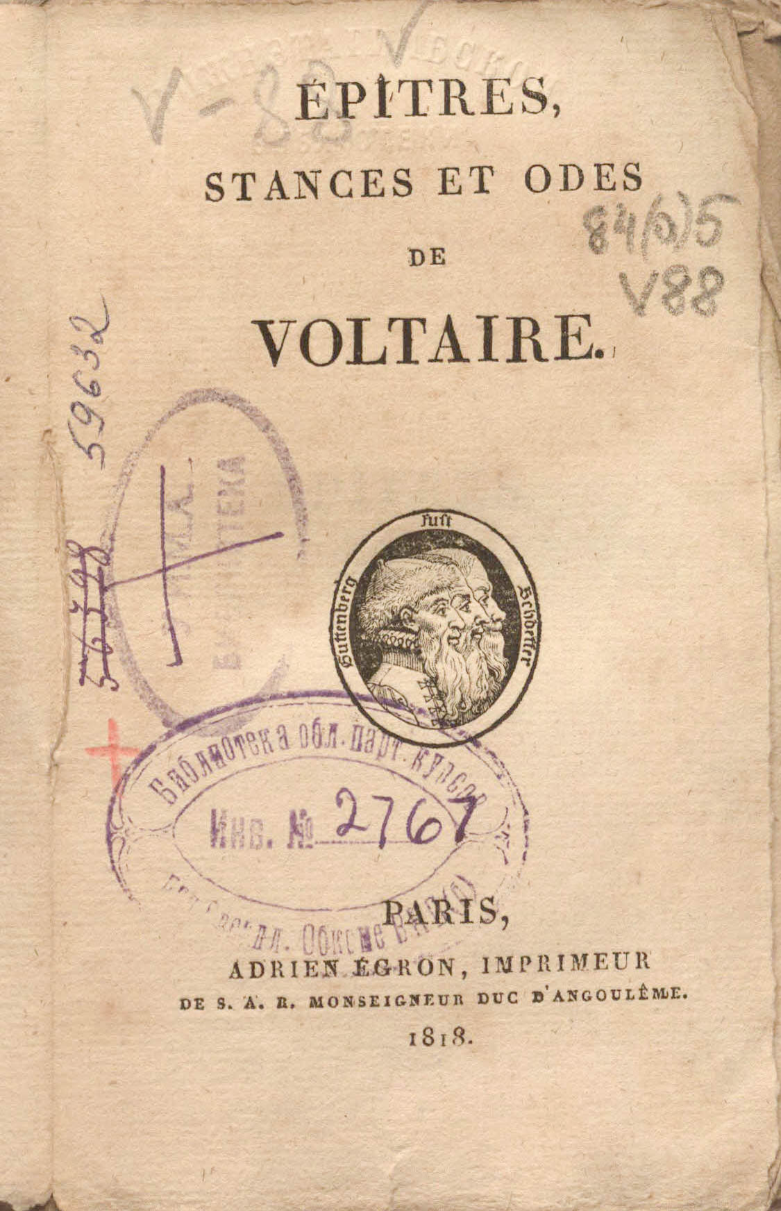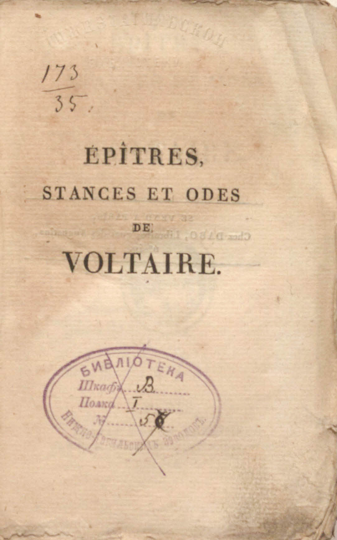 Epitres, stances et odes de Voltaire. – Paris : A. Egron, 1818. – 358, [1] p. ; 9,5x14,5 cm.