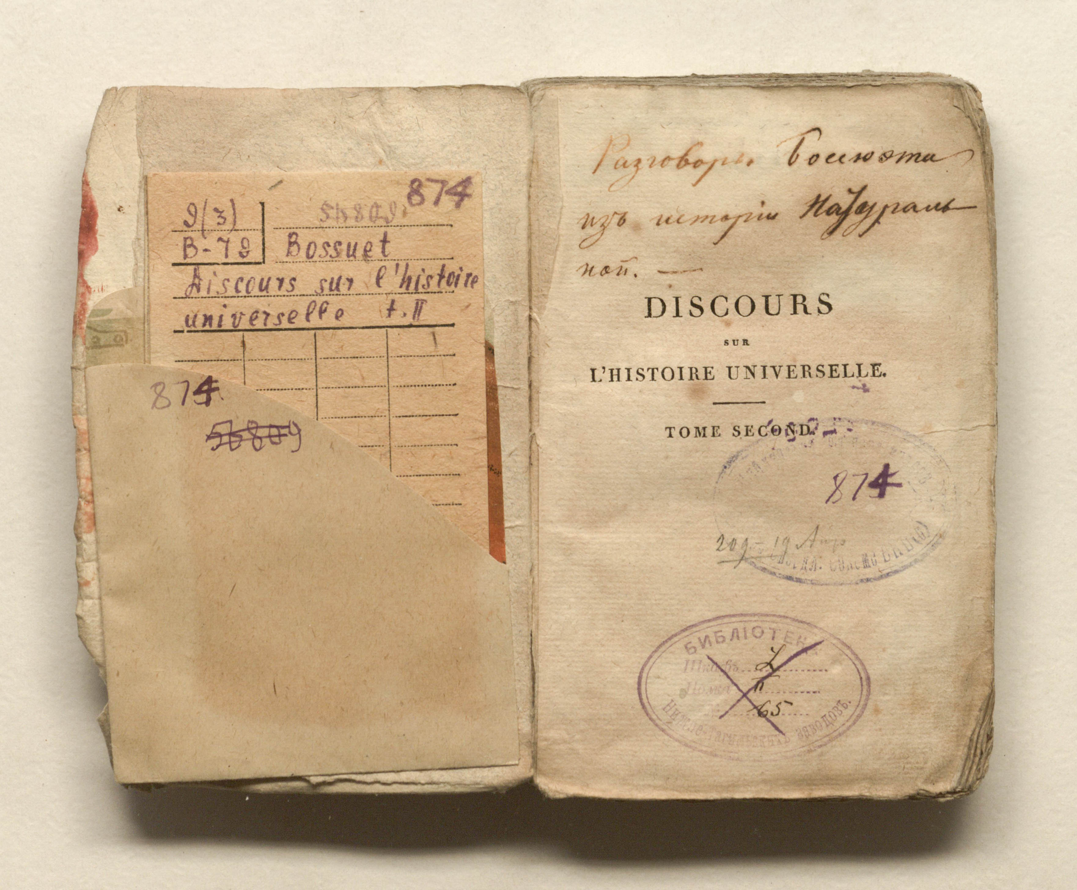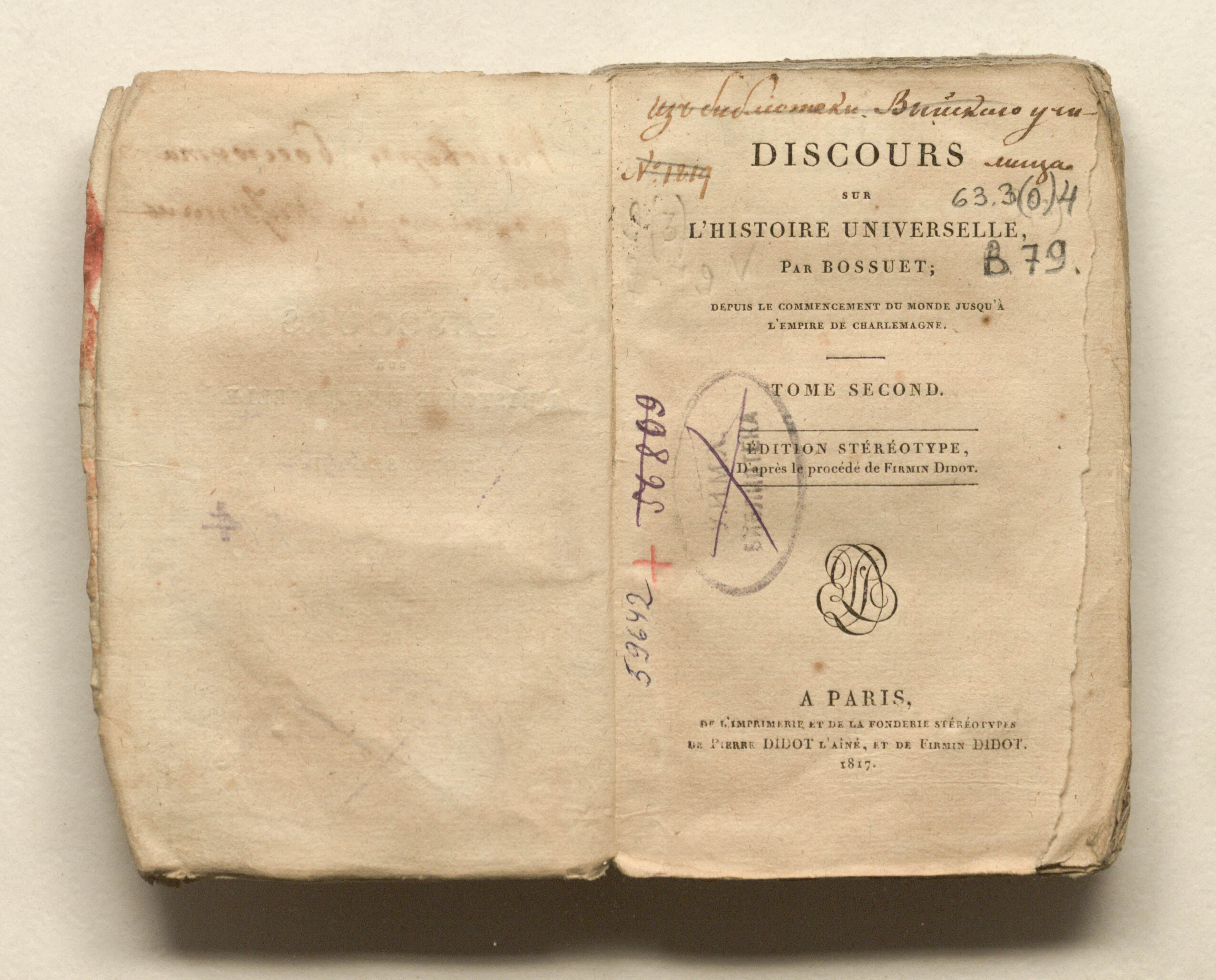Discours sur l'histoire universelle, par Bossuet; encement du monde jusqu'a l'empire de Charlemagne. Tome seconde. Edition stereotype. – Paris : Didot, 1817. – 283 p. ; 9х14,5 см.